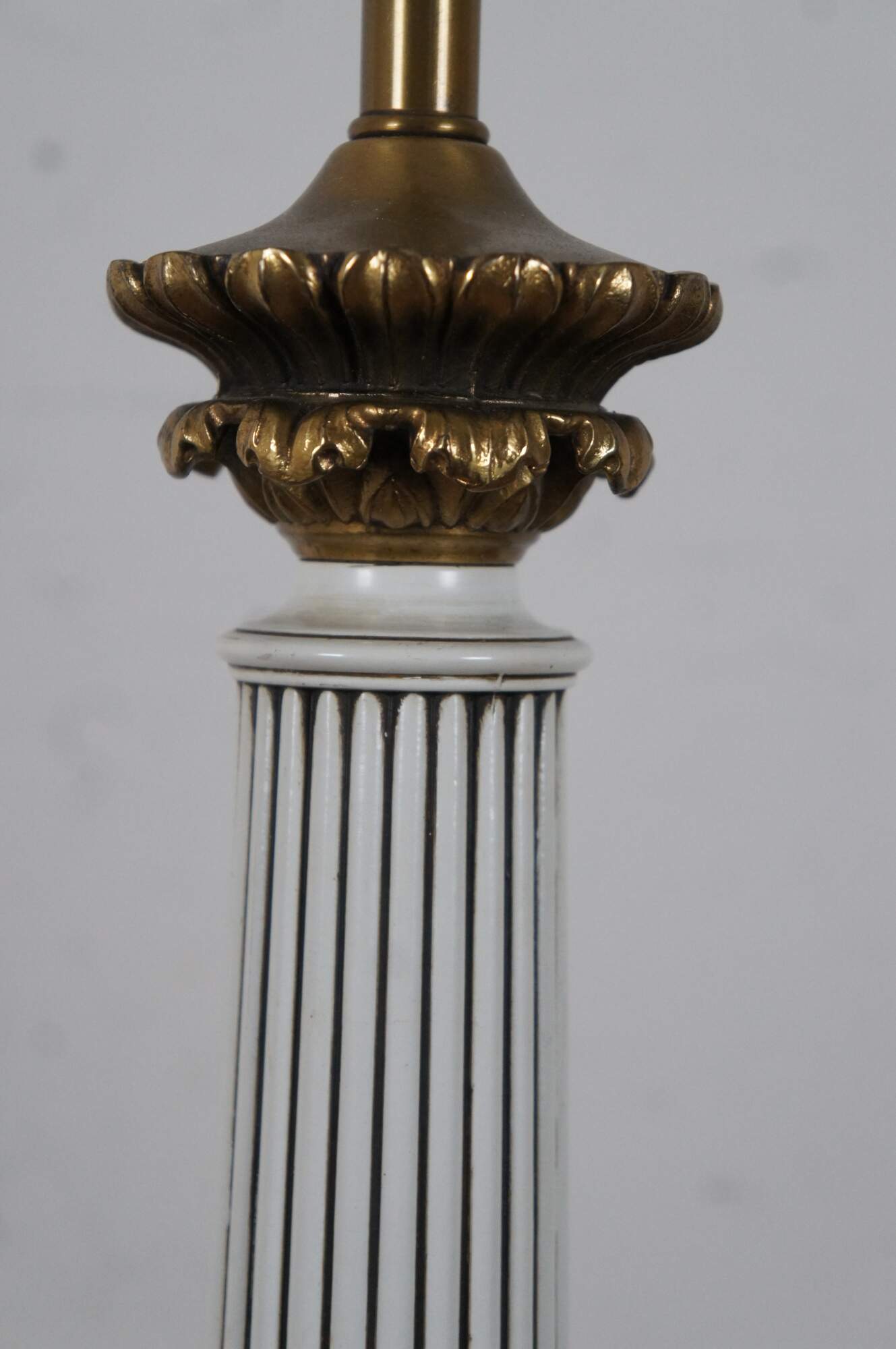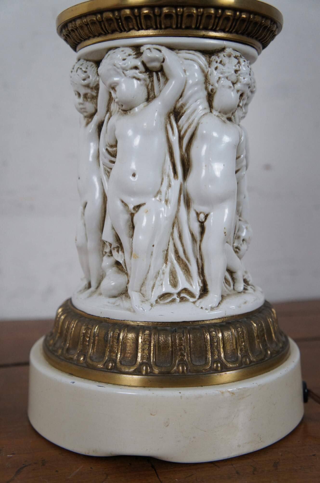 Mid 20th century Hollywood Regency style torchiere style table lamp in brass and white painted resin, in the shape of a Corinthian column with a particularly ornate base featuring a frieze of Putti / cherubs. No shade.