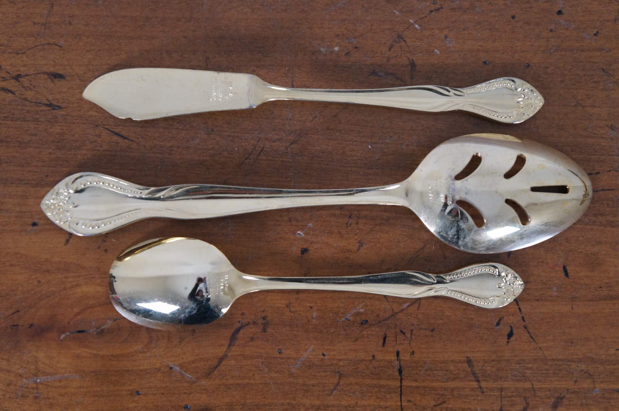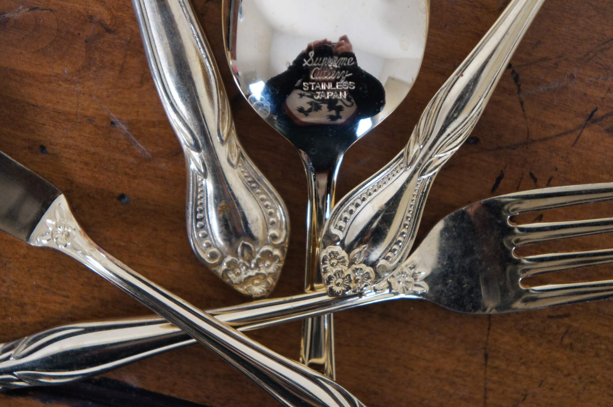Vintage 75 piece set, service for 12 people, flatware by Supreme Vermai - 23 karat gold plating over stainless, heavy gauge tableware in the Raquel beaded and floral pattern. Made in Japan.