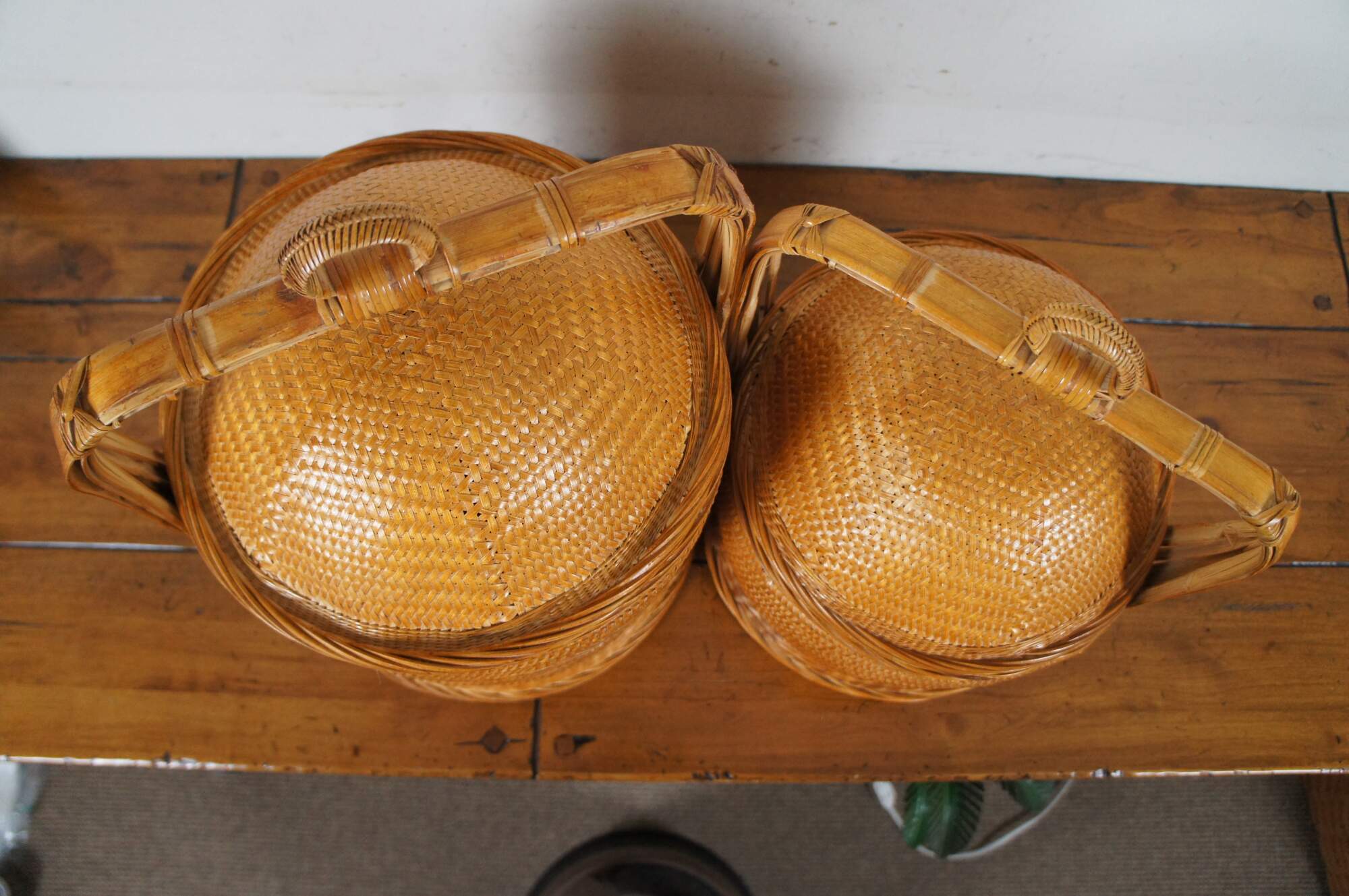 Pair of vintage 20th century bentwood bamboo / rattan / wicker Chinese wedding baskets, both featuring round bodies, domed lids and squared off, fixed handles at the top. The smaller is single tiered and the larger is two tiered.