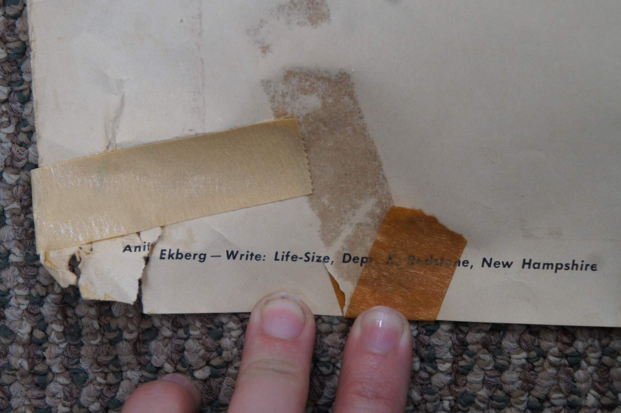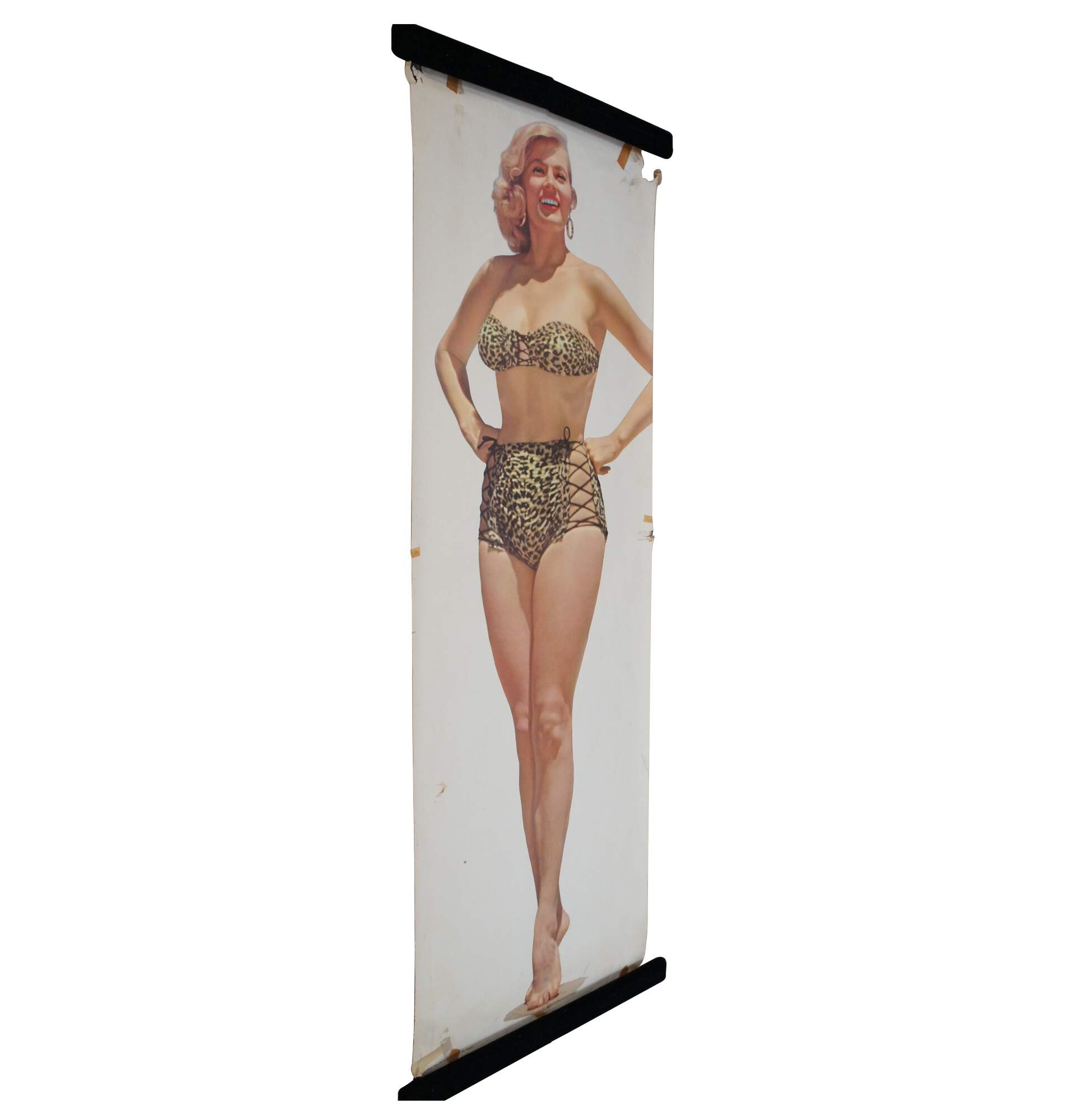 Original 1950s mid century life sized pinup girl poster of actress Anita Ekberg in a leopard print bikini. Lower edge makred “Antia Ekberg – Write: Life-Size, Dept. X, Redstone, New Hampshire Printed in U.S.A.”