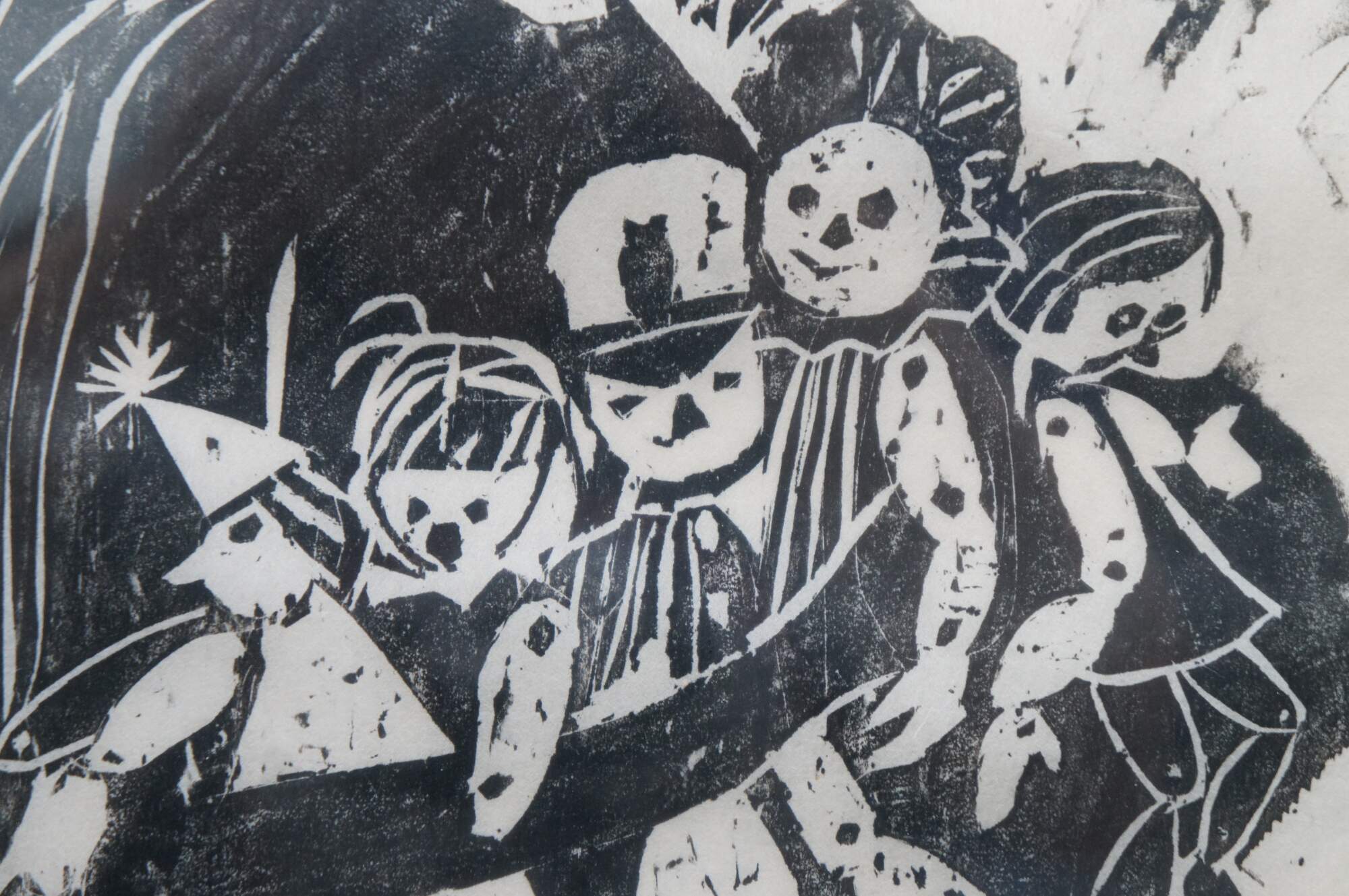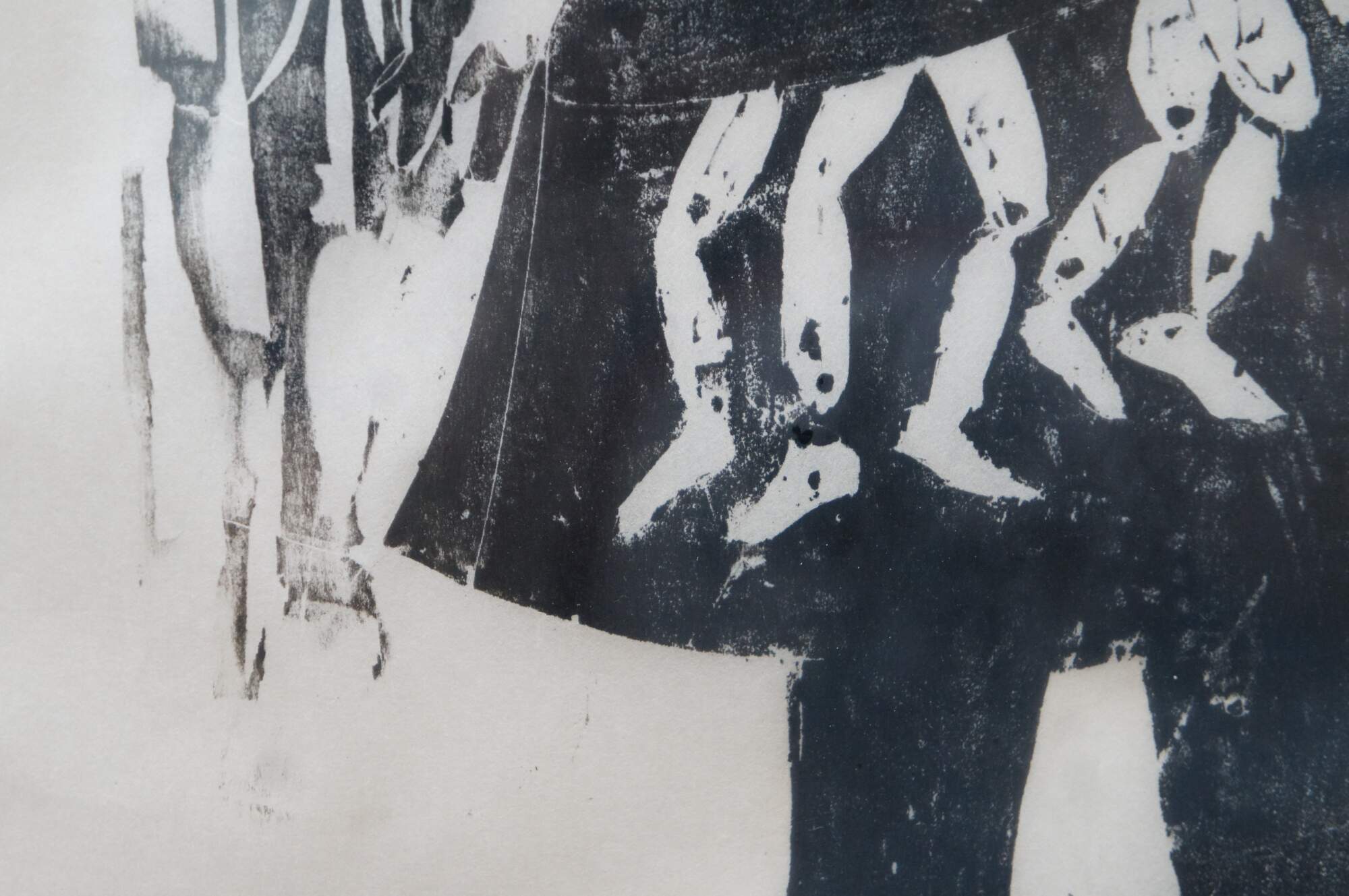 Vintage black and white print of a girl with long hair and an armful of dolls, by Sheila Bonser. C. 1970s