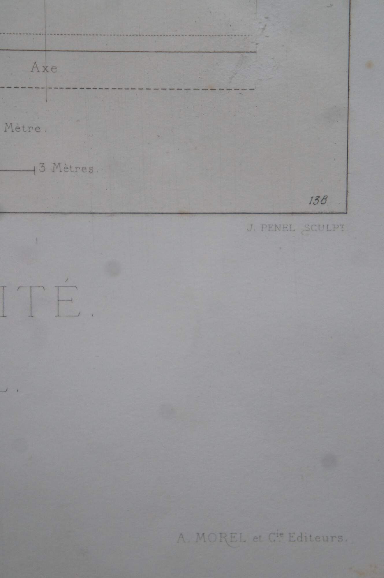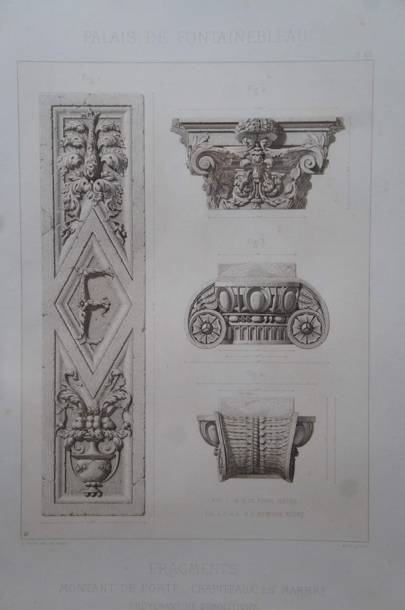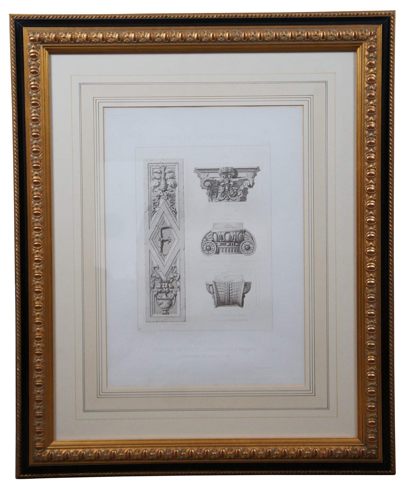Pair of antique 19th century framed engravings of architecture of the Palais de Fontainebleau (Fontainebleau Palace). 1) Fragments Montant de Porte Chapiteaux en Marbre Provenant de Demolitions (Fragments Marble Capitals and Doorposts From Demolitions), drawn by Rodolphe Pfnor, engraved by Thomas Talbot Bury. 2) Chapelle de la Trinite Plan et Details de L’autel (Chapel of the Trinity Altar Plan and Details), drawn by Rodolphe Pfnor, printed by Lemercier & Co of Paris, Engraved by J. Penel. Both produced by A. Morel et Cie Editeurs of Paris.