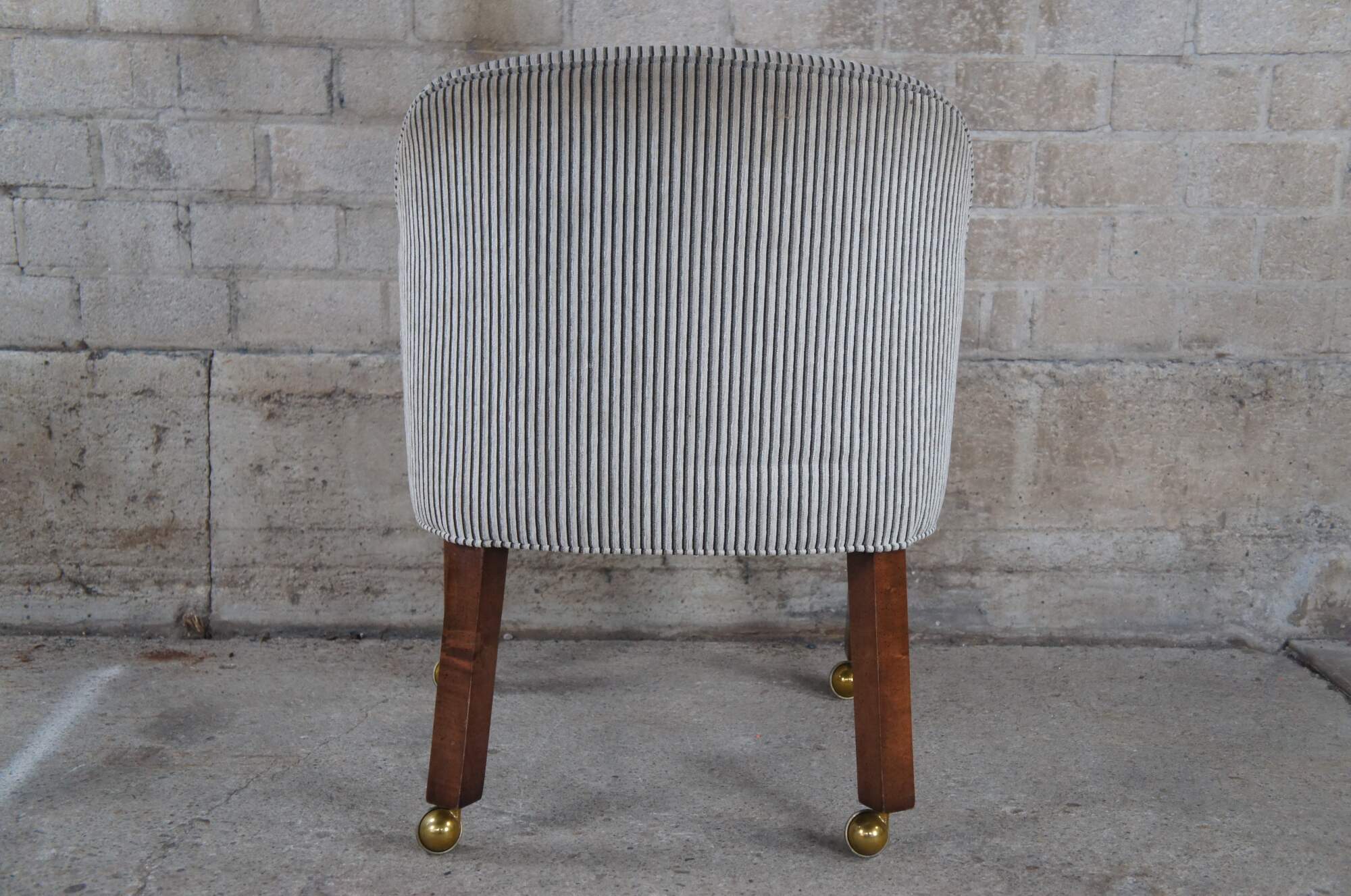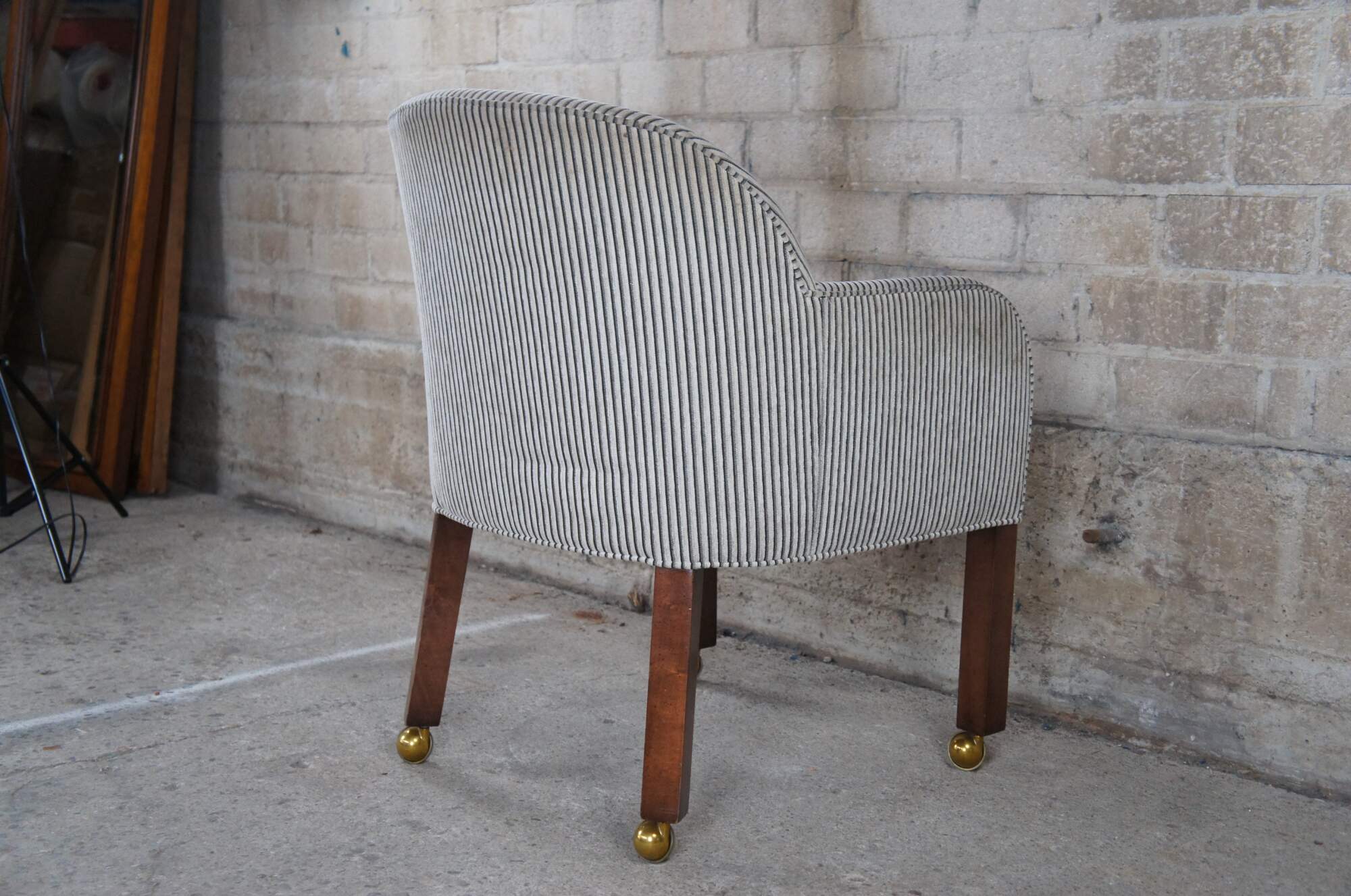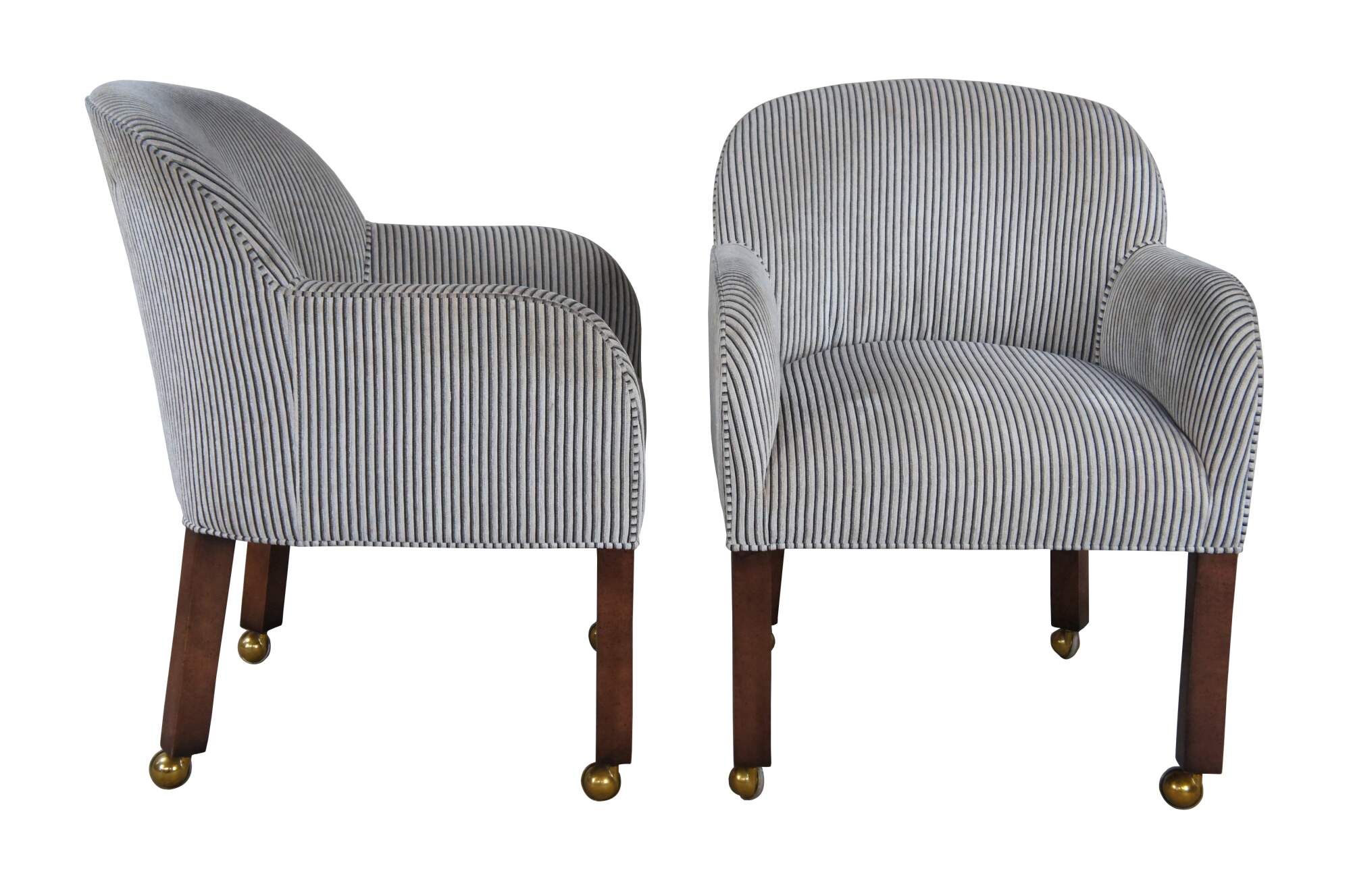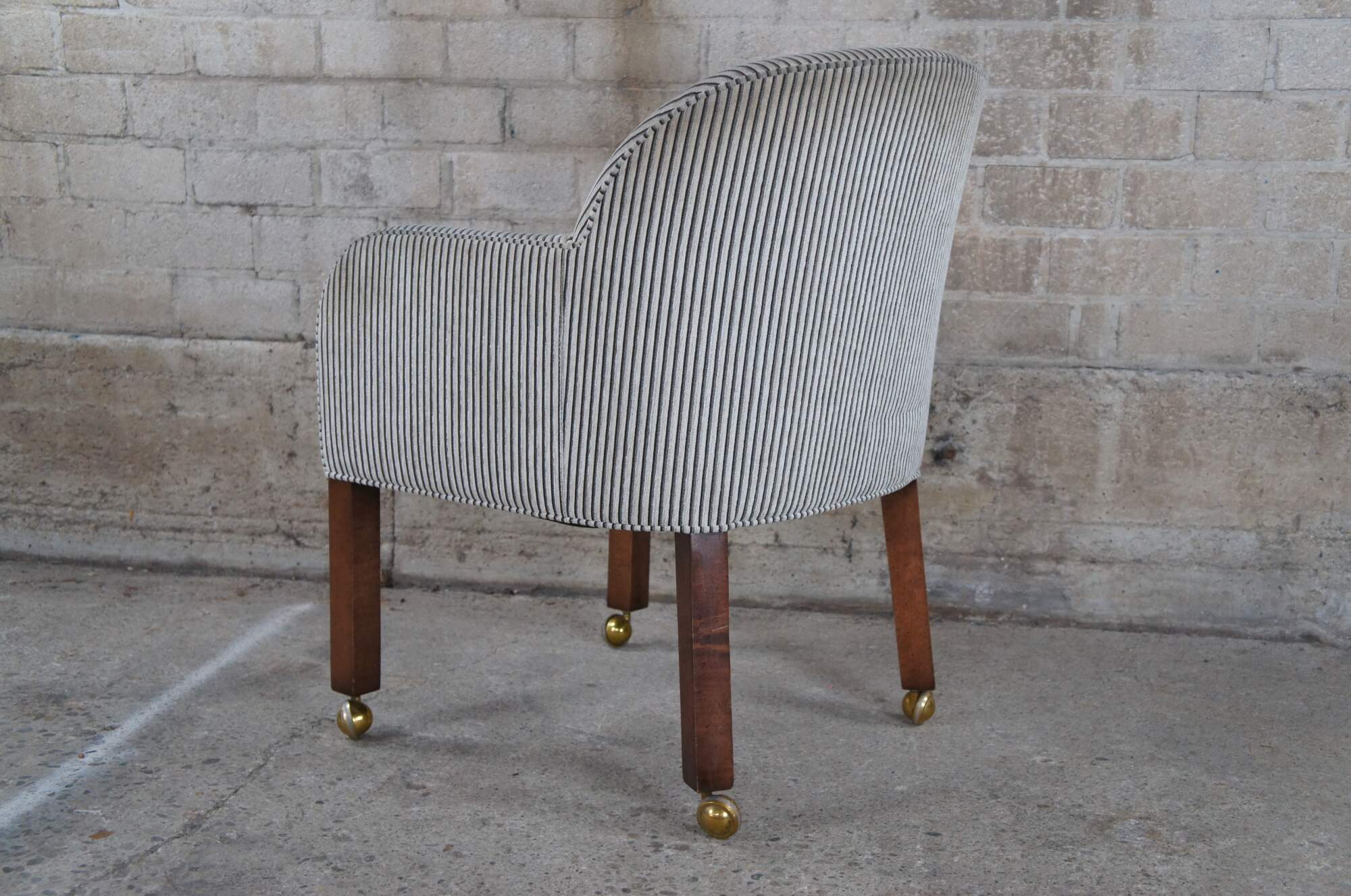 Designmaster for Globe Furniture Laurel Tub Chair; 01-197. The design is similar to a game chair; however, the seat height and depth is all dining chair specific. The exposed wood legs are maple with a cherry finish. Upholstered in a neutral striped fabric.