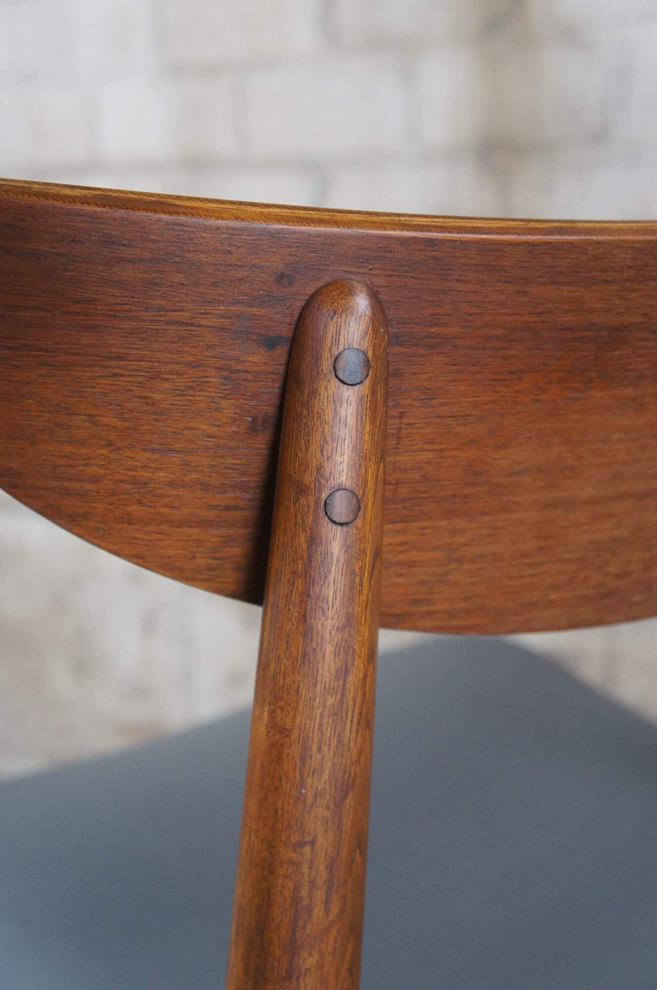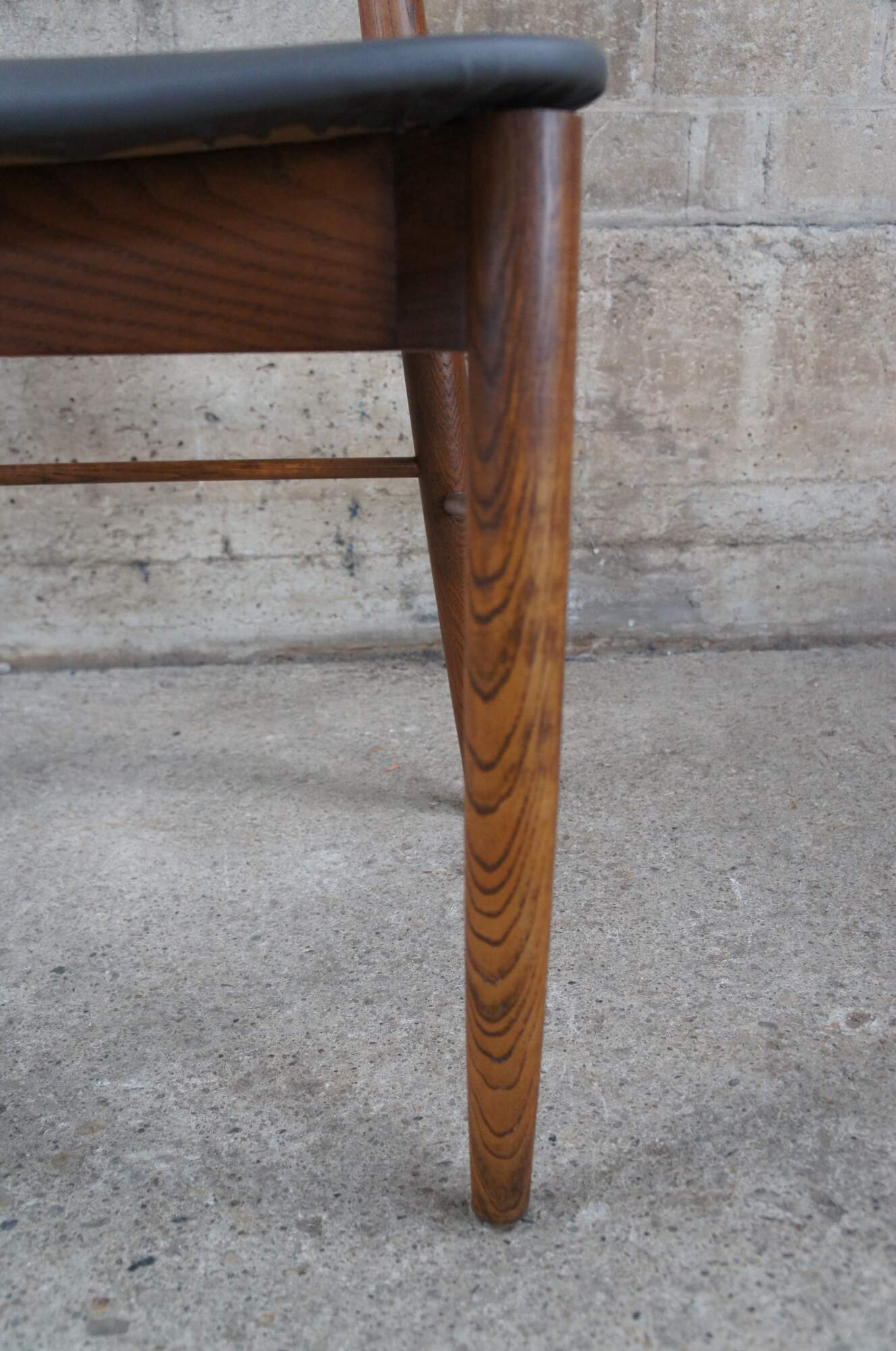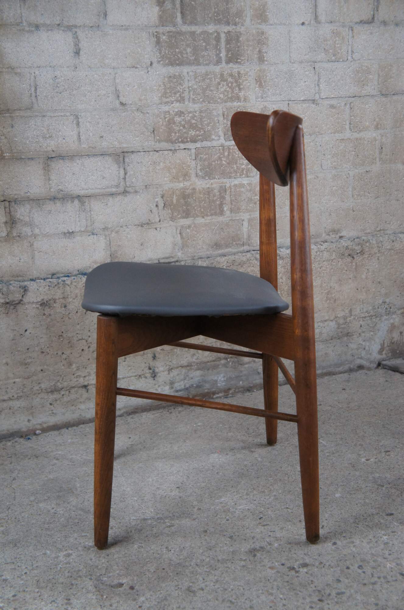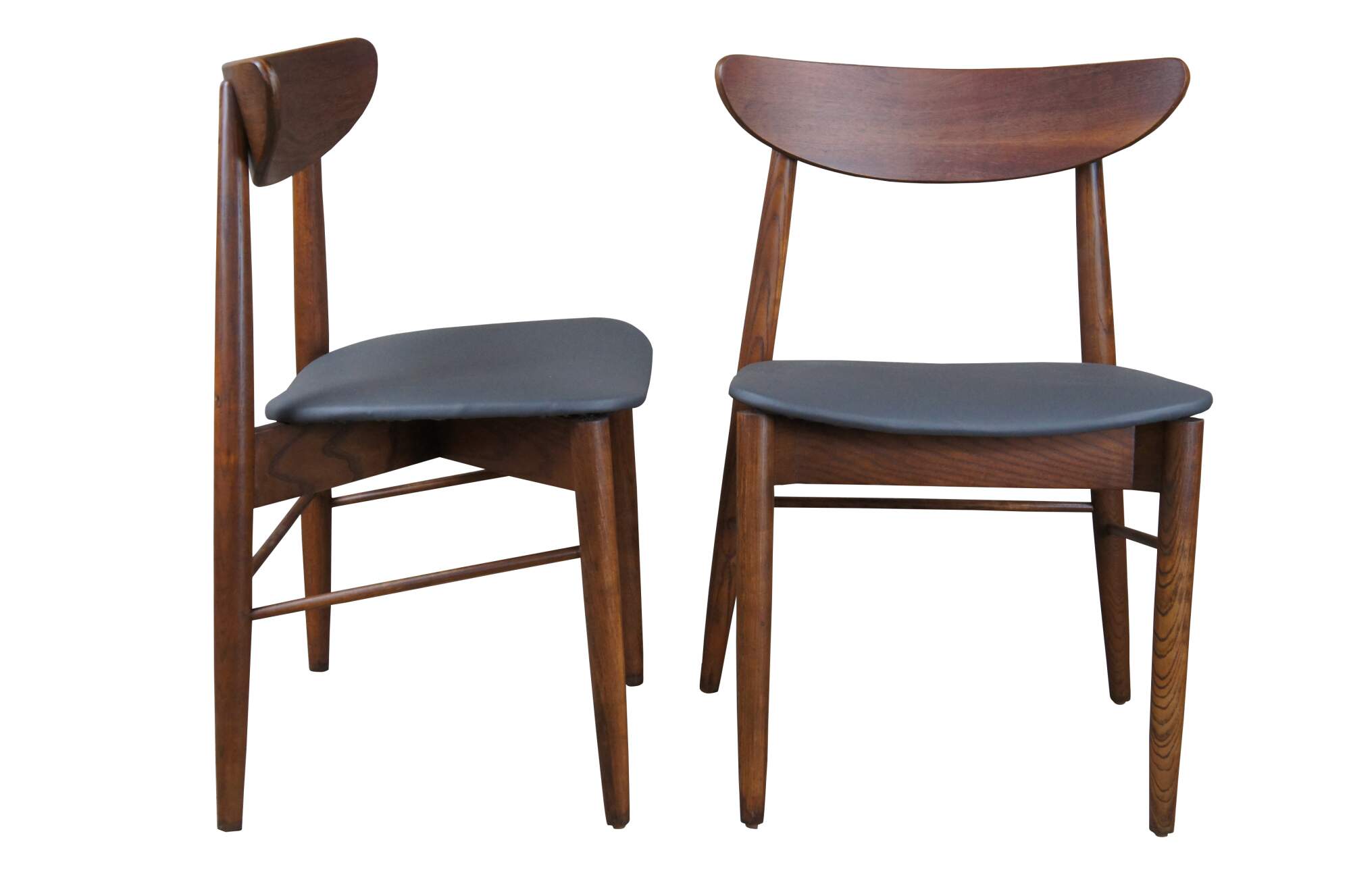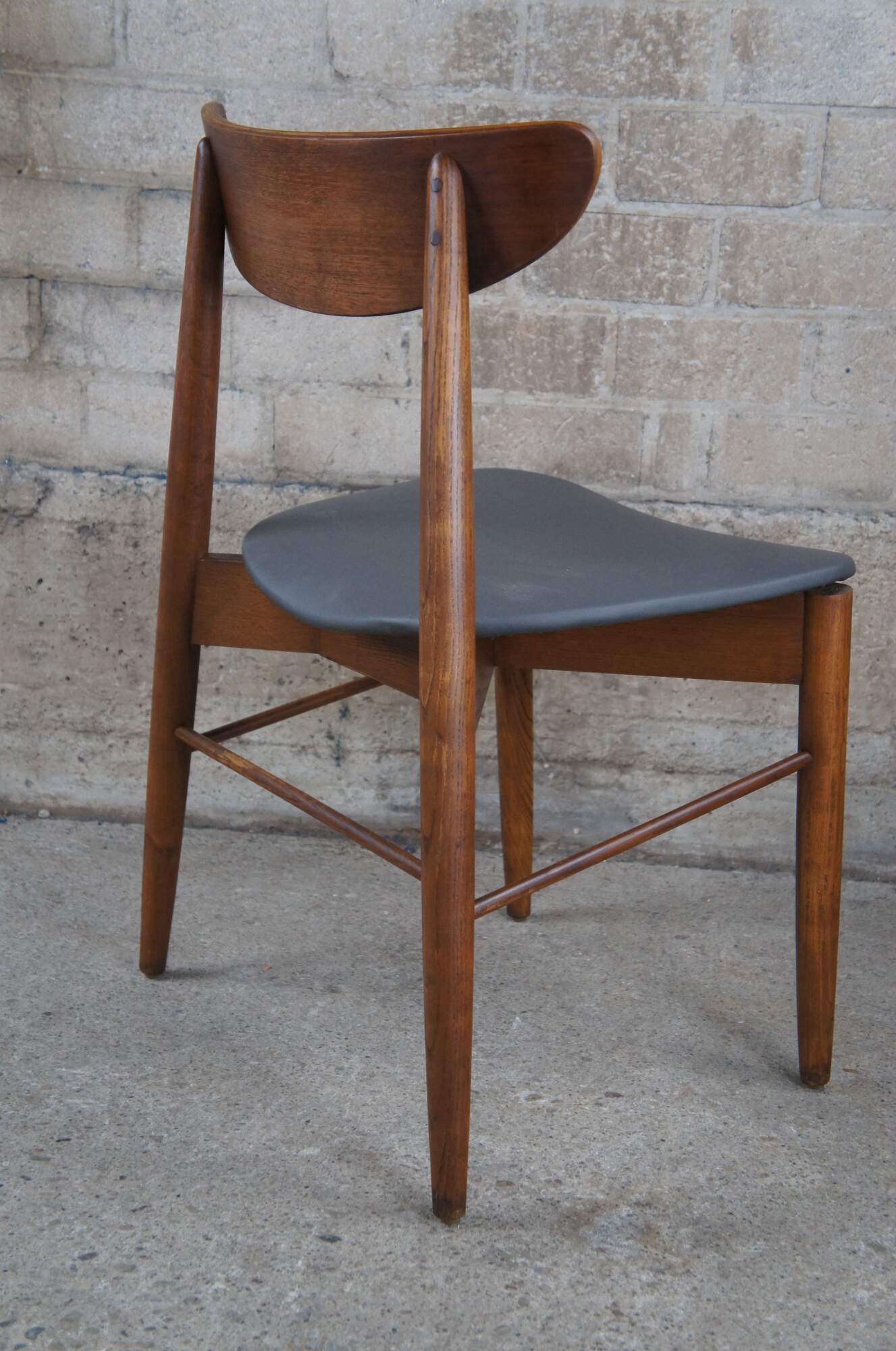 Stanley Mid Century Modern side chairs, Circa 1960s. Made from walnut with a Danish or Scandinavian inspired design. Features a curved back and vinyl seat. Marked Side Chair 385