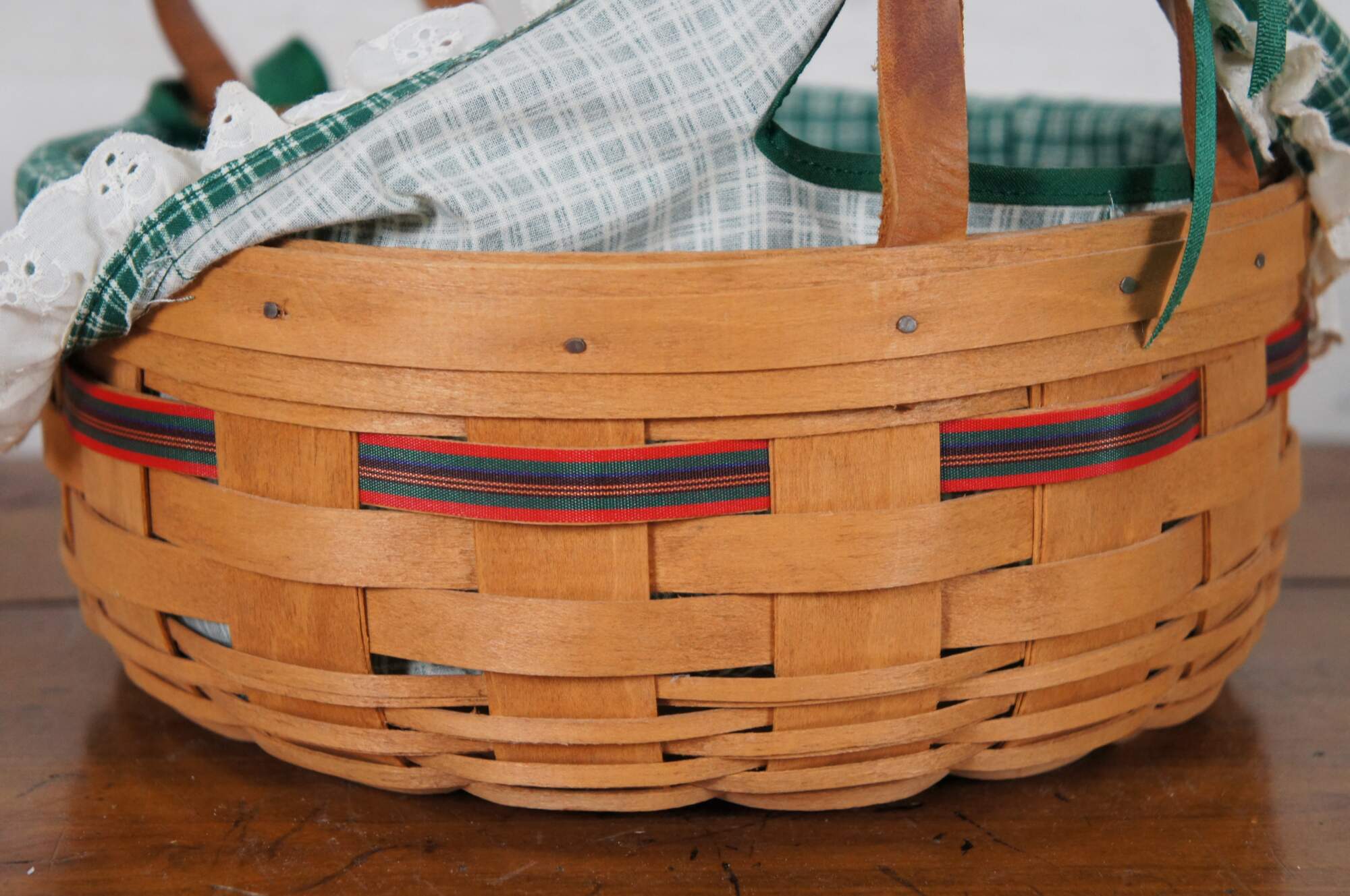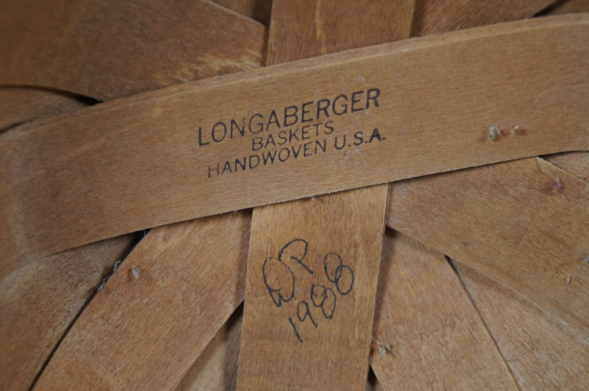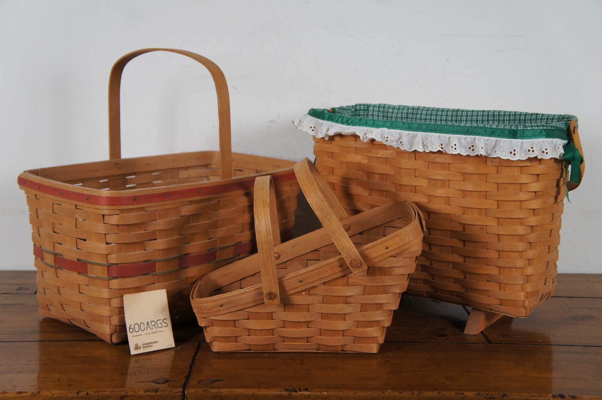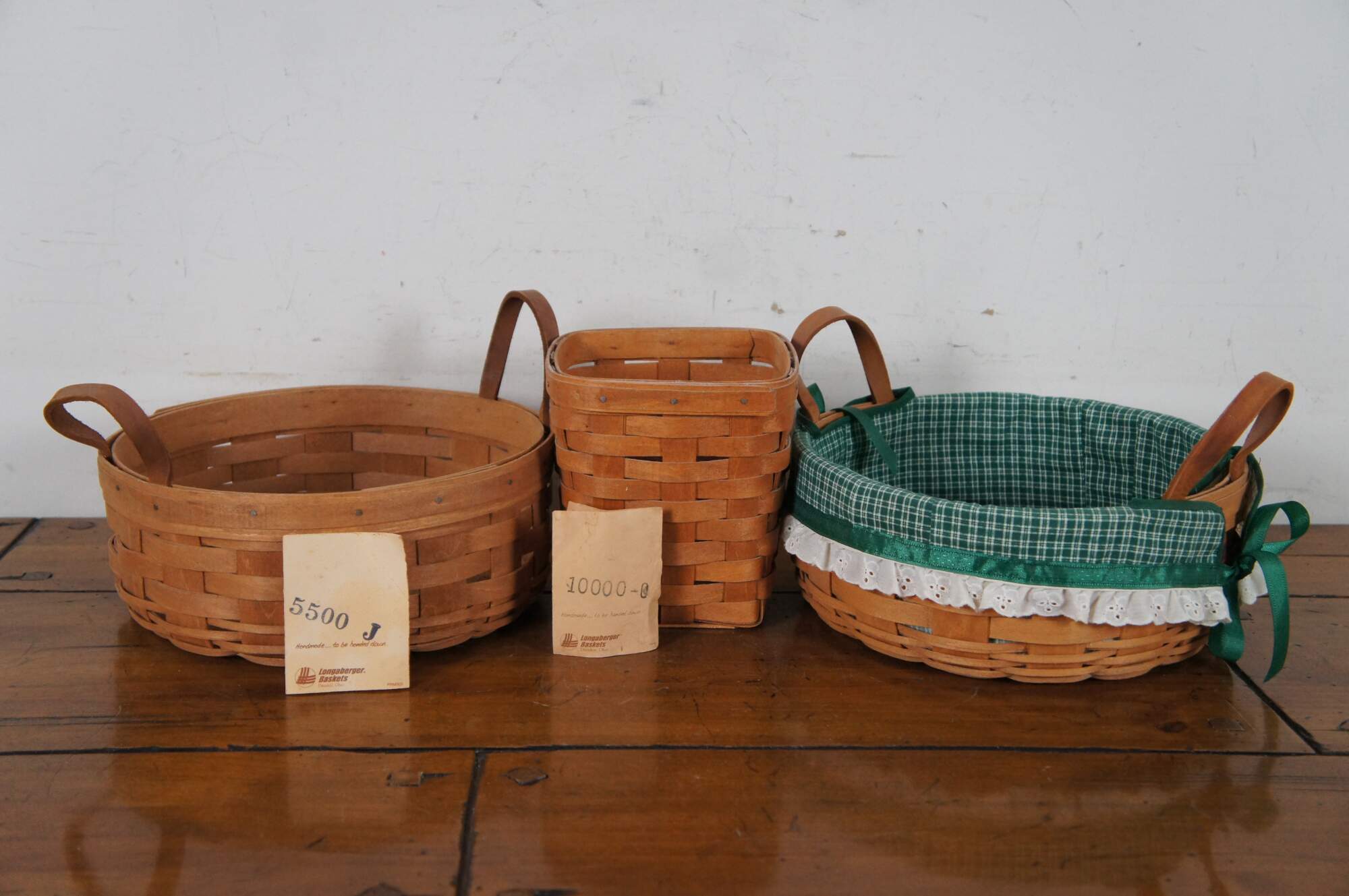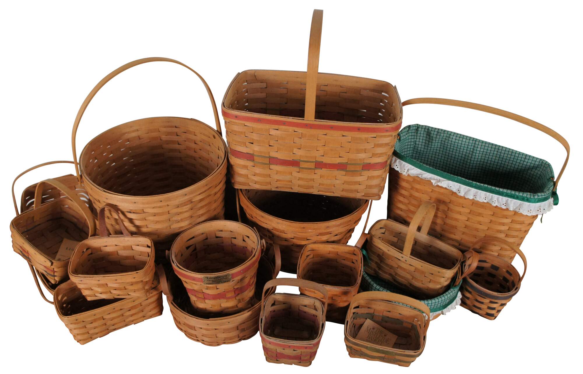 Lot of 16 vintage signed 1980’s Longaberger baskets in a variety of sizes and shapes from large bushel baskets to small key baskets. Some still with tags including: 3800-ABS Resolution basket, 600-ARGS large market basket, 10000-O basket, 5500-J round basket with leather handles, 700-1 wall hanging key basket, 1100-A candle basket, Christmas Collection 1986 Edition Candy Cane Basket, 1987 Edition Mistletoe Basket, & 1988 Edition Poinsettia Basket.