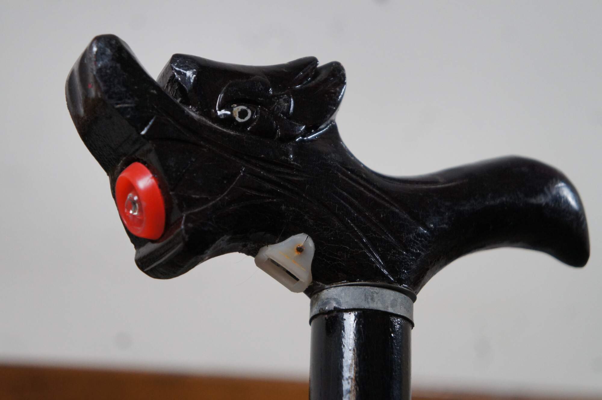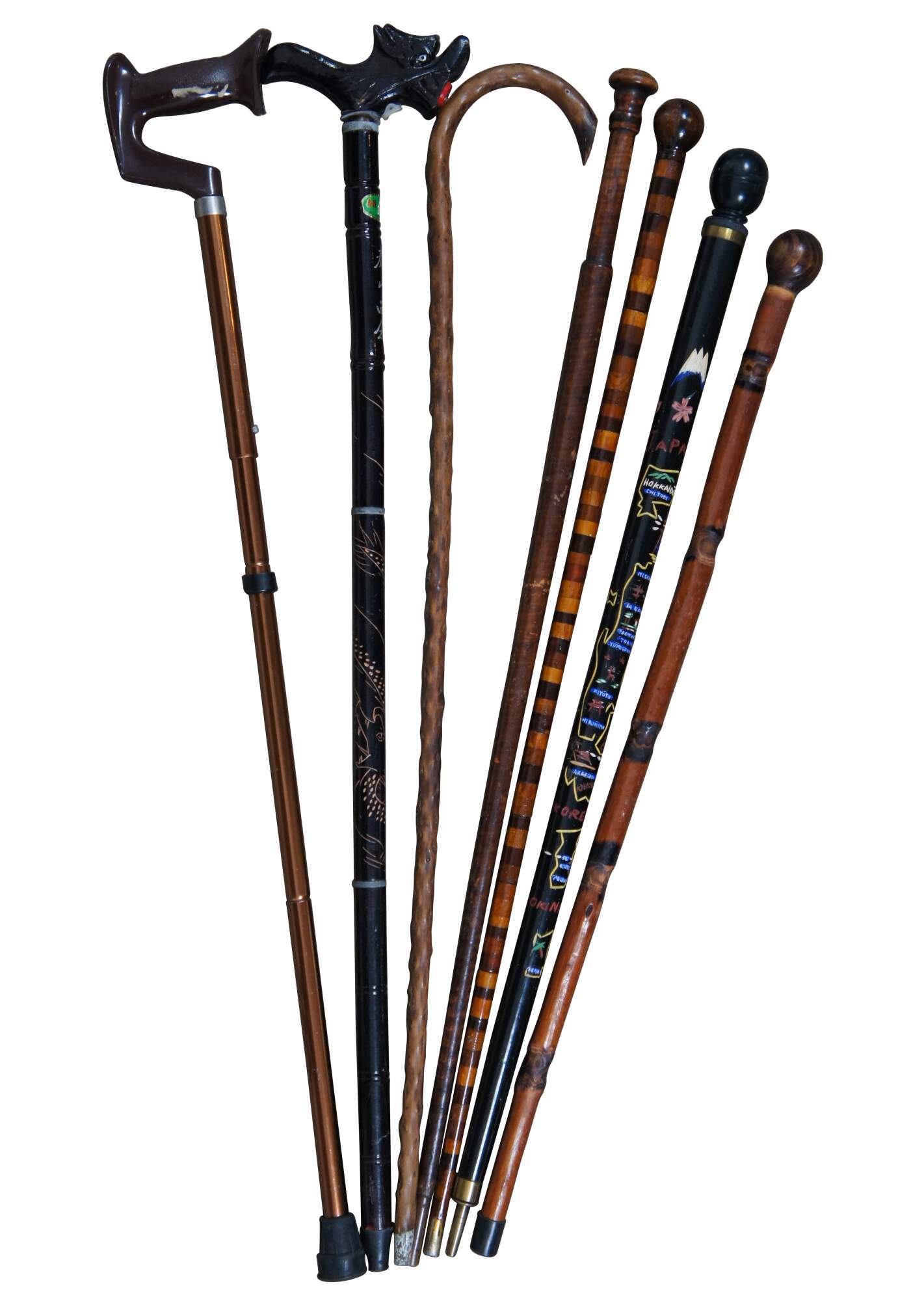 Lot of seven vintage walking sticks / canes including one contemporary orange aluminum adjustable with brown plastic ergonomic / crutch handle; black lacquered / carved Asian cane with dragon head derby handle with flashlight in the front tip (currently non-functional); rough wood crook top; a polished and turned wood knob top; ball / knob top fashioned of discs of alternating color woods; ball /knob top black lacquer and painted Japan souvenir cane; and ball / knob top polished wood cane with turned divots along the length. Includes contemporary black metal stand, vase shaped with molded rose band.