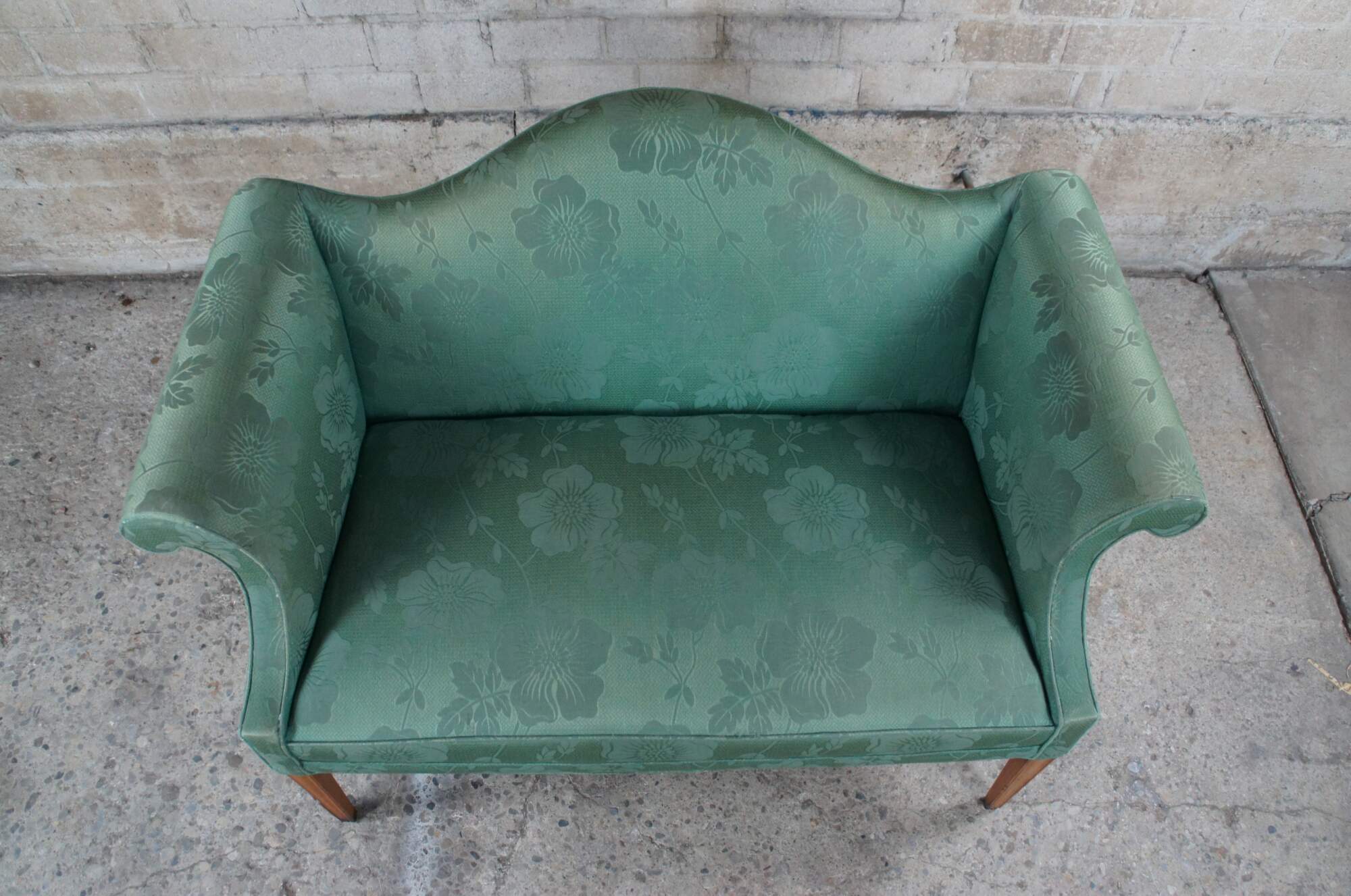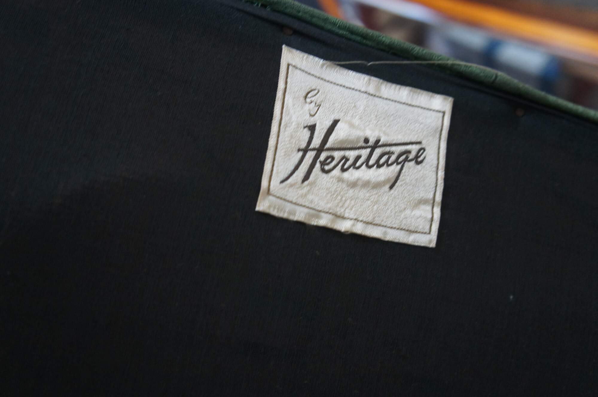 A beautiful pair of Mid Century sofas by Heritage Furniture, circa 1960s. Heritage later became Drexel Heritage. Features a camelback form over square tapered mahogany legs. Covered in a floral green fabric. Comes with neutral striped slip covers.