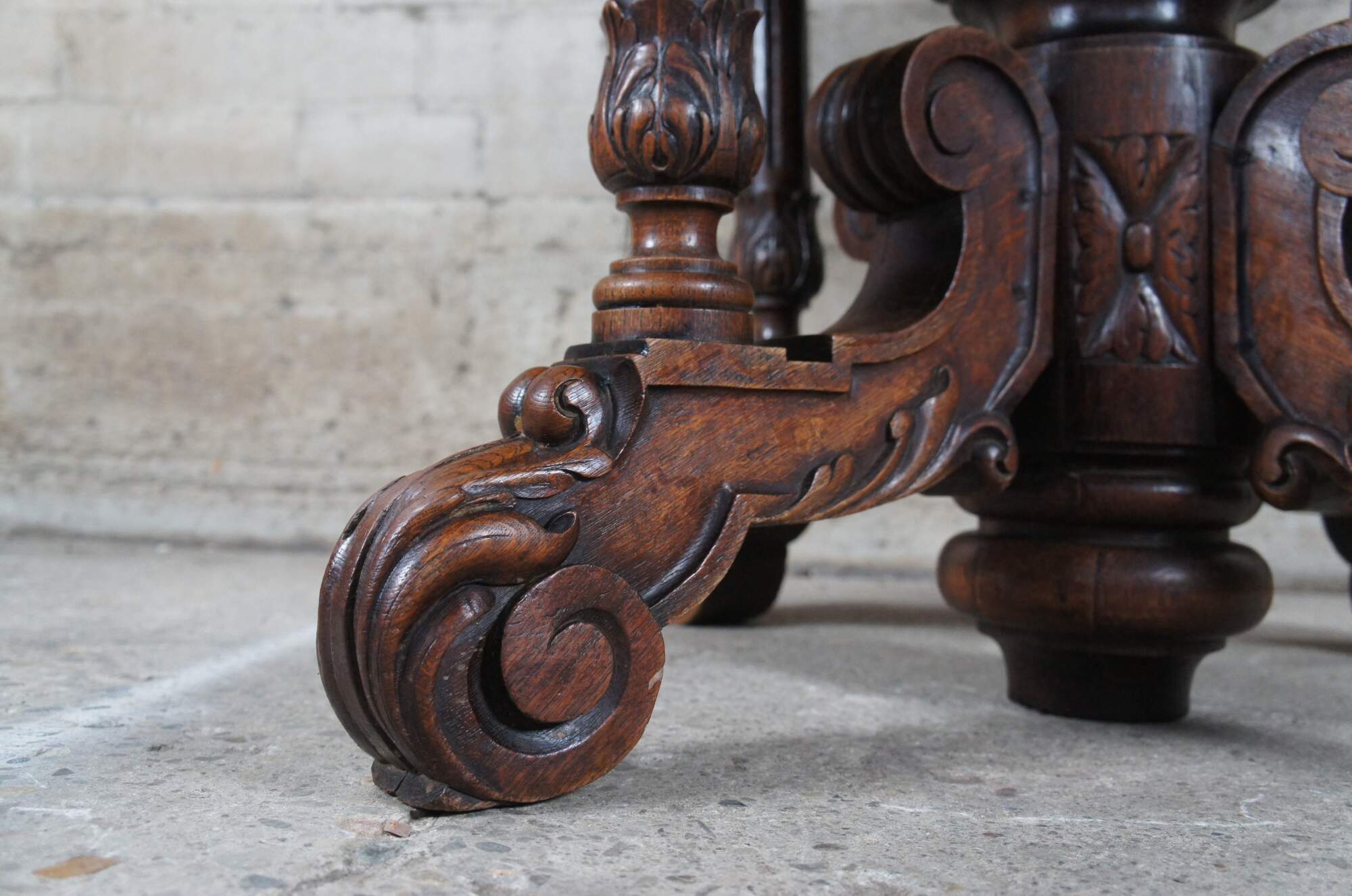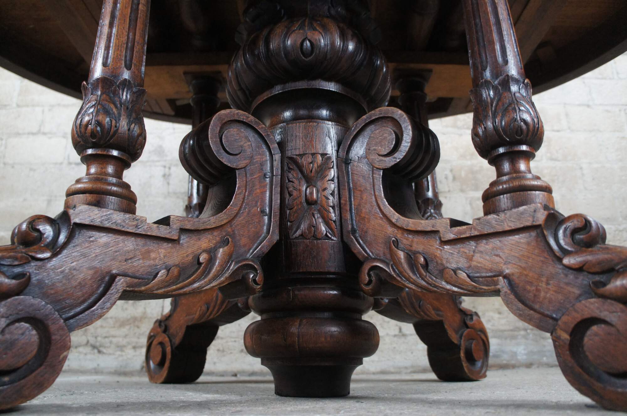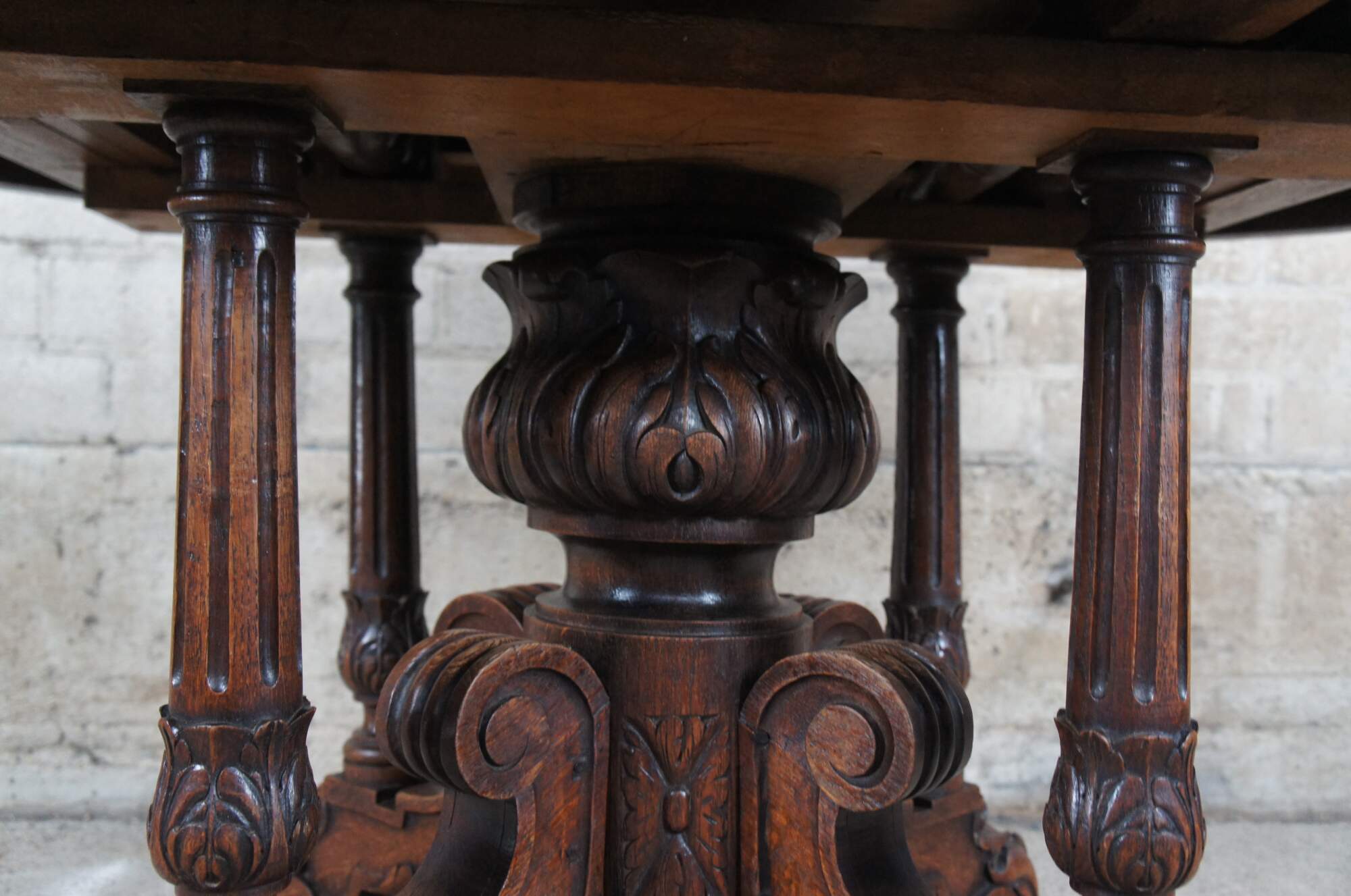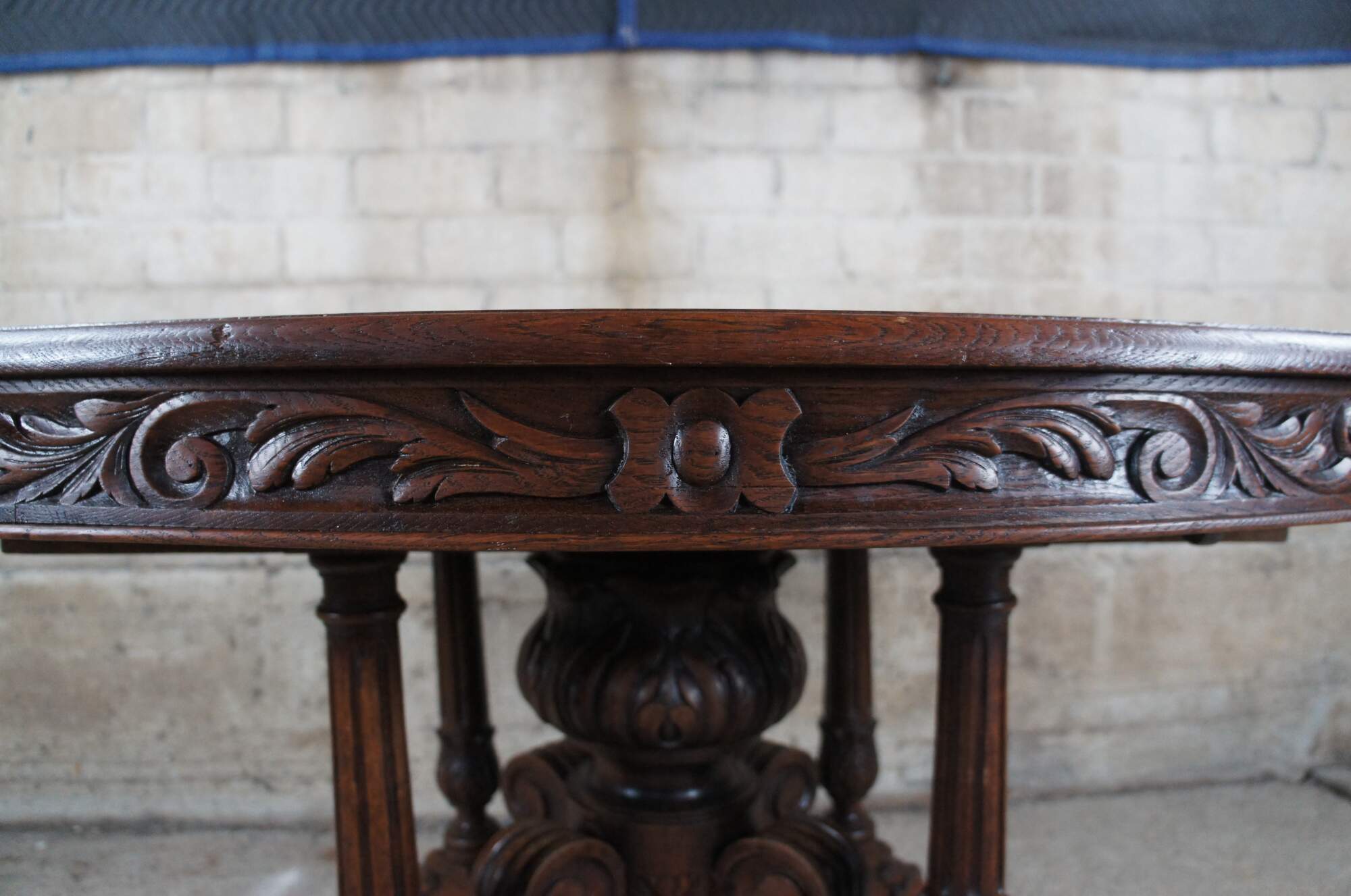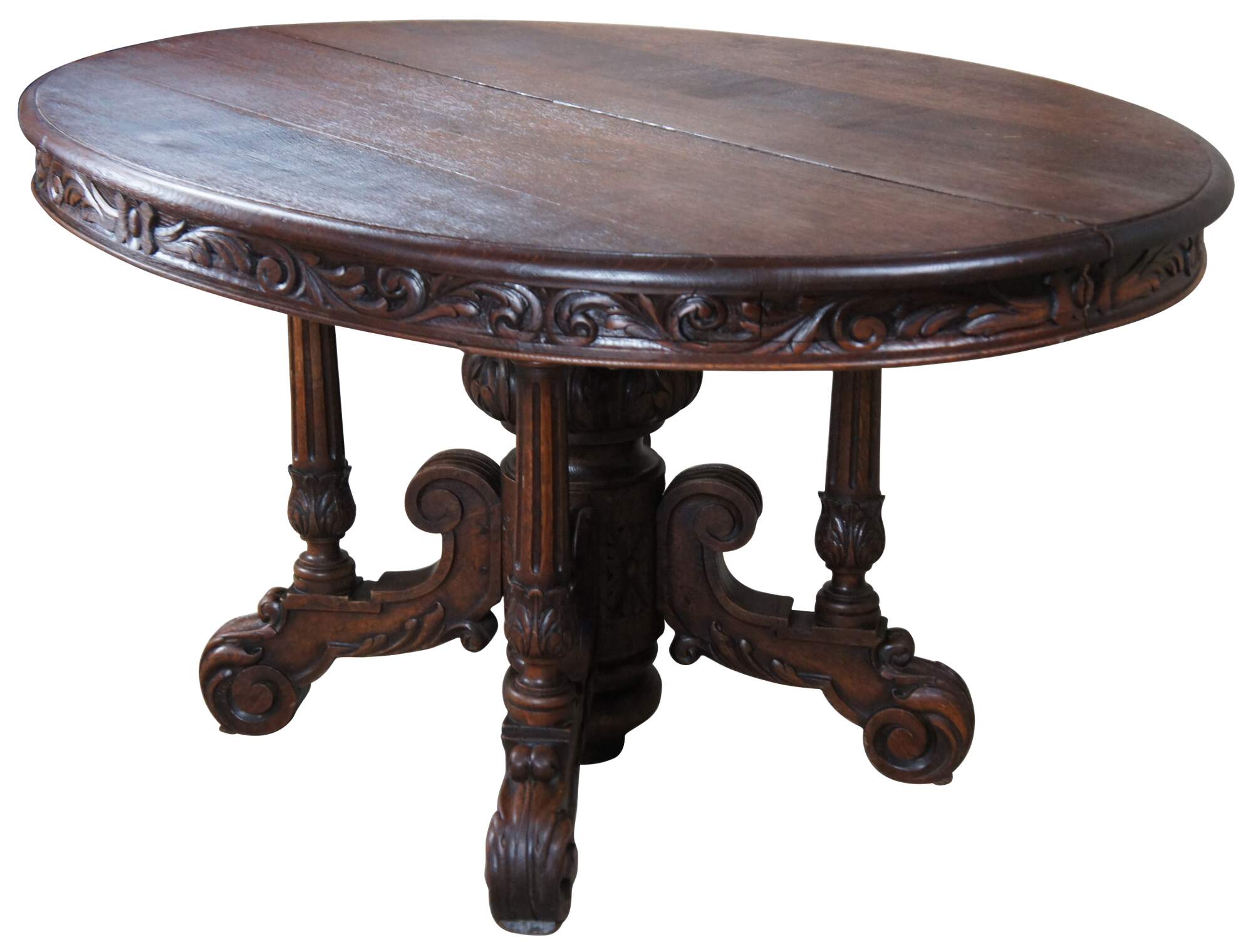 A lovely antique French Renaissance Revival dining or center (centre) table. Features an oval top with an ornately carved. The top is supported by an elaborate base with acanthus carved baluster support, flanked by hand turned and fluted columns that terminate along the middle of the "S" scrolled feet. At some point in the past the table had leaves for extension.