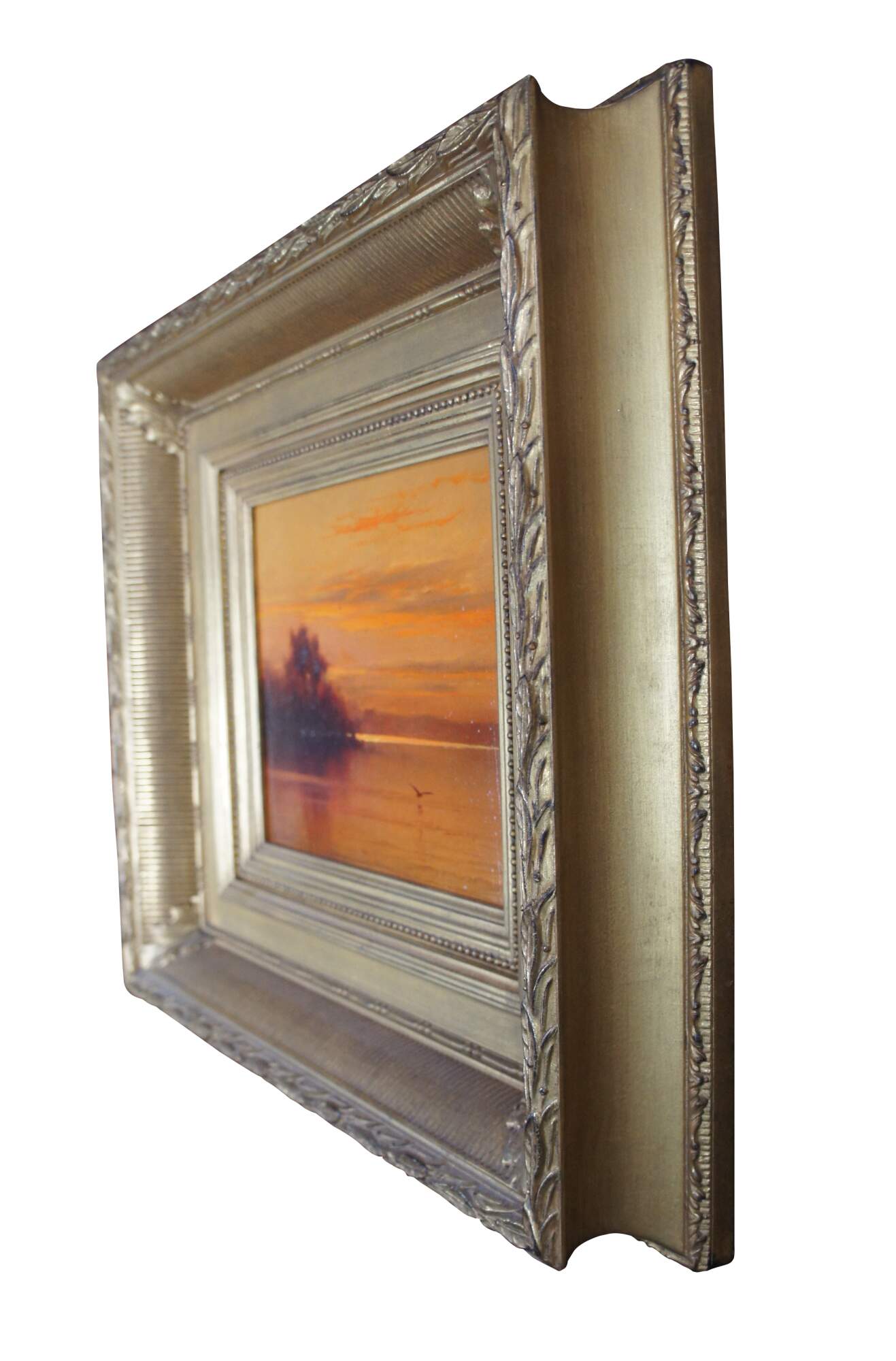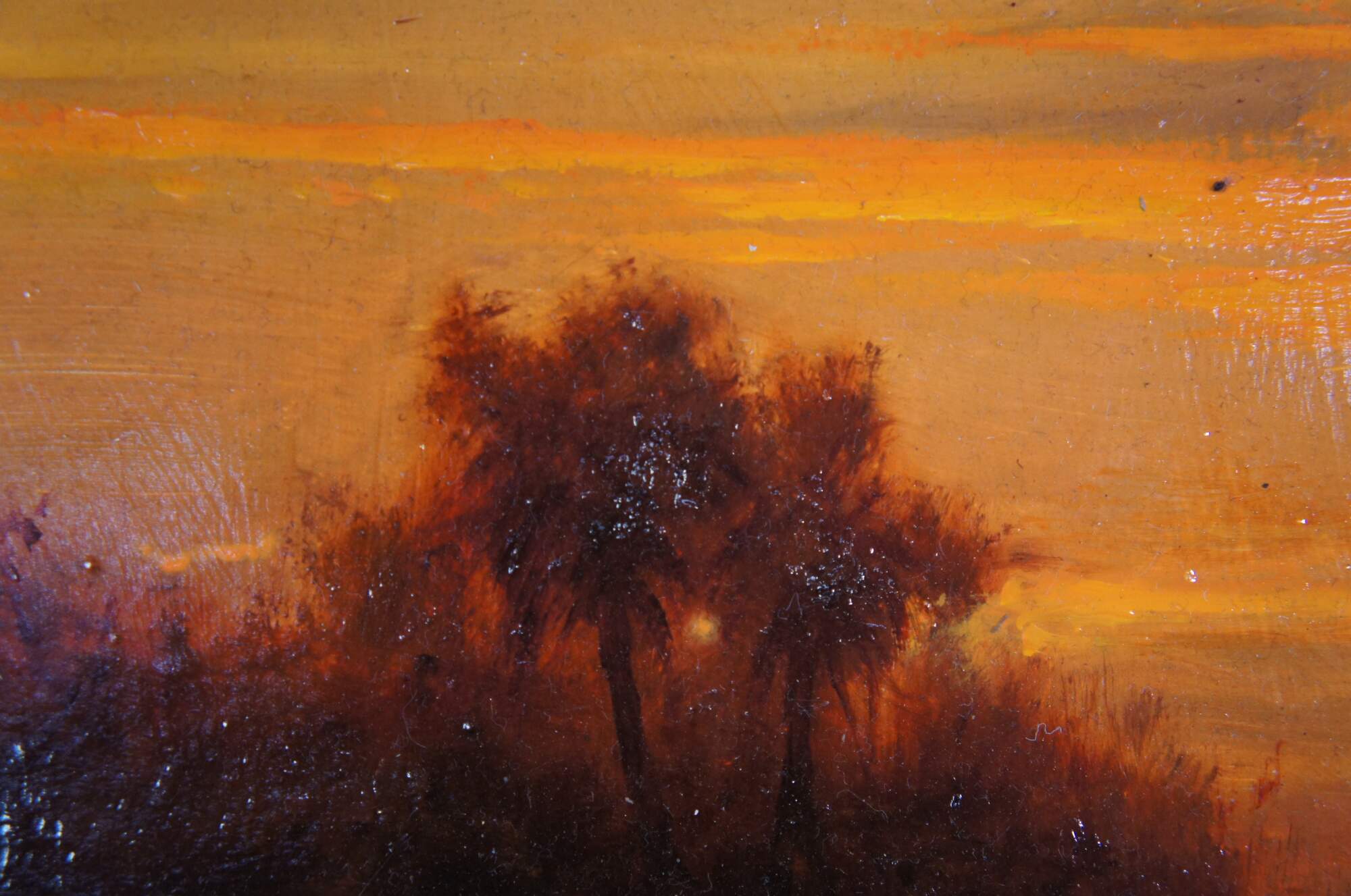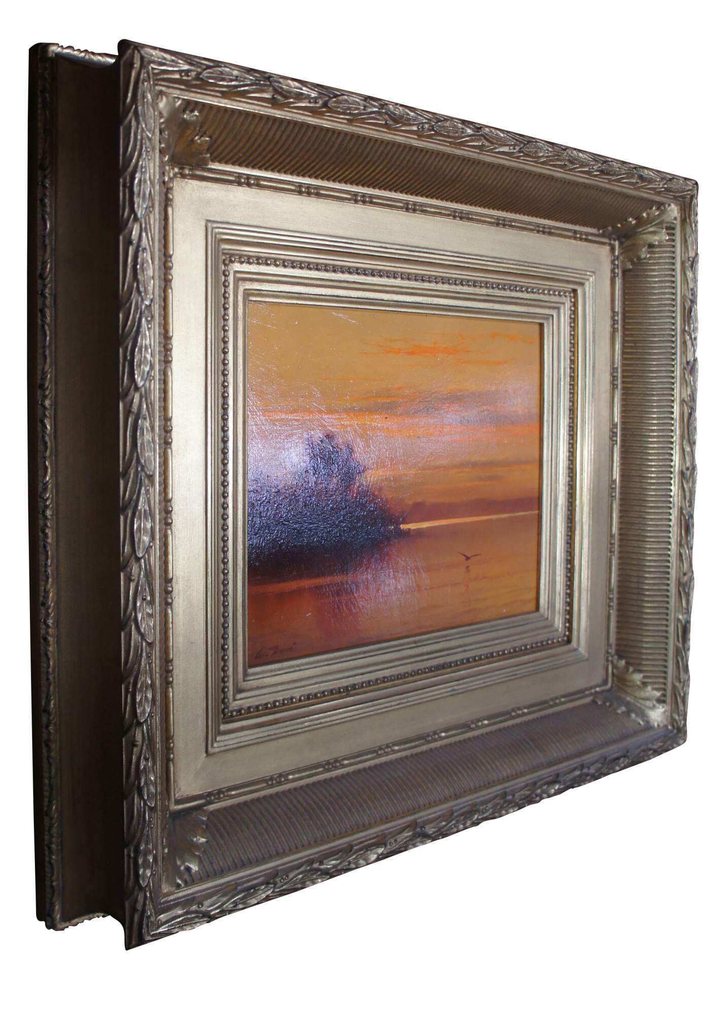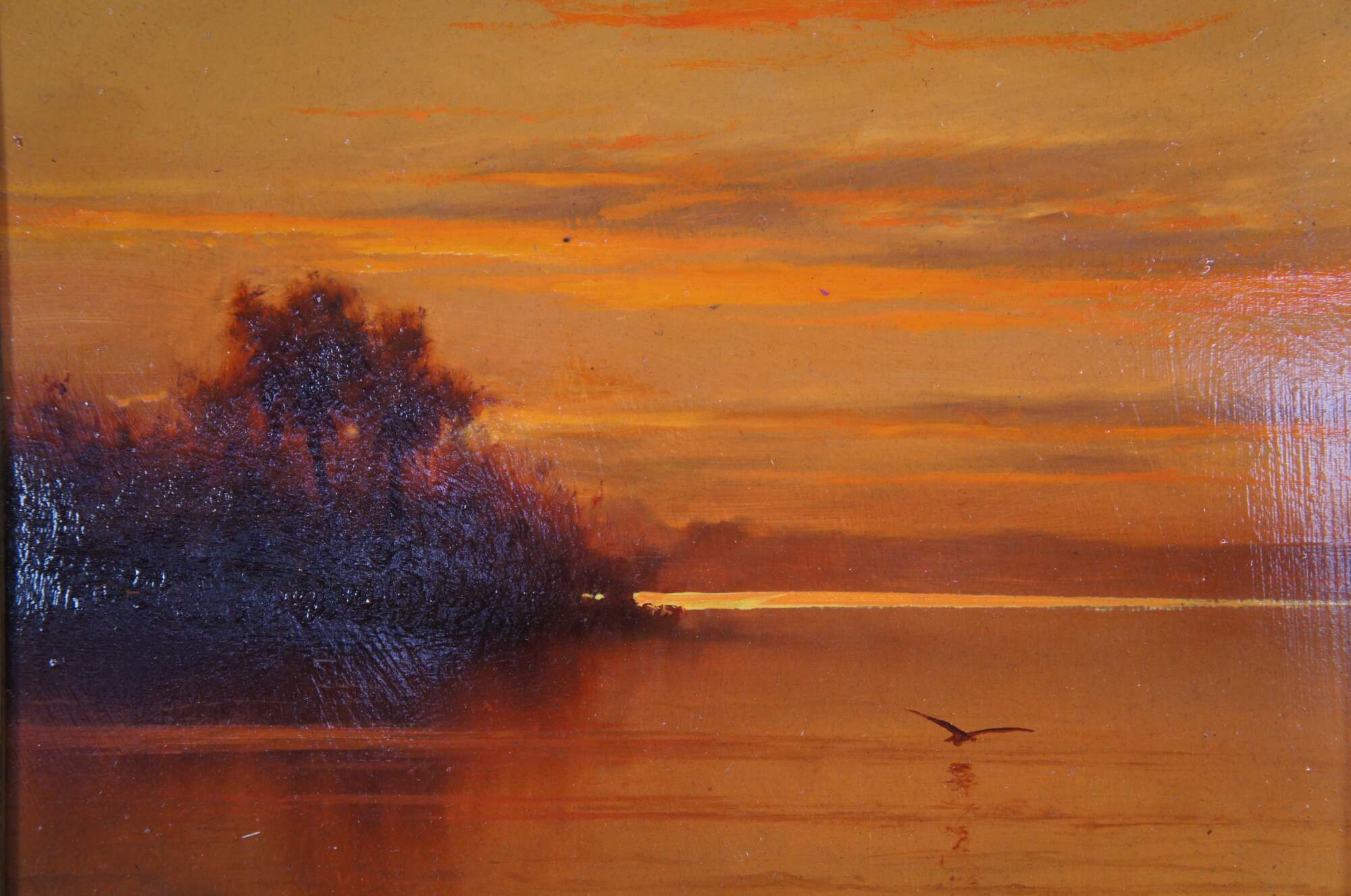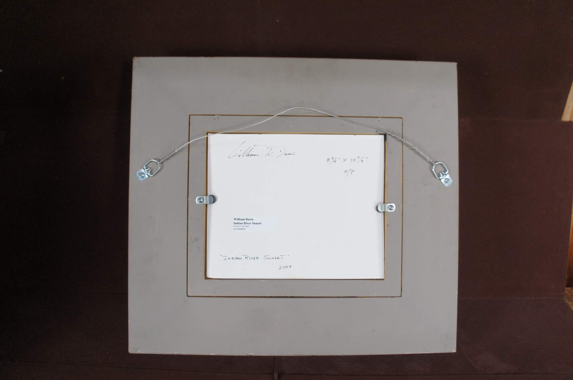 Vintage William R Davis oil painting on board featuring a landscape / seascape with a bird, trees and a view of the Indian River at sunset. Signed lower left and on verso. Purchased circa 2007 at the Vero Beach Meghan Candler Gallery, """"On the Water"""" exhibition.