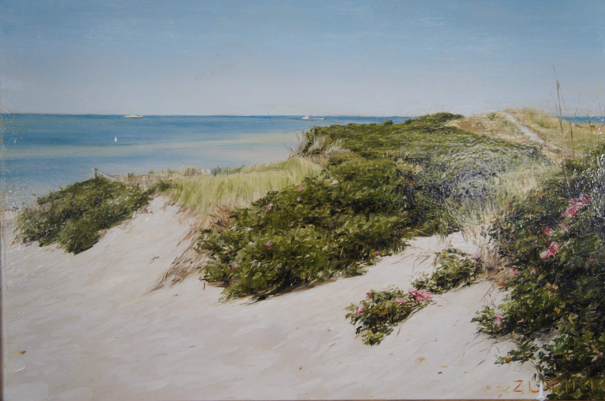 Vintage Lori Zummo Nantucket landscape / seascape oil painting titled Steps Beach Dunes.