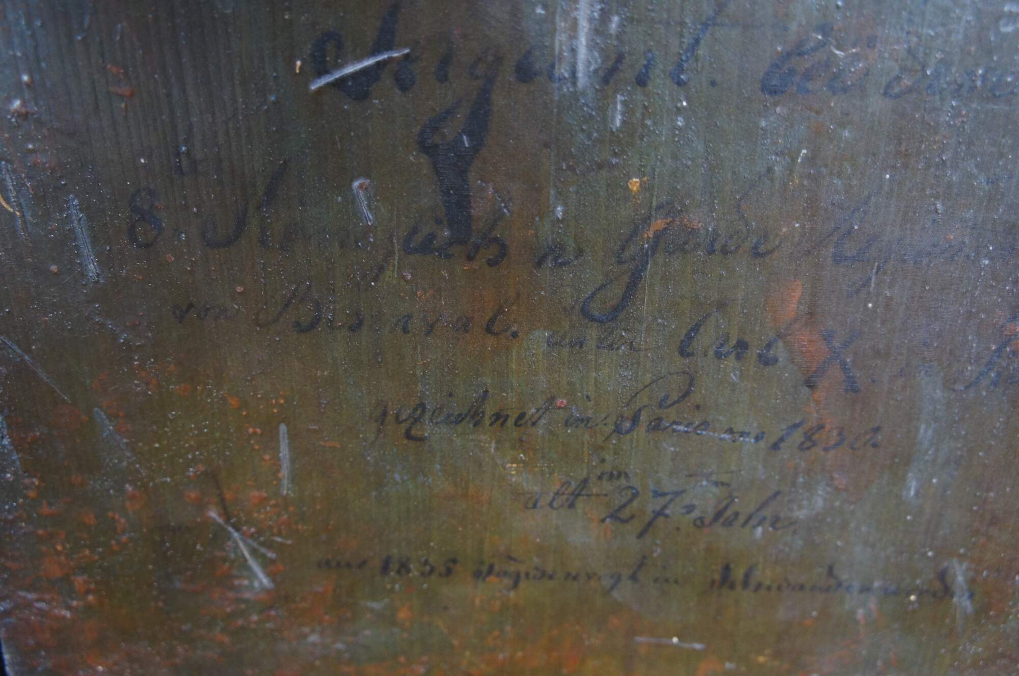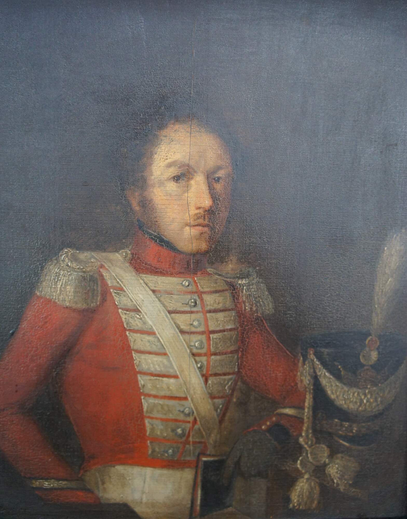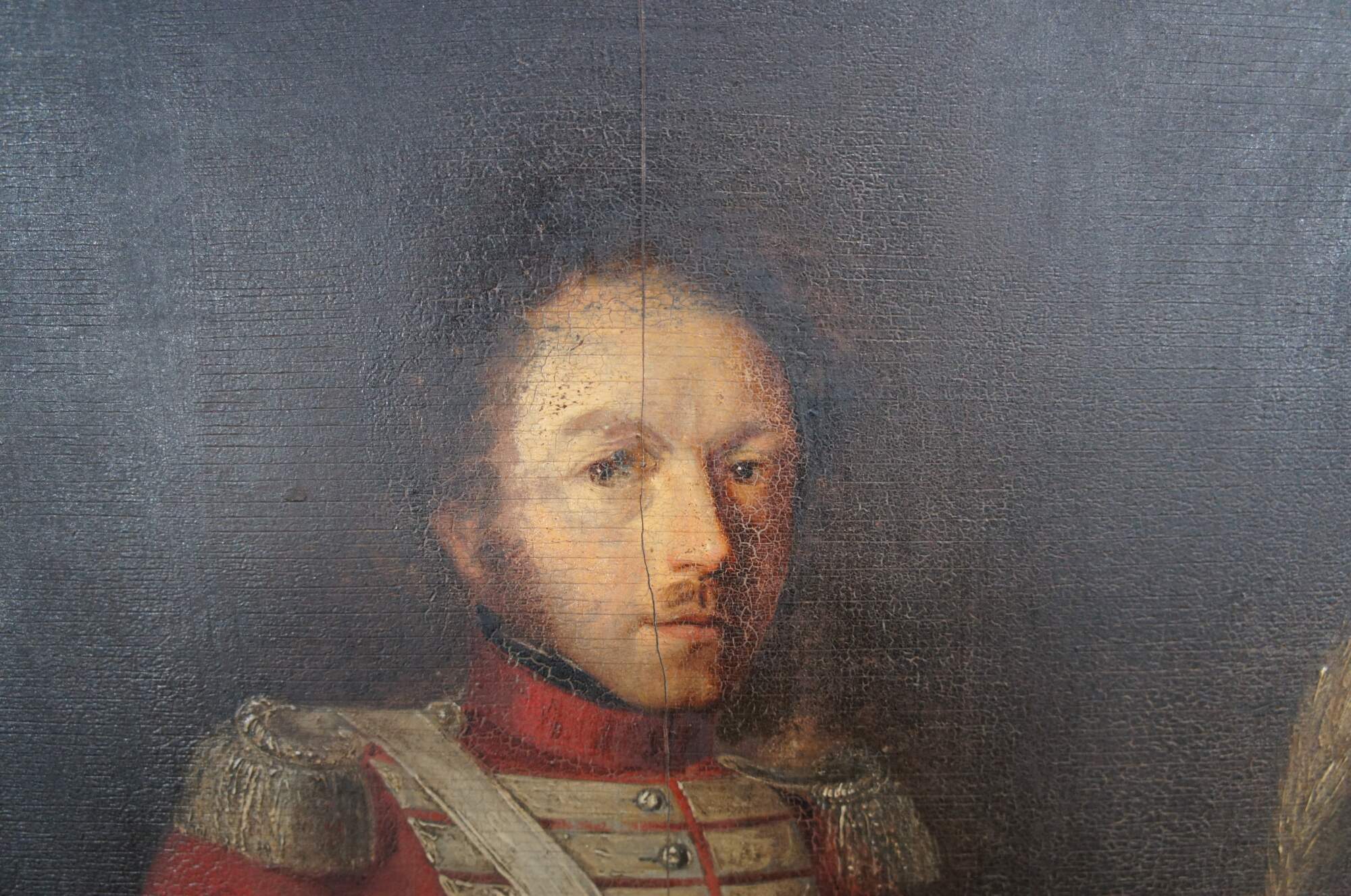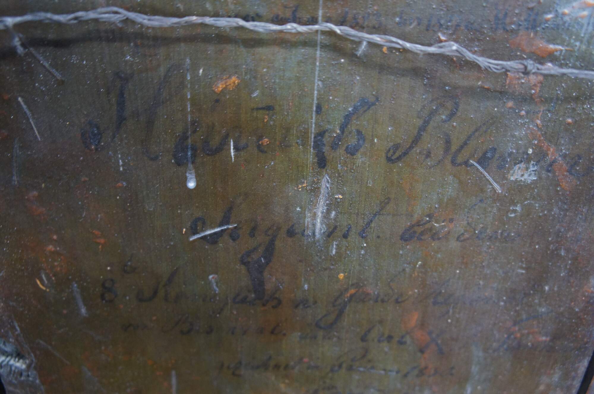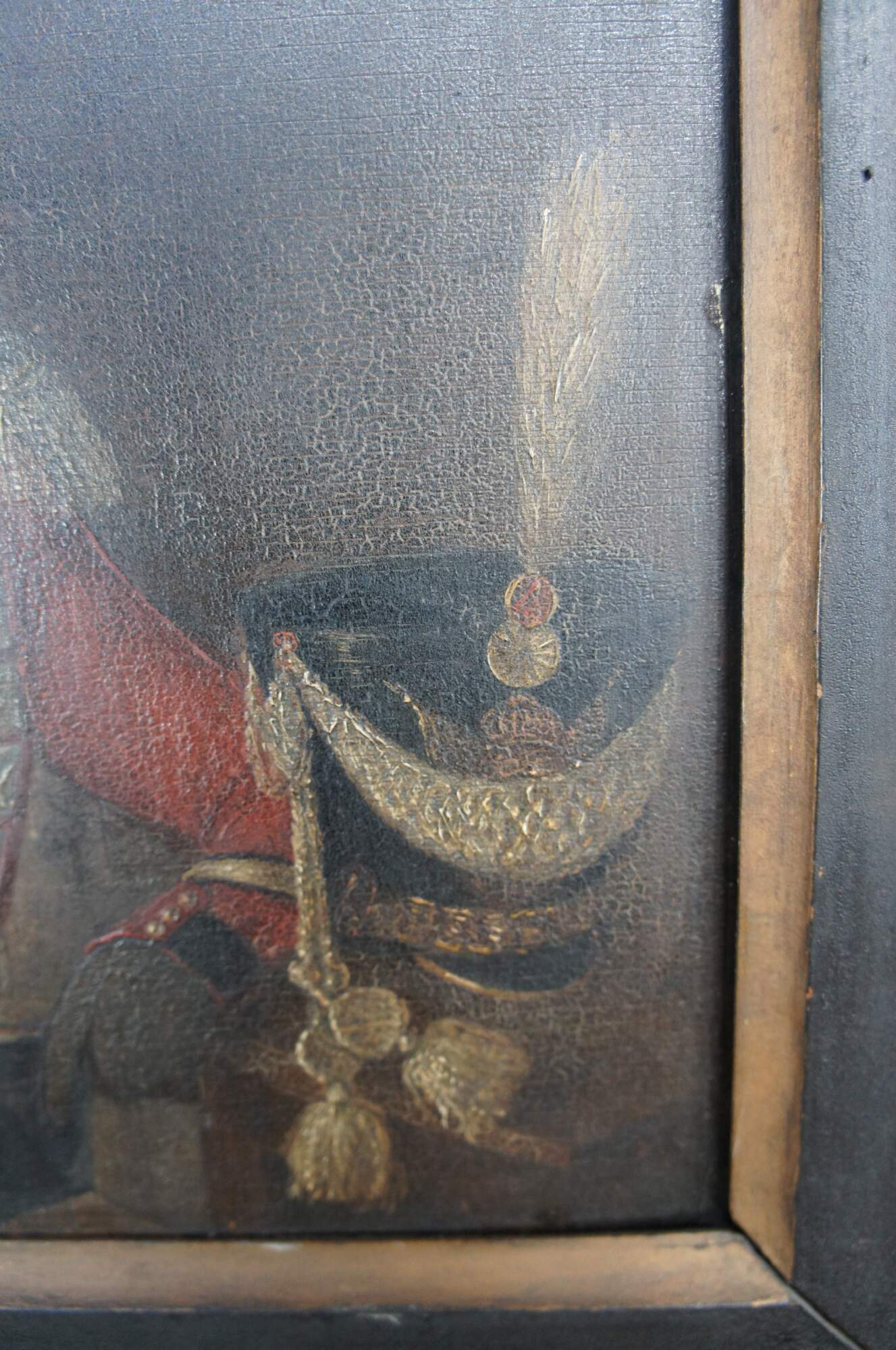 Antique French portrait oil painting on board of 27 year old Swiss Sergeant Heinrich Blumer. Painted in Paris during the 1830 July Revolution that brought Louis-Philippe to the throne of France. It shows the young man dressed in a Napoleonic style military uniform posing next to his ornate Shako cap. Painted by German artist, circa 1830. Heinrich Blumer, Sergeant within the 8th royal guard regiment from Besenval (today's Switzerland area in the canton of Solothurn) under Carl the 10th in France, Drawn in Paris 1830, at age 27. He was back then a resident of Switzerland. The first 6 out of 8 regiments of the royal guards (in French: Garde Royale) consisted of elite soldiers of the French infantry. 2 out of 8 regiments (the 7th regiment and 8th regiment) were foreign regiments consisting of Swiss soldiers.