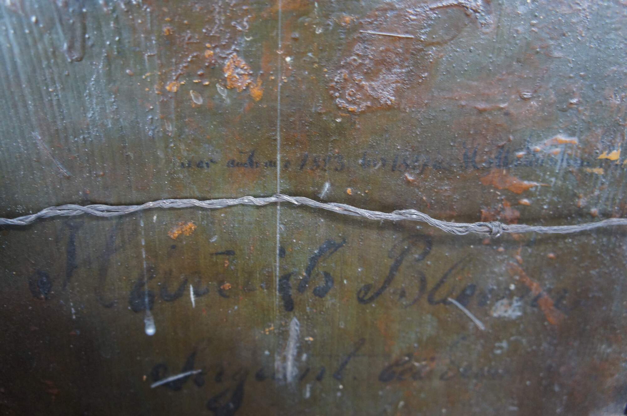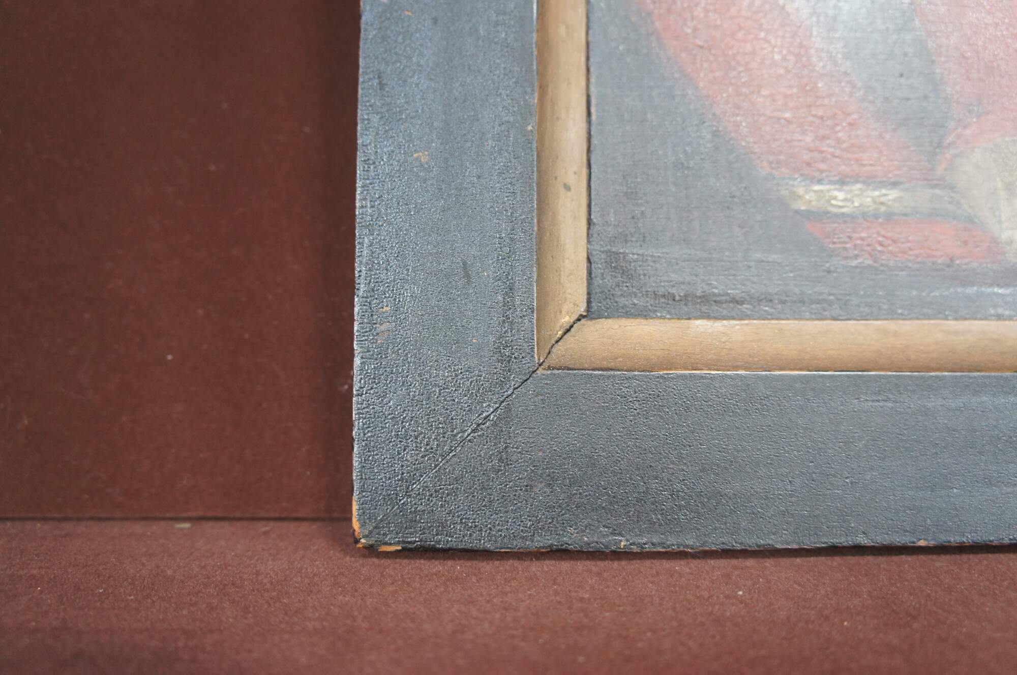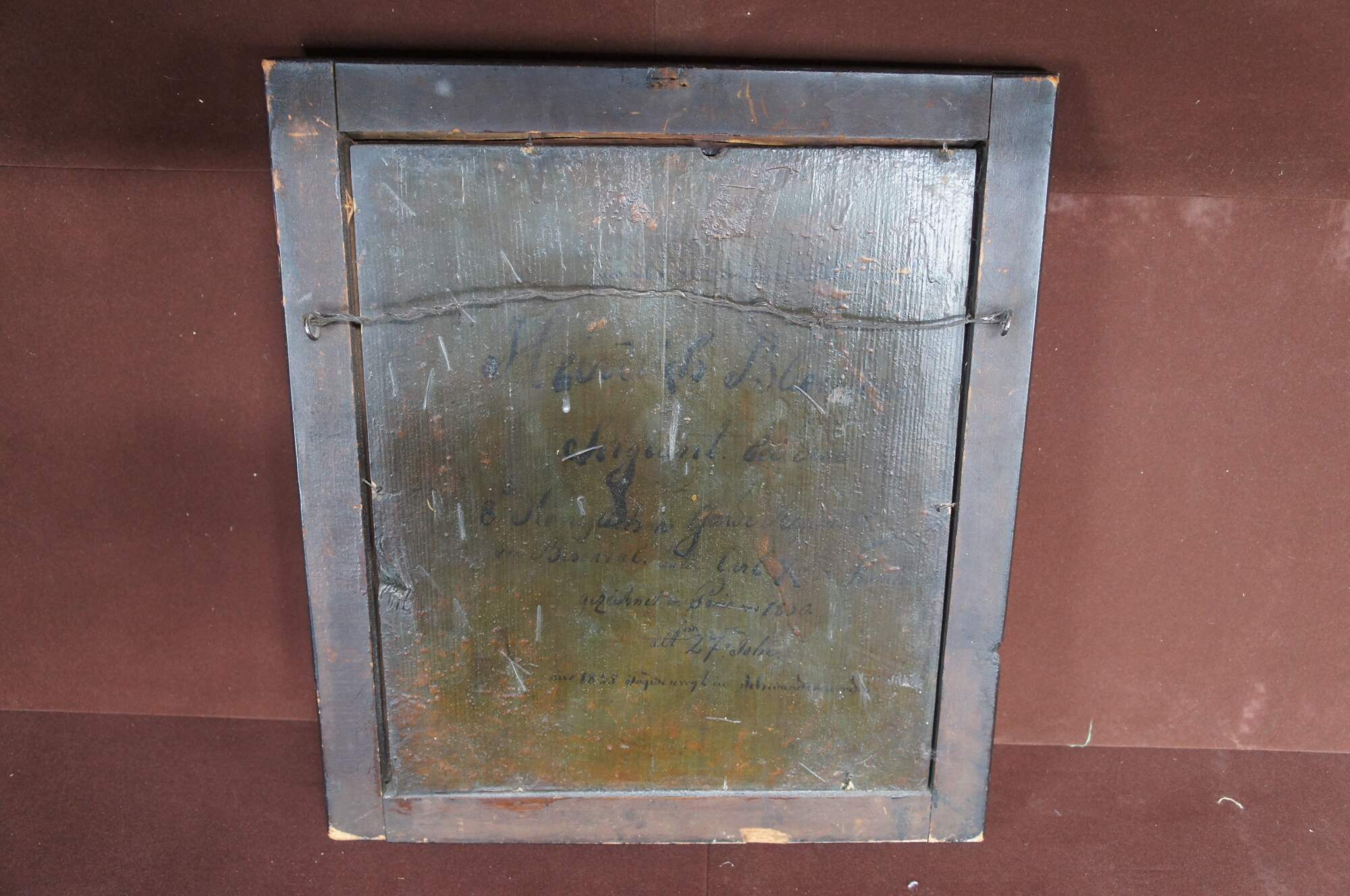 Fair condition, wear and distressing commensurate with age and use, splitting to board and frame, crazing, distressing, markings to verso.