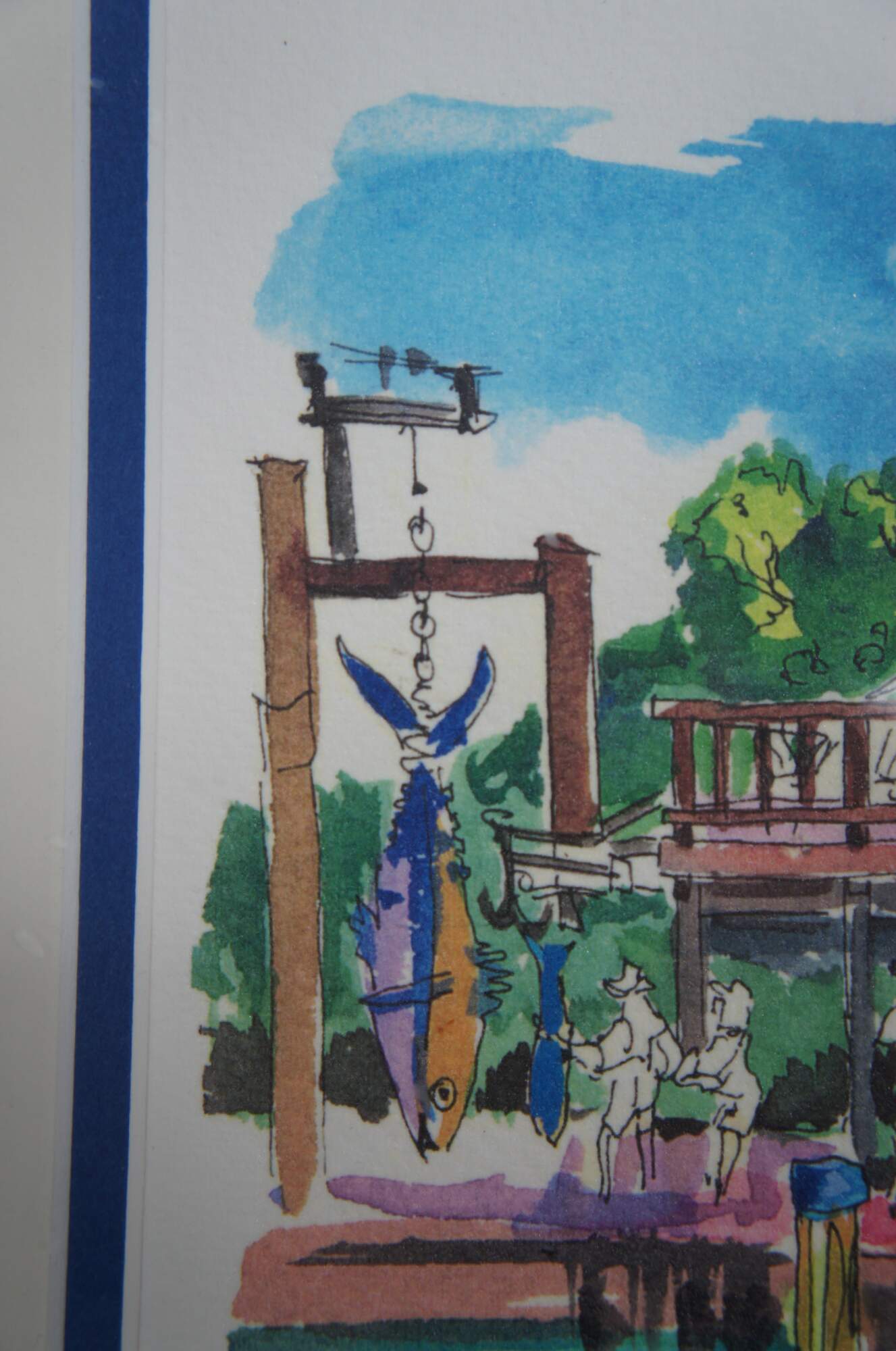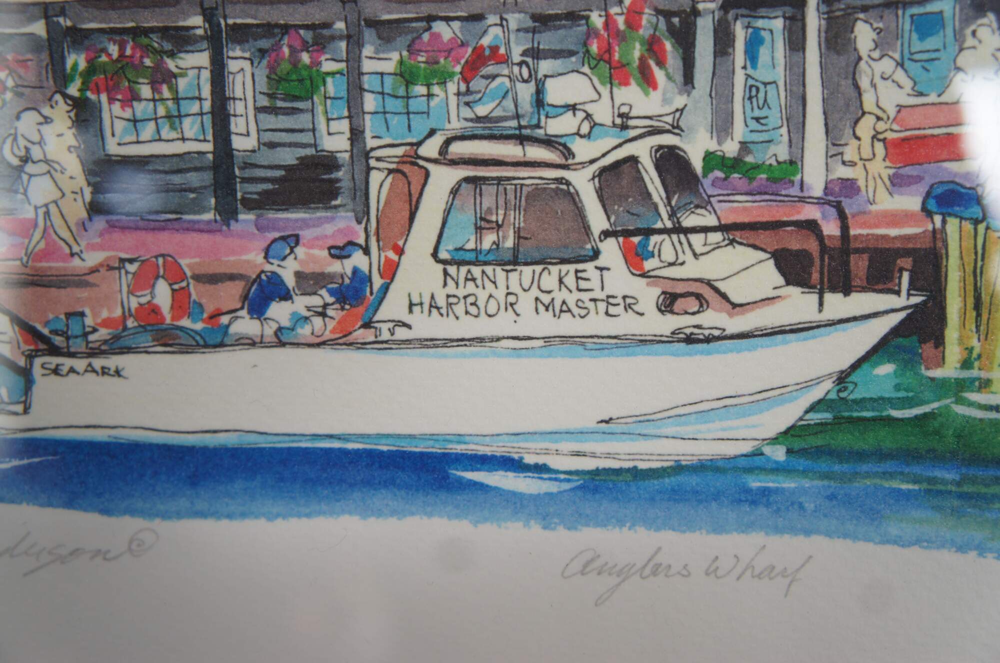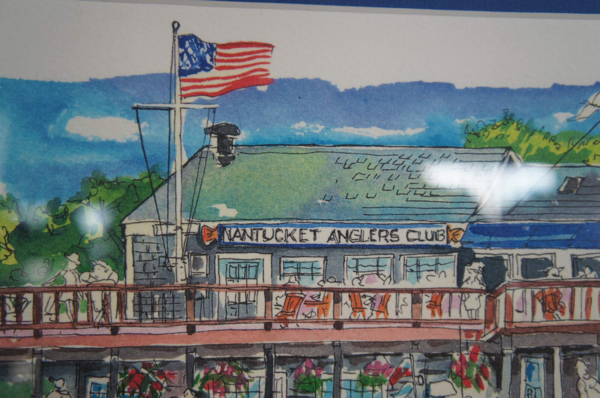 Vintage Pat Anderson nautical themed Giclee print featuring a view of the pier at Anglers Wharf featuring many business including, South Wharf Gallery, Eric Holch Gallery, Nantucket Ship Chandlery, Nantucket Anglers Club, and the Nantucket SeaArk Harbor Master boat. A large tuna hangs from the fish dock and anchors are cut from the matting.