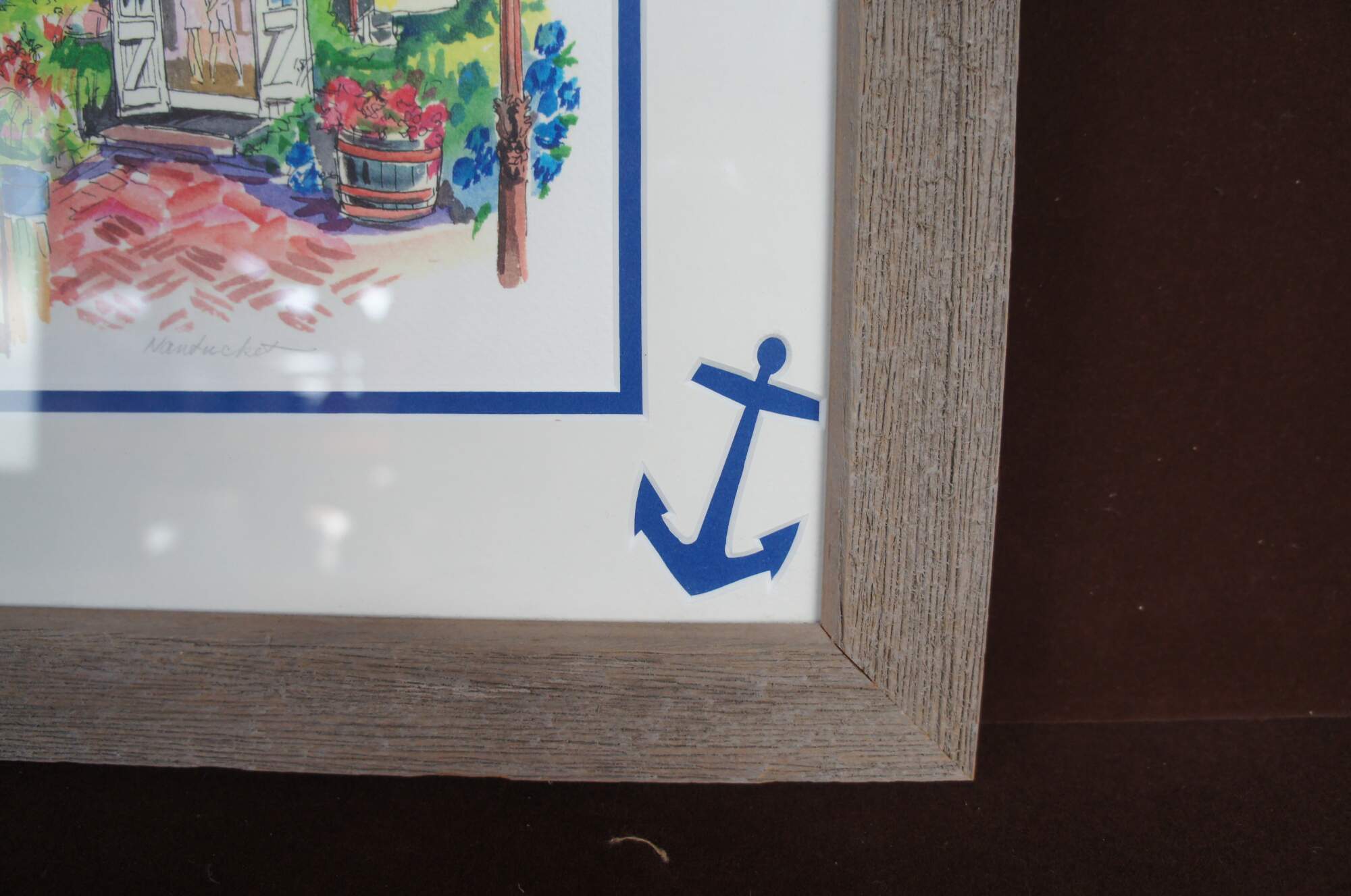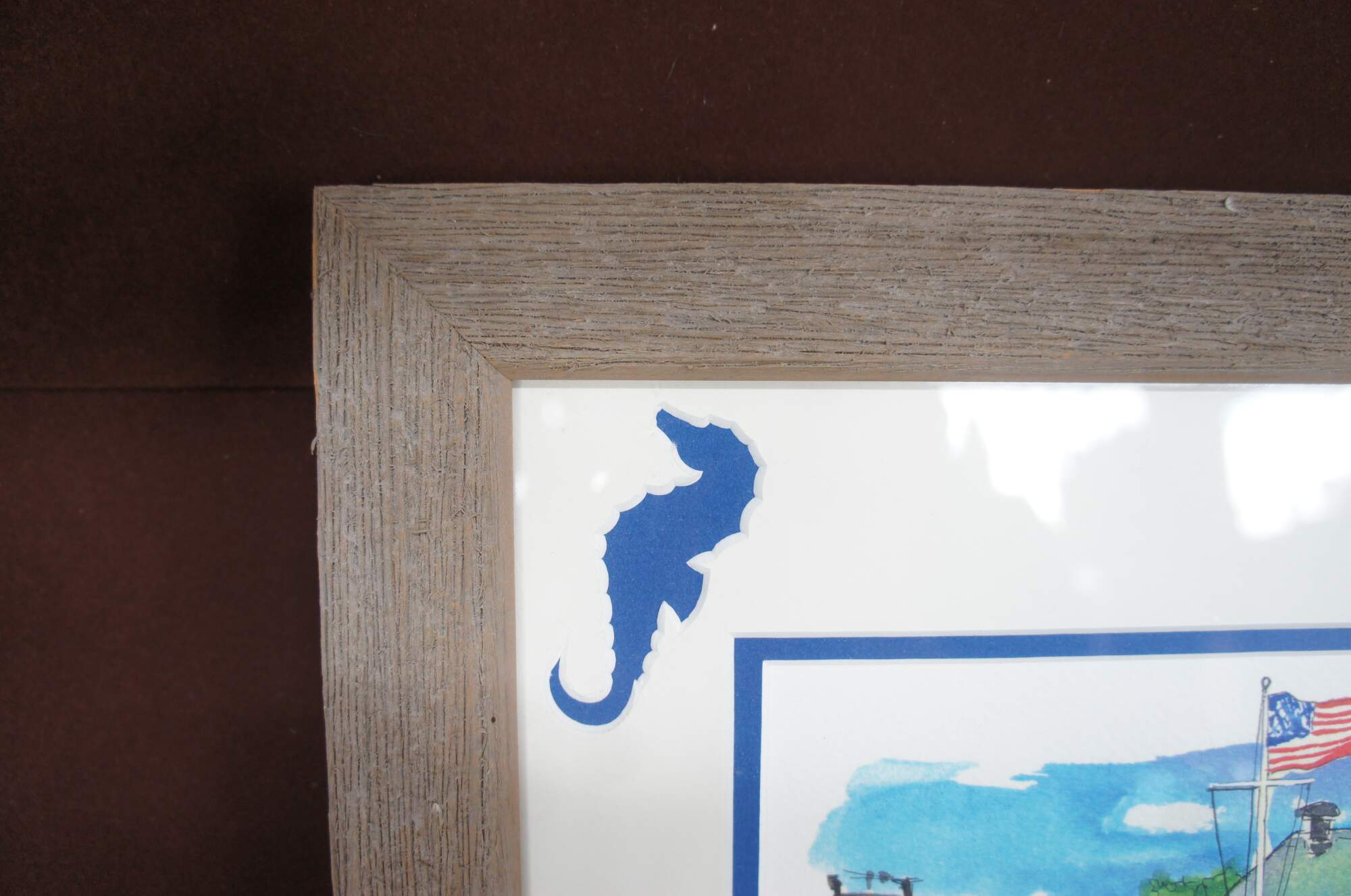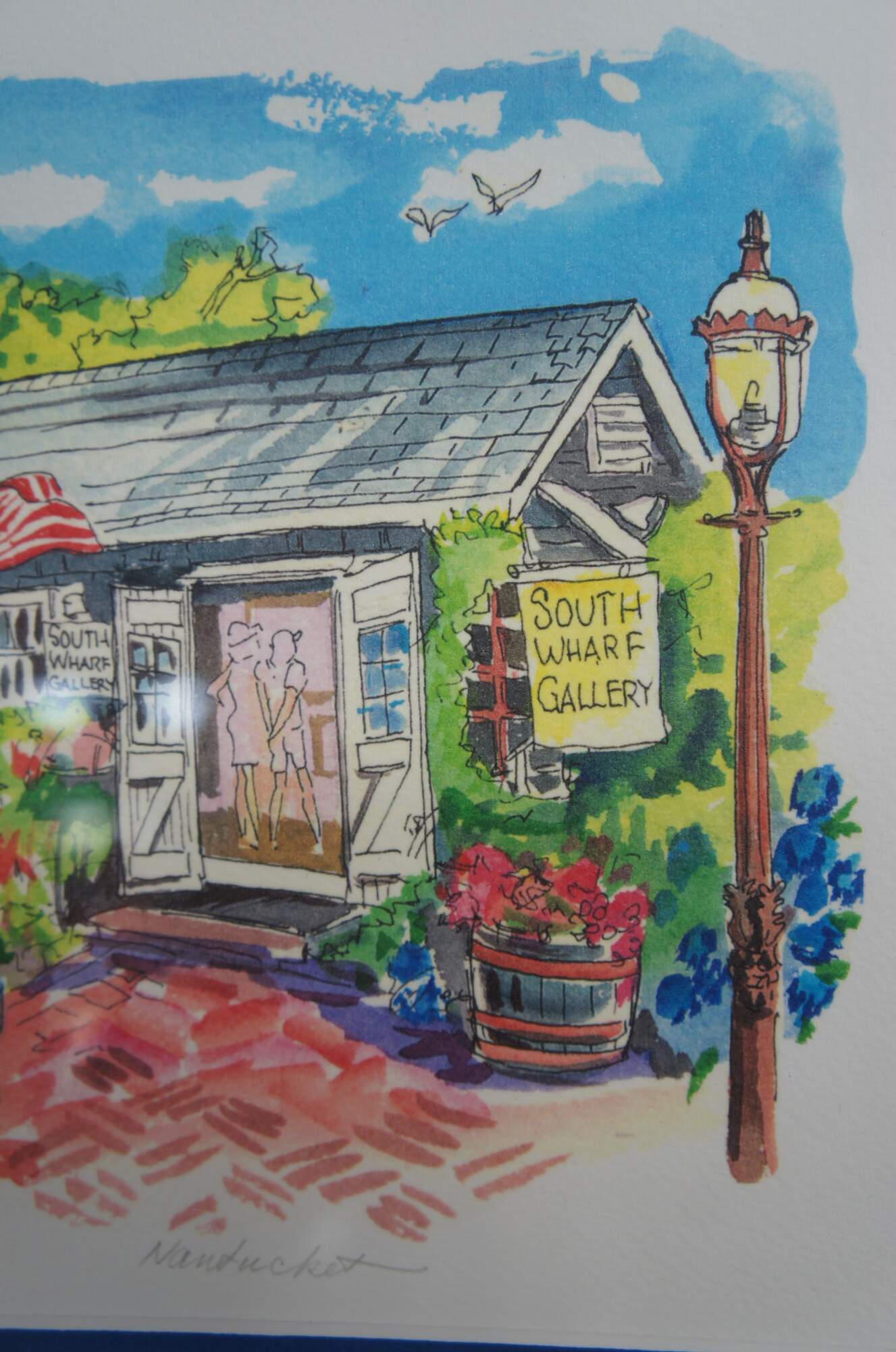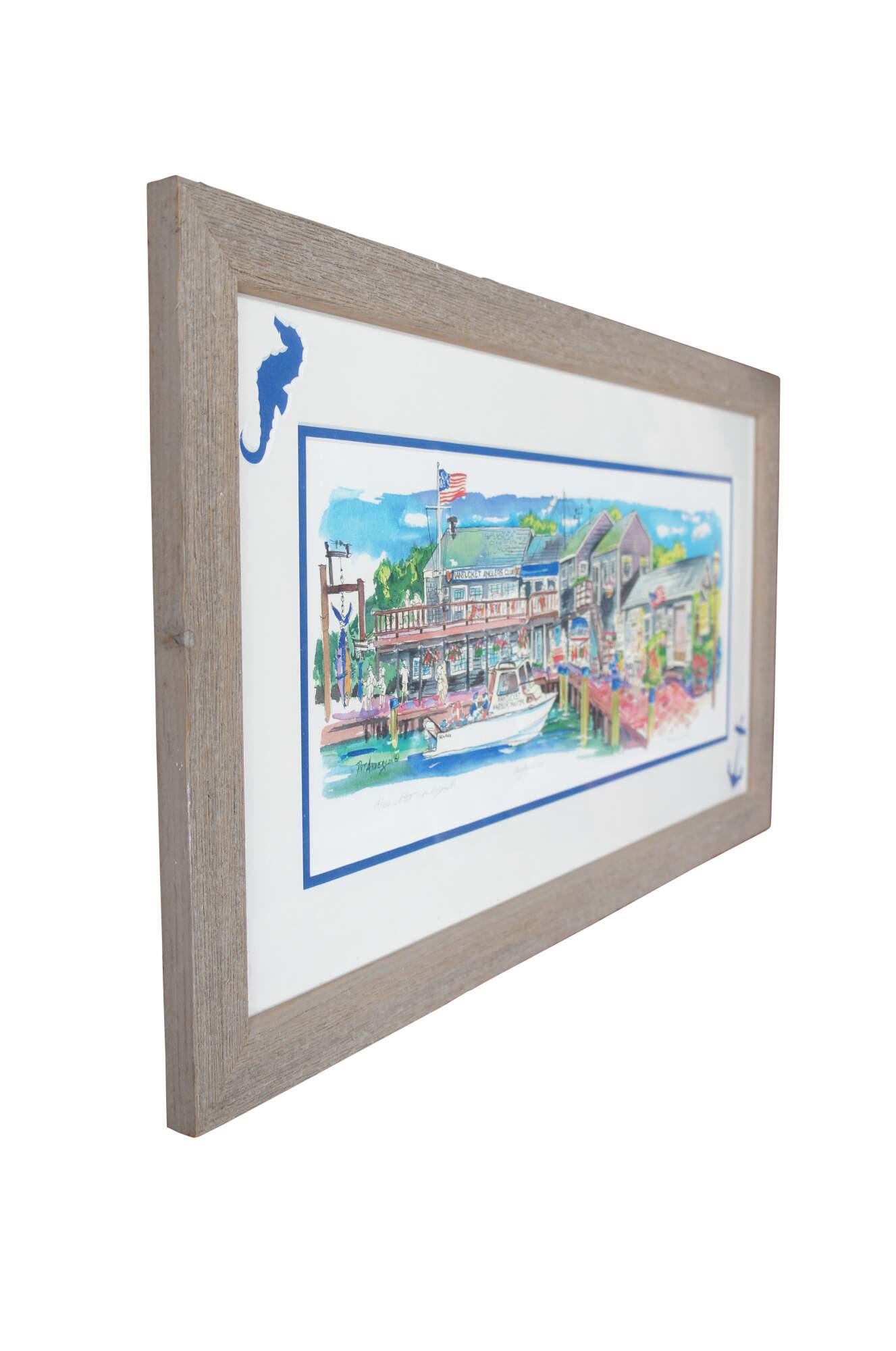 Vintage Pat Anderson nautical themed Giclee print featuring a view of the pier at Anglers Wharf featuring many business including, South Wharf Gallery, Eric Holch Gallery, Nantucket Ship Chandlery, Nantucket Anglers Club, and the Nantucket SeaArk Harbor Master boat. A large tuna hangs from the fish dock and anchors are cut from the matting.