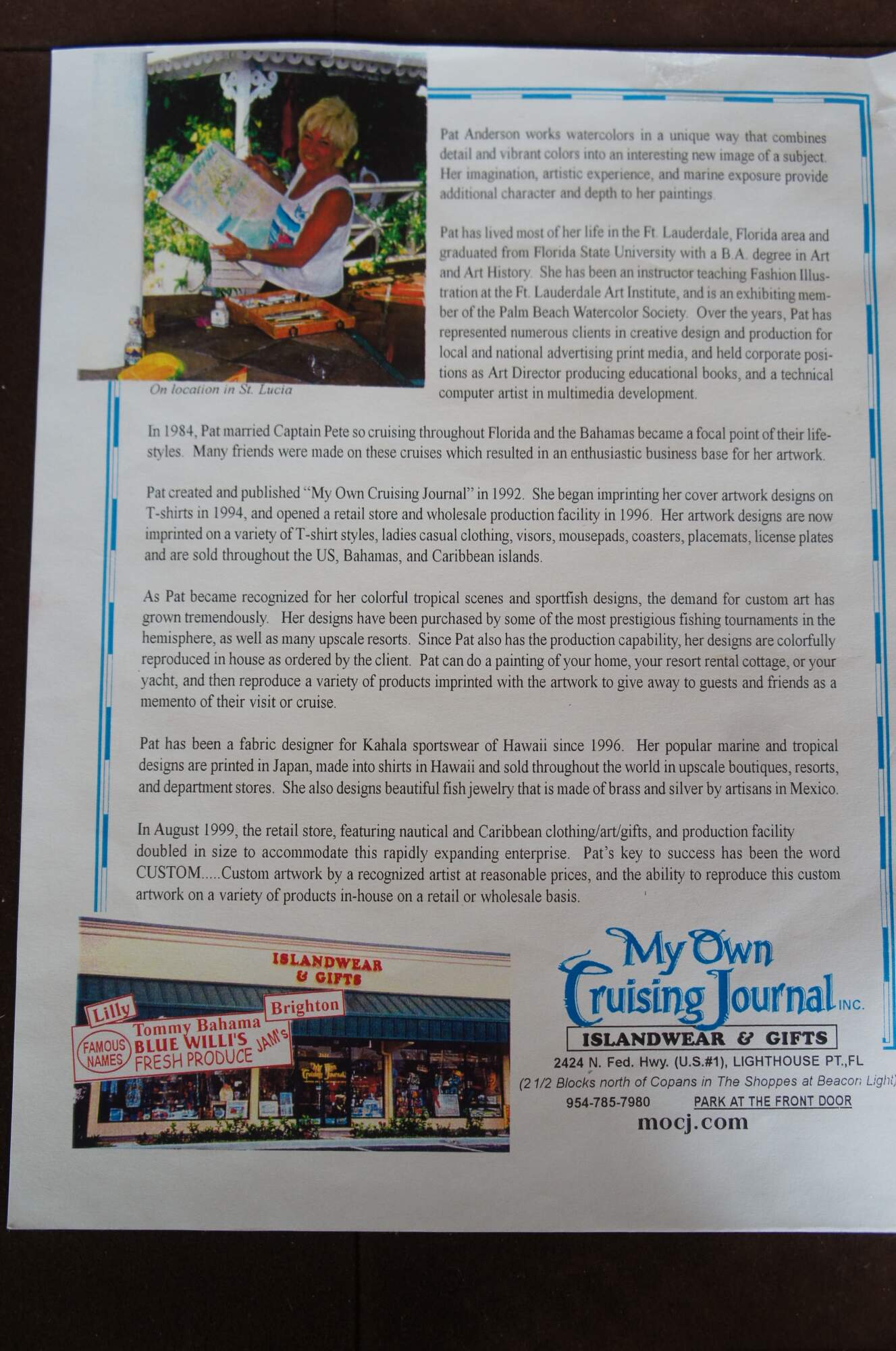 Pat created and published “My Own Cruising Journal,” an actual journal of her artwork while cruising together on their yacht, in 1992, and expanded this cover design onto a variety of garments and merchandise.