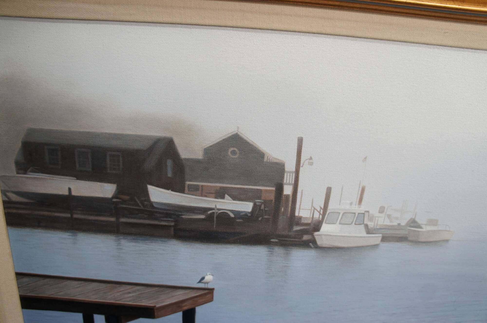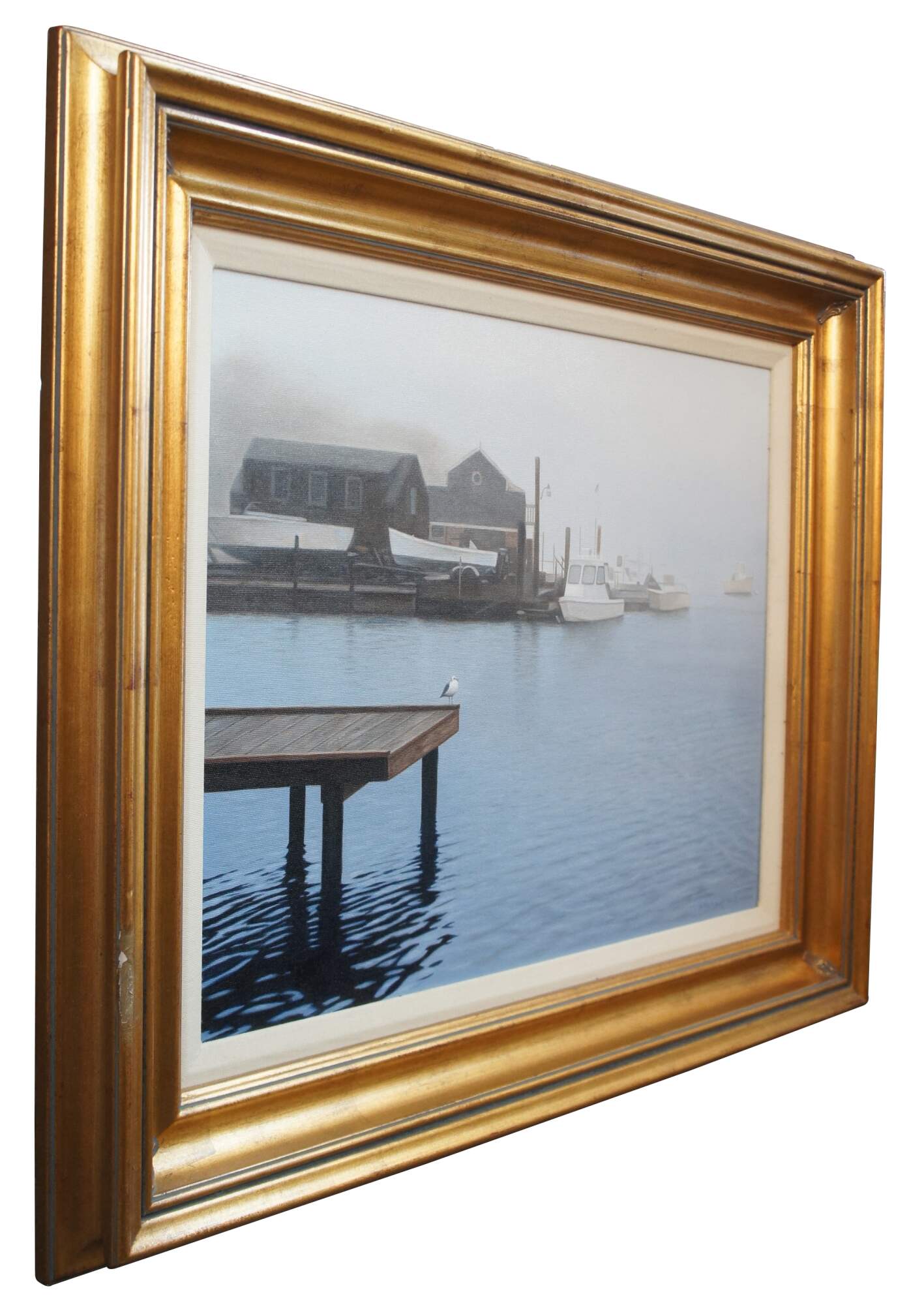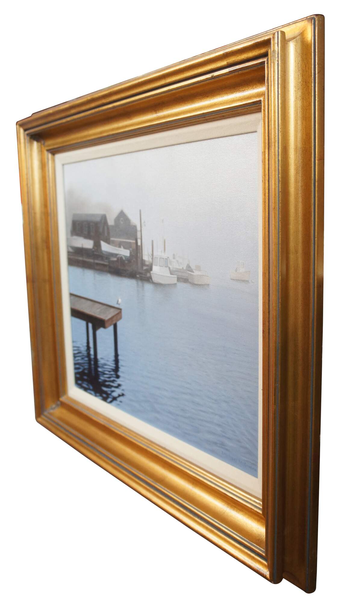 Vintage Michael McGovern ""Foggy Morning"" nautical seascape oil painting featuring sailboats / boats docked at harbor. Circa 2000.