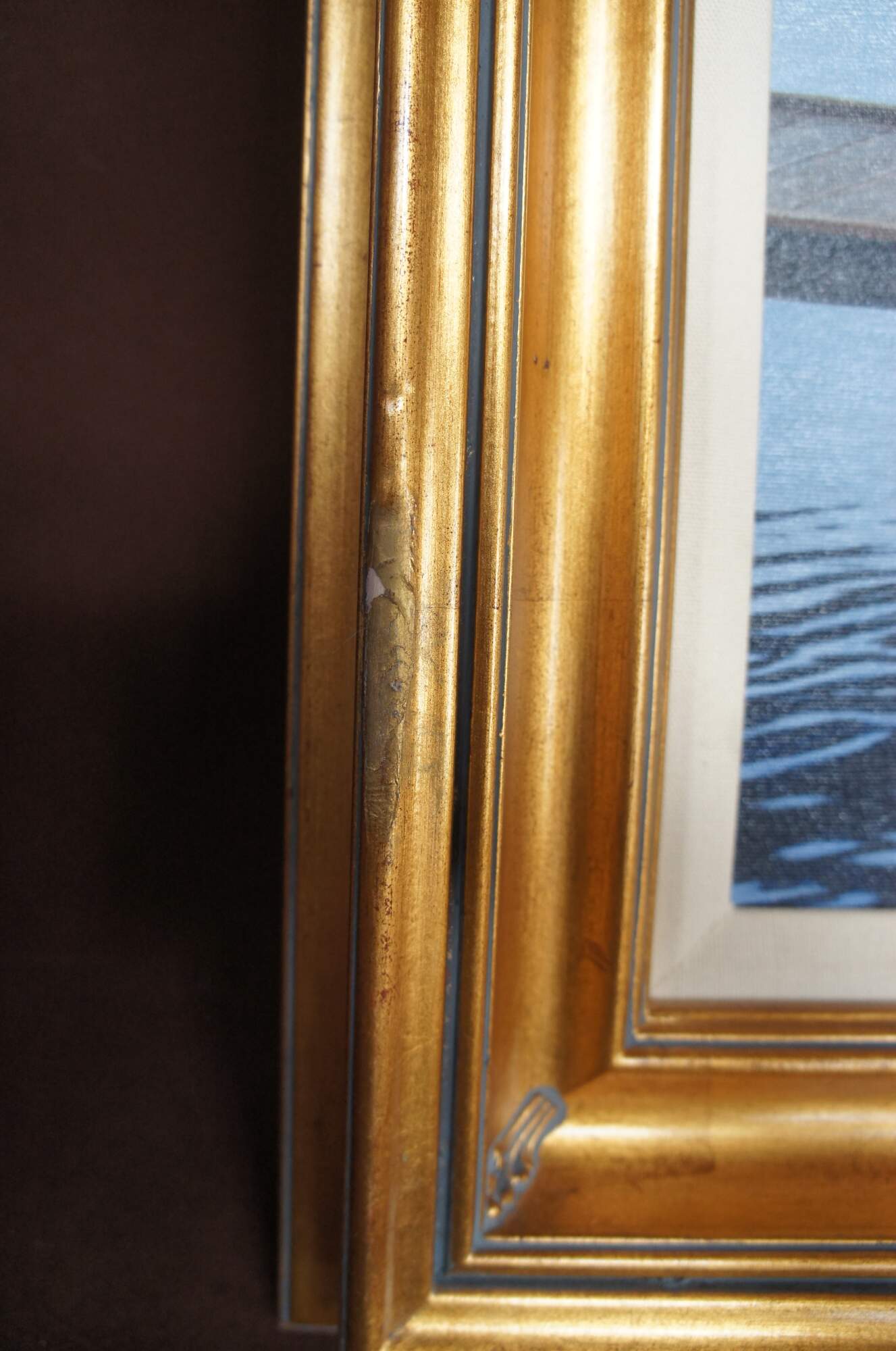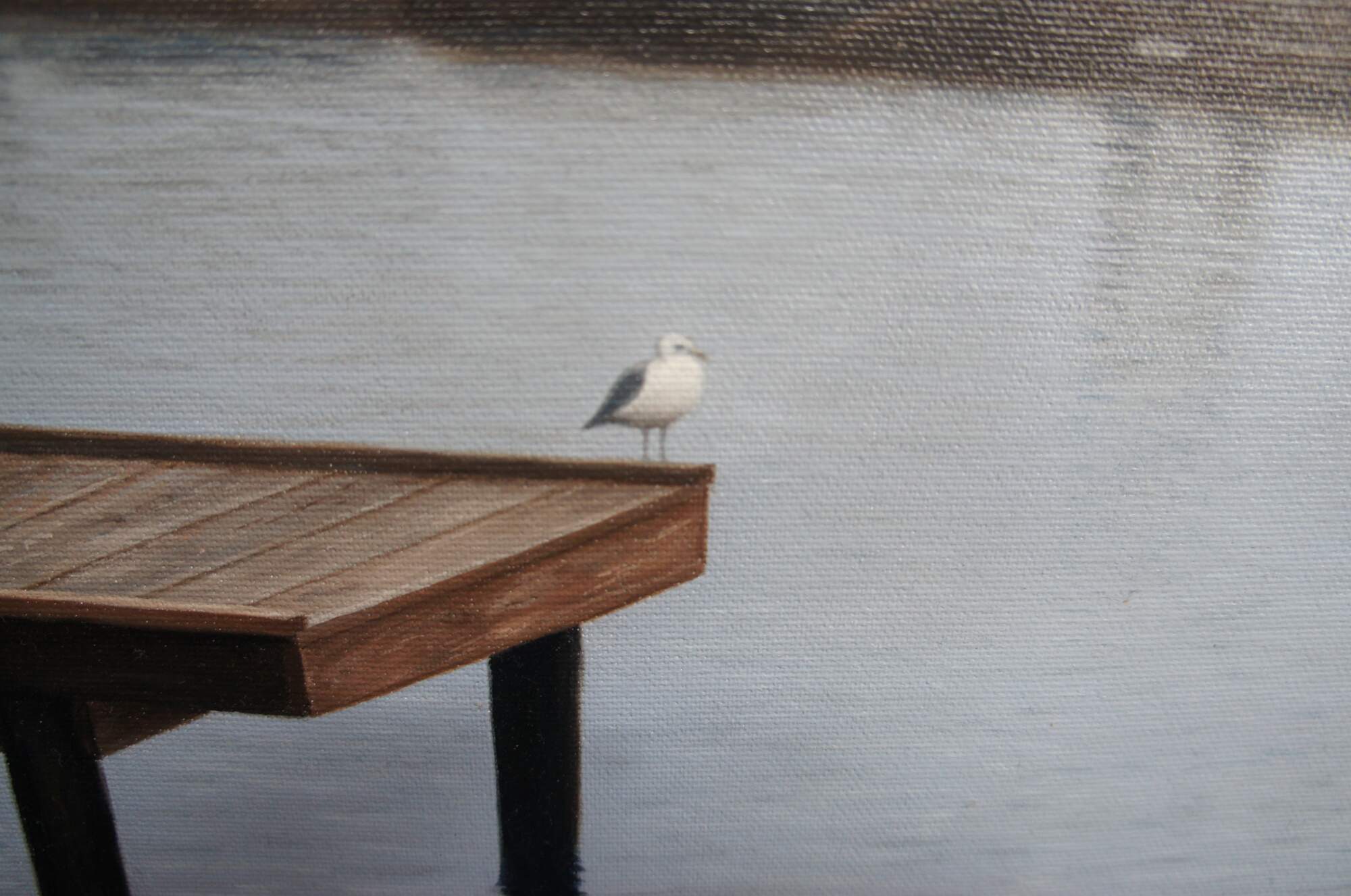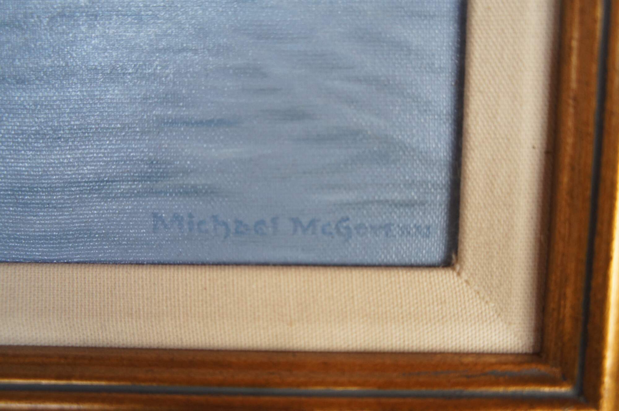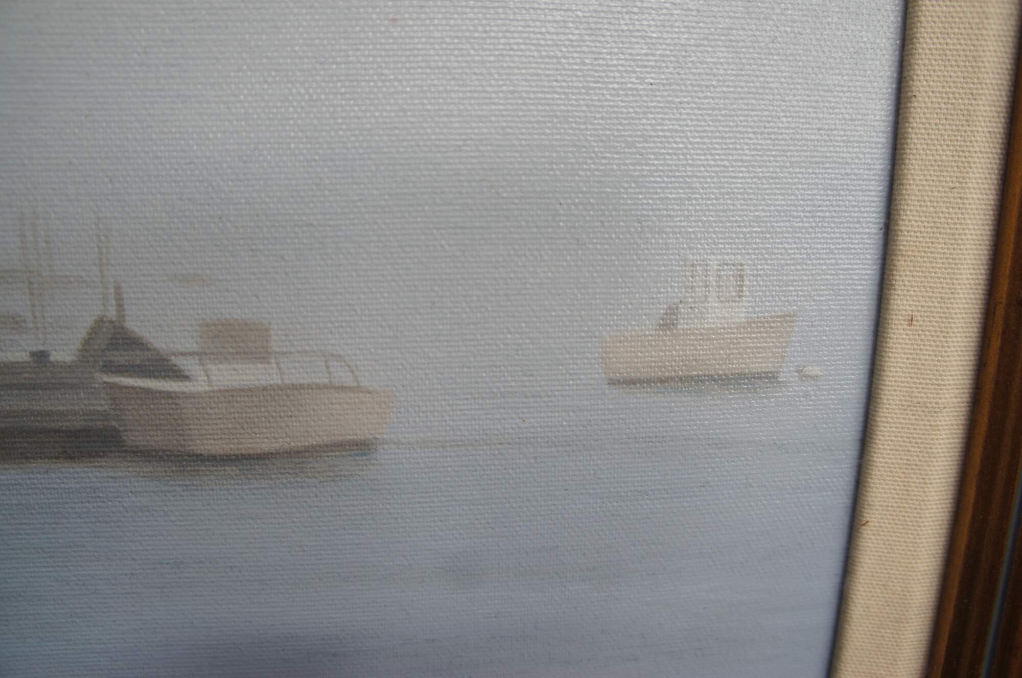 Vintage Michael McGovern ""Foggy Morning"" nautical seascape oil painting featuring sailboats / boats docked at harbor. Circa 2000.