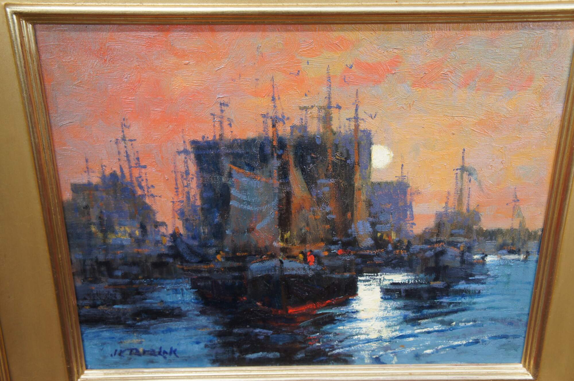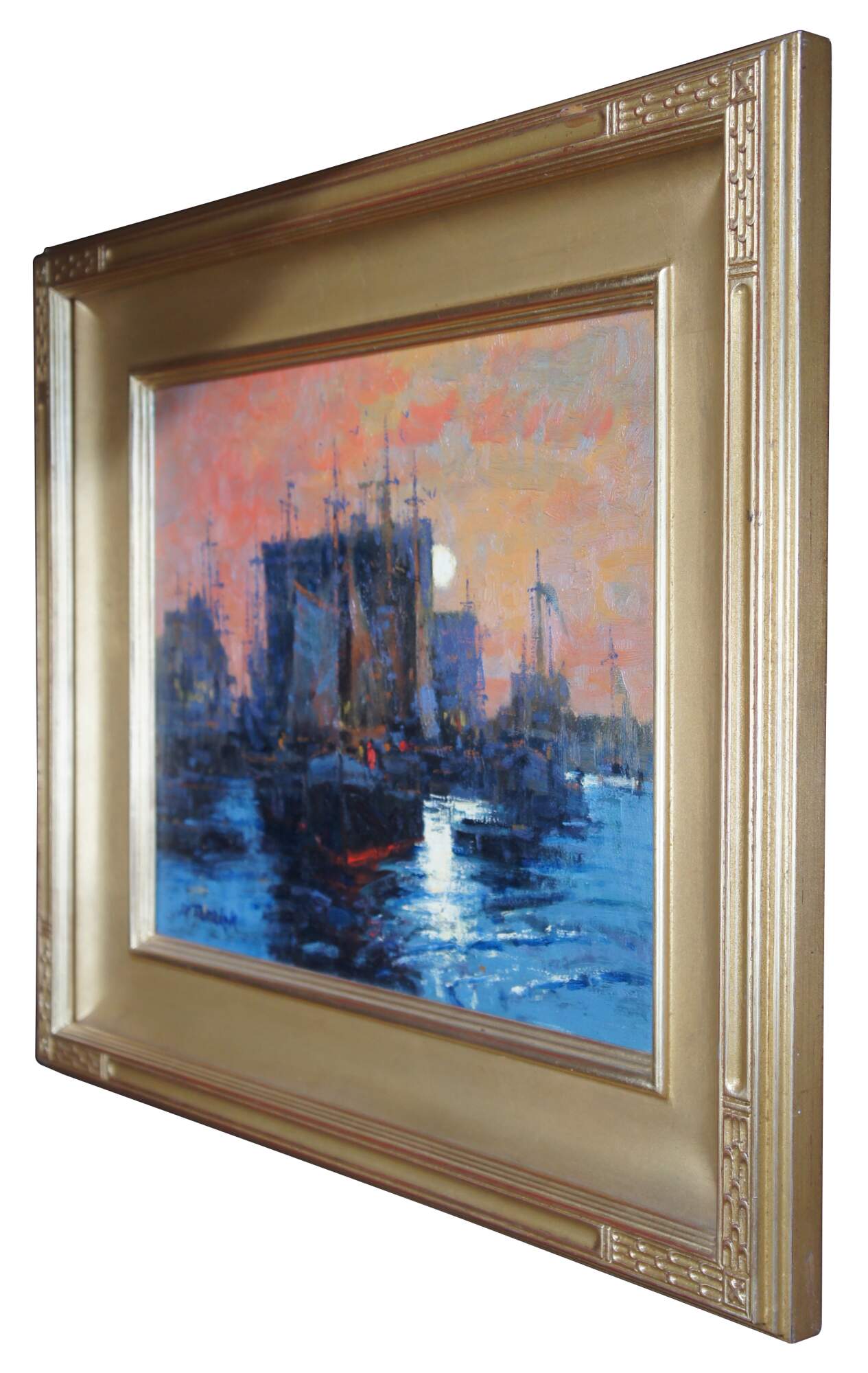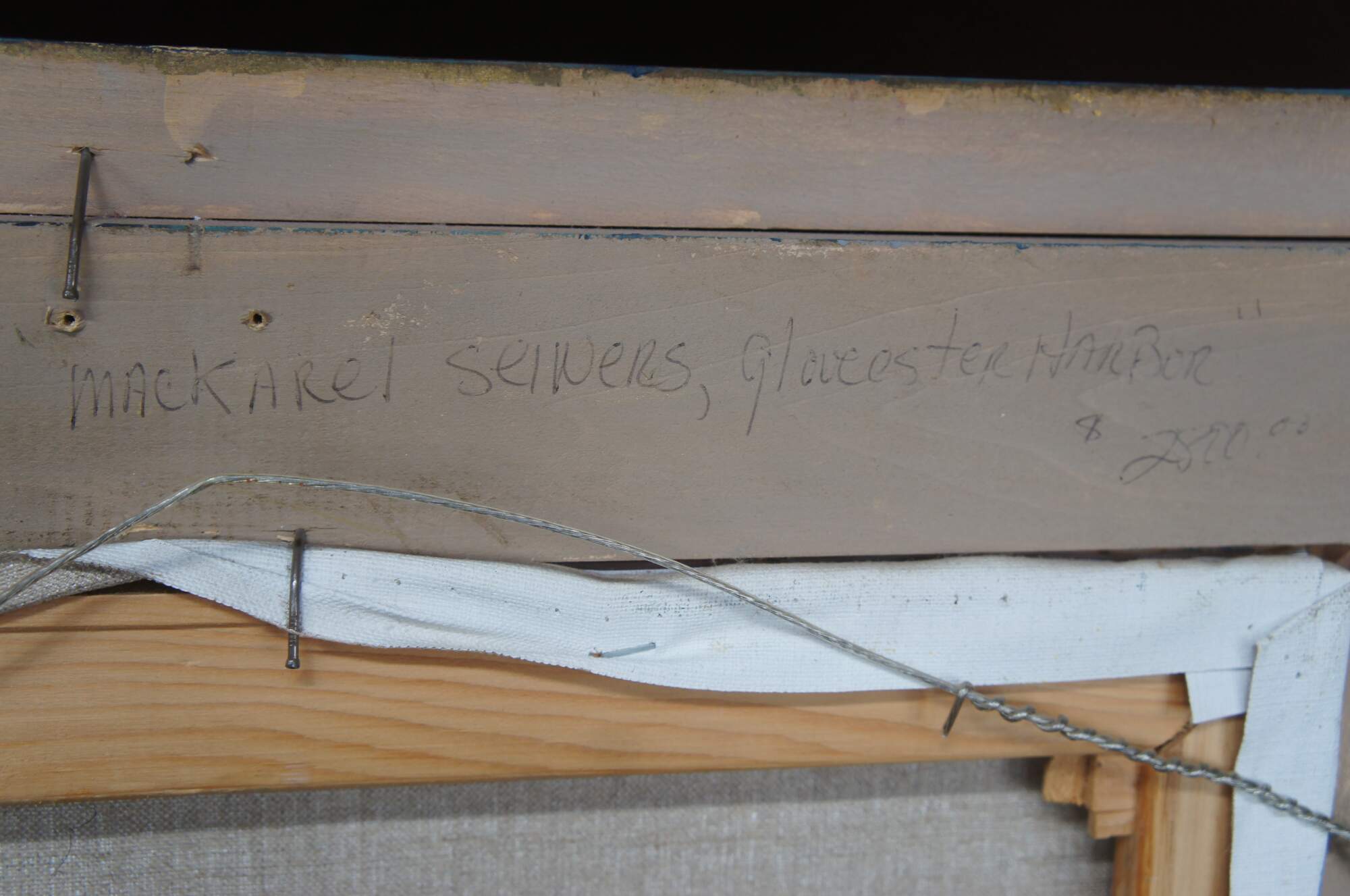 Vintage nautical maritime impressionist seascape painting featuring Mackerel Seiner boats on Gloucester Harbor by John C Terelak. Gloucester Harbor is a major fishing port and a popular recreational area located in Gloucester on the south side of Cape Ann, about 25 miles northeast of Boston, Massachusetts. Seiners use surrounding or roundhaul nets, such as purse seines and lampara nets, to surround schools of pelagic fish near the surface. Like other modern vessels, seiners can vary by the types of equipment that are used and the geographical region in which they are used. Signed lower left, framed in gold