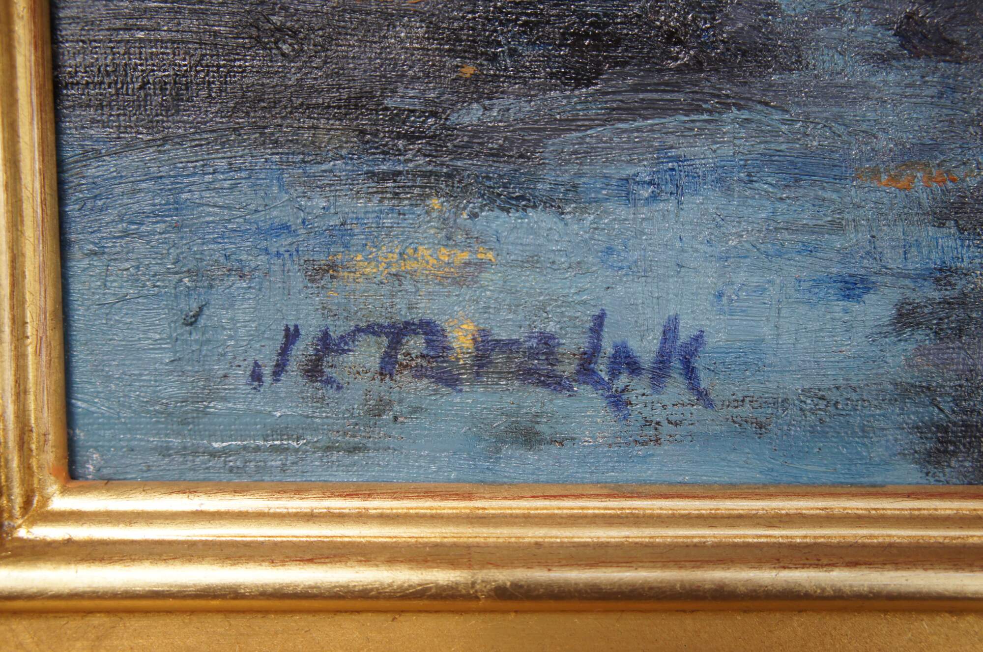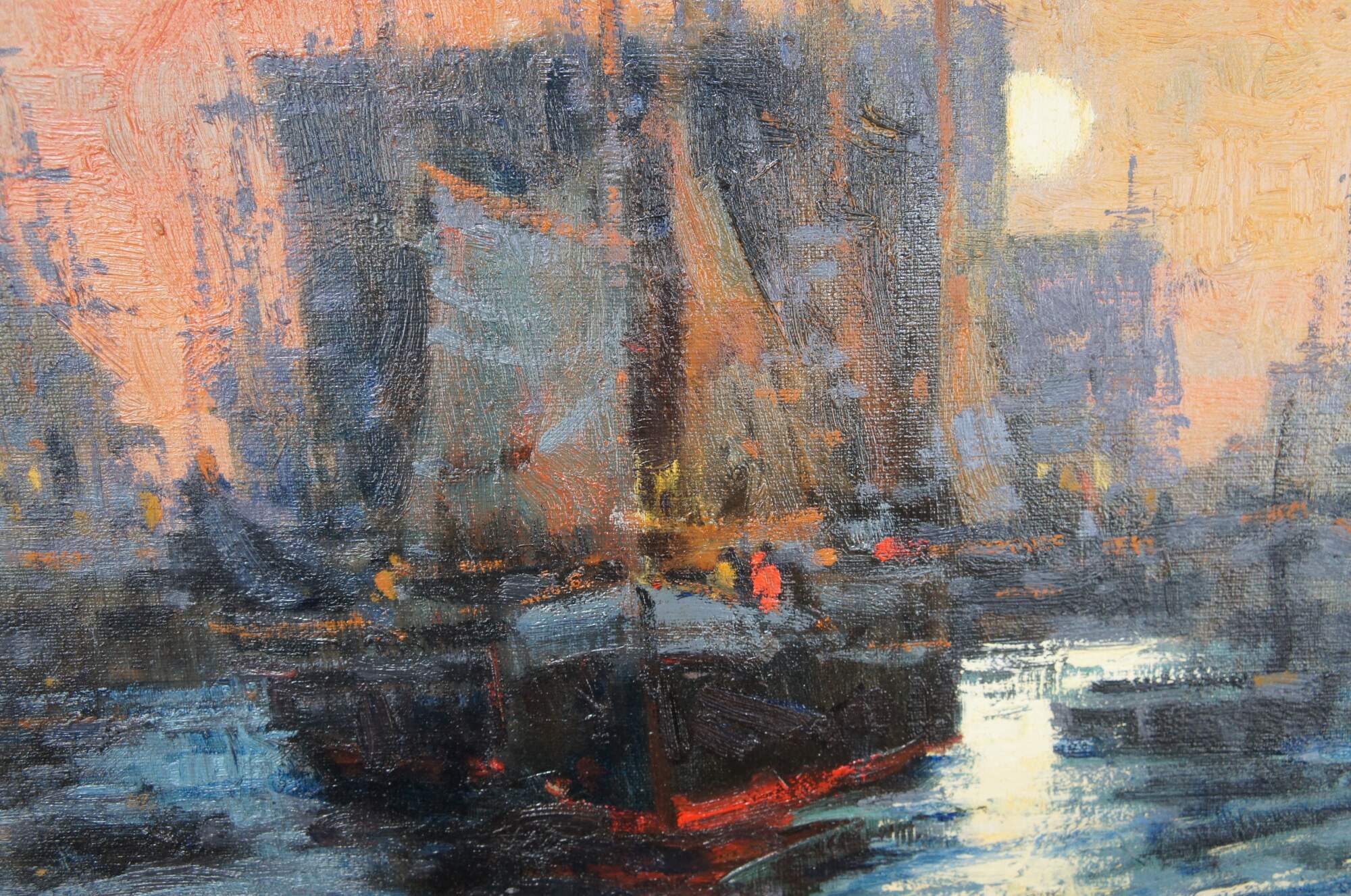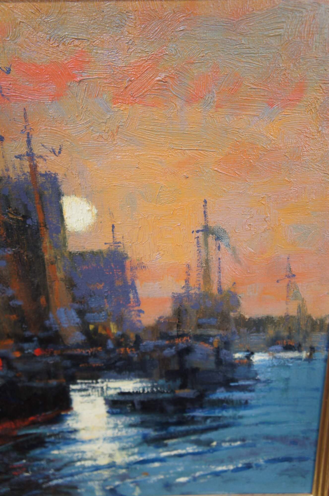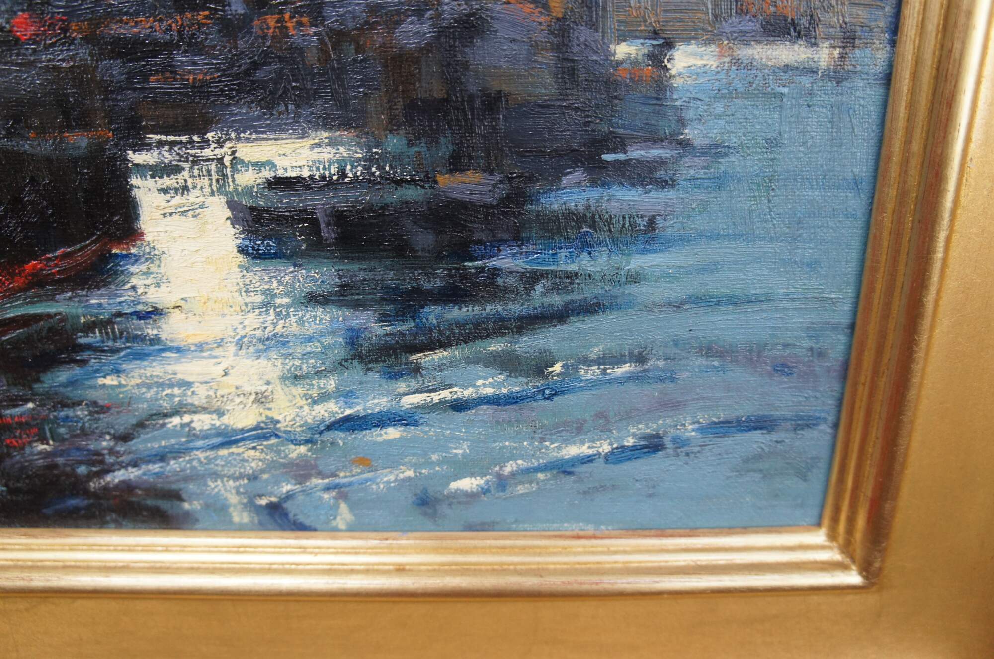 Vintage nautical maritime impressionist seascape painting featuring Mackerel Seiner boats on Gloucester Harbor by John C Terelak. Gloucester Harbor is a major fishing port and a popular recreational area located in Gloucester on the south side of Cape Ann, about 25 miles northeast of Boston, Massachusetts. Seiners use surrounding or roundhaul nets, such as purse seines and lampara nets, to surround schools of pelagic fish near the surface. Like other modern vessels, seiners can vary by the types of equipment that are used and the geographical region in which they are used. Signed lower left, framed in gold
