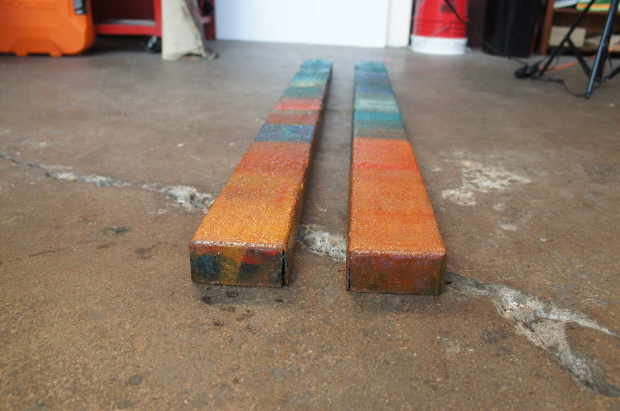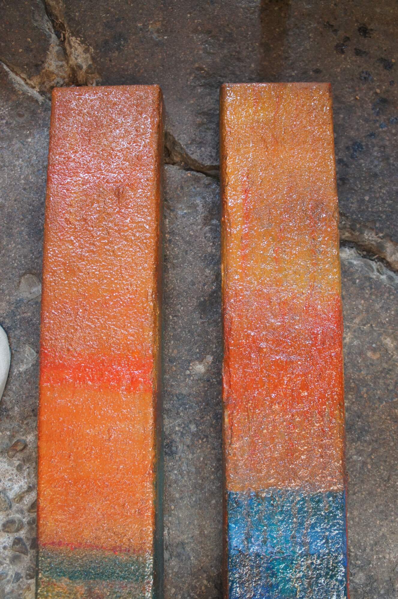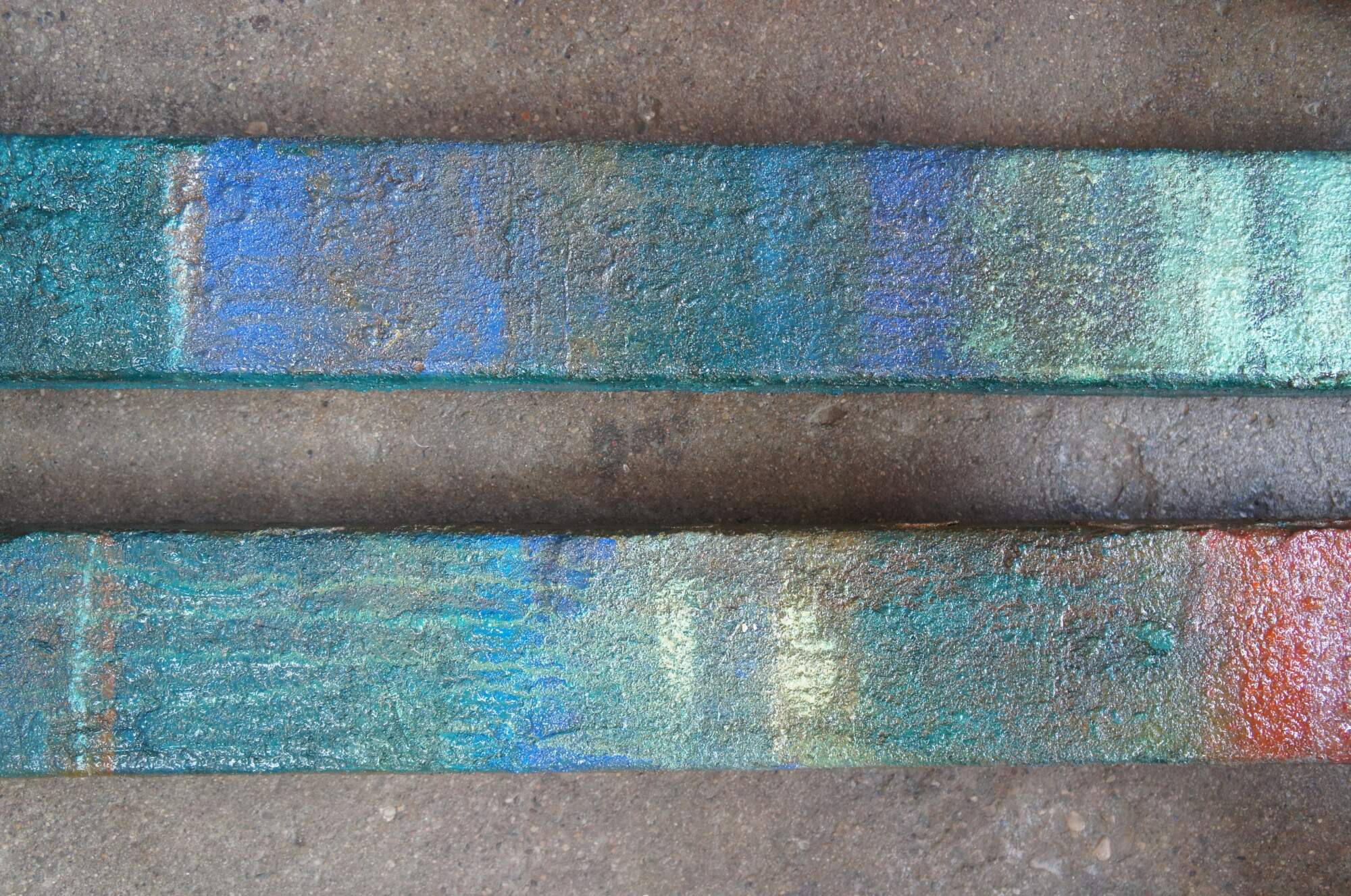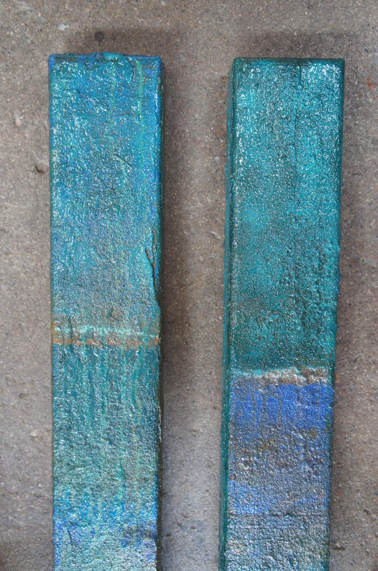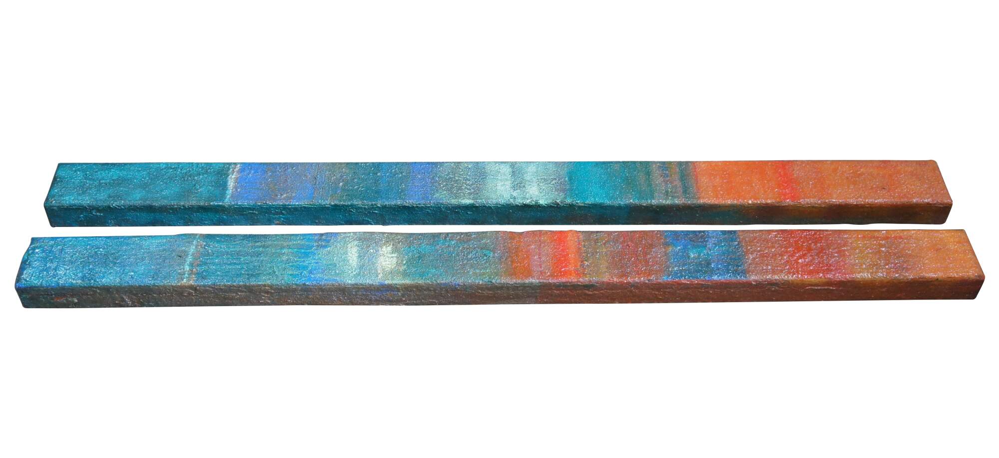 Vintage industrial mixed media abstract / modern diptych wall art sculptures. Made of heavy gauge metal / iron and bent into rectangular columns or bars that can be displayed vertically or horizontally. Features a blue turquoise painted ground with a sunset of tropical and boho colors.