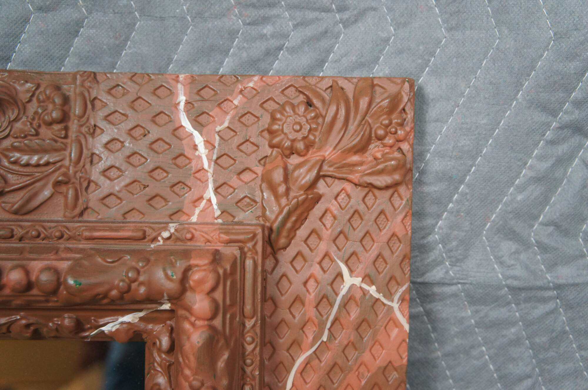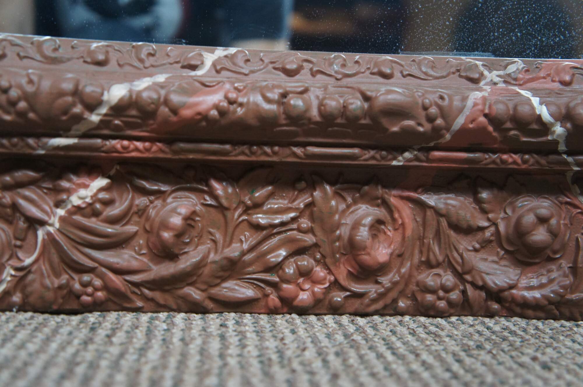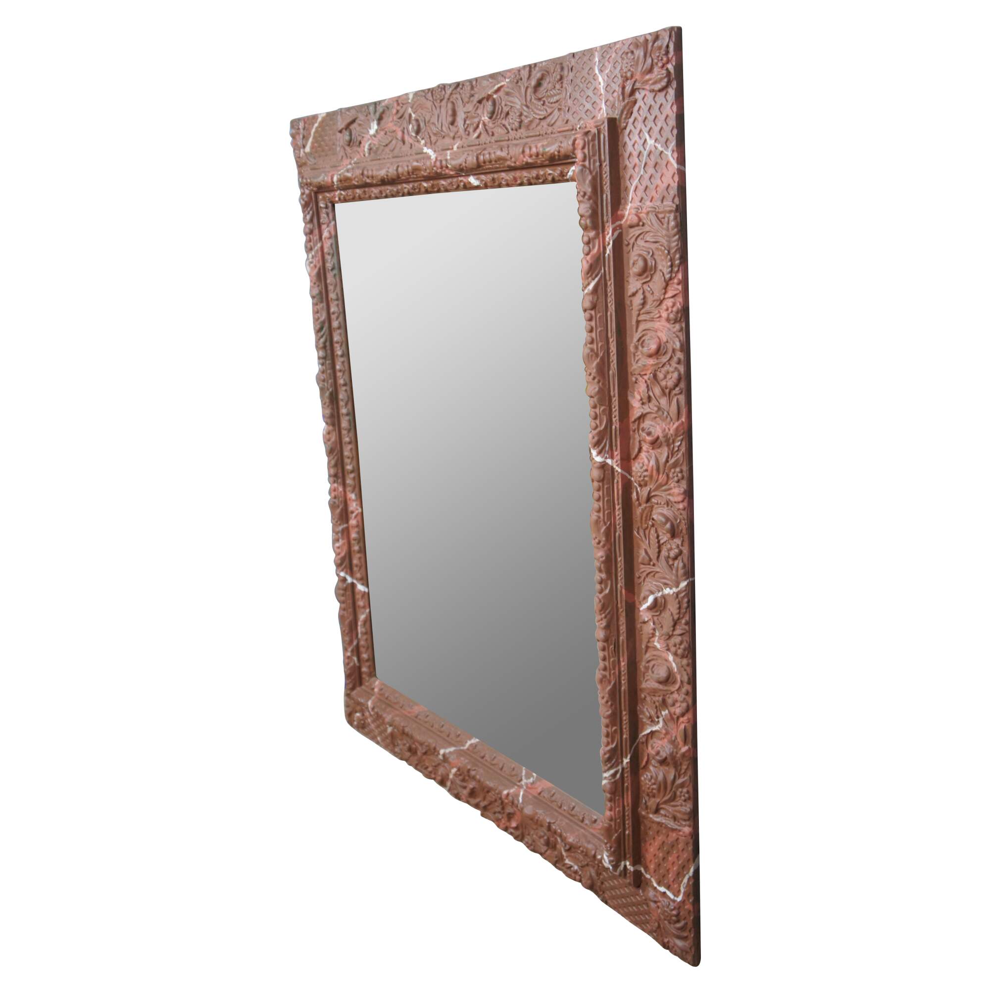 An elegant Victorian wall hanging mirror. Made from oak with a uniquely carved frame featuring layers of foliate, beading and lattice accents. The mirror was painted towards the end of the 20th century with a marbled patina.