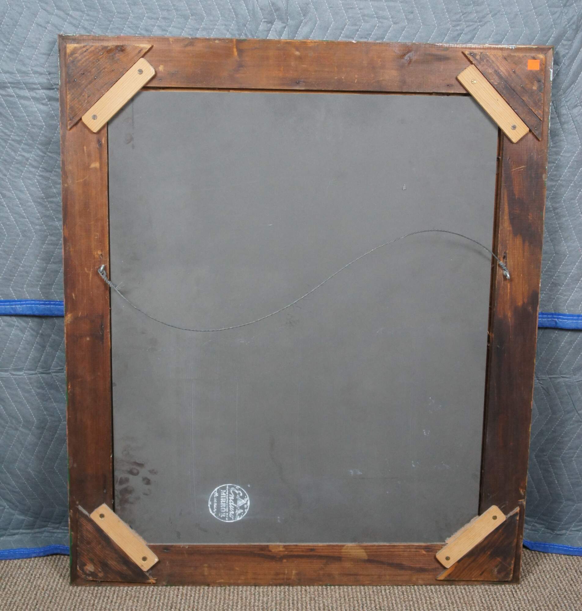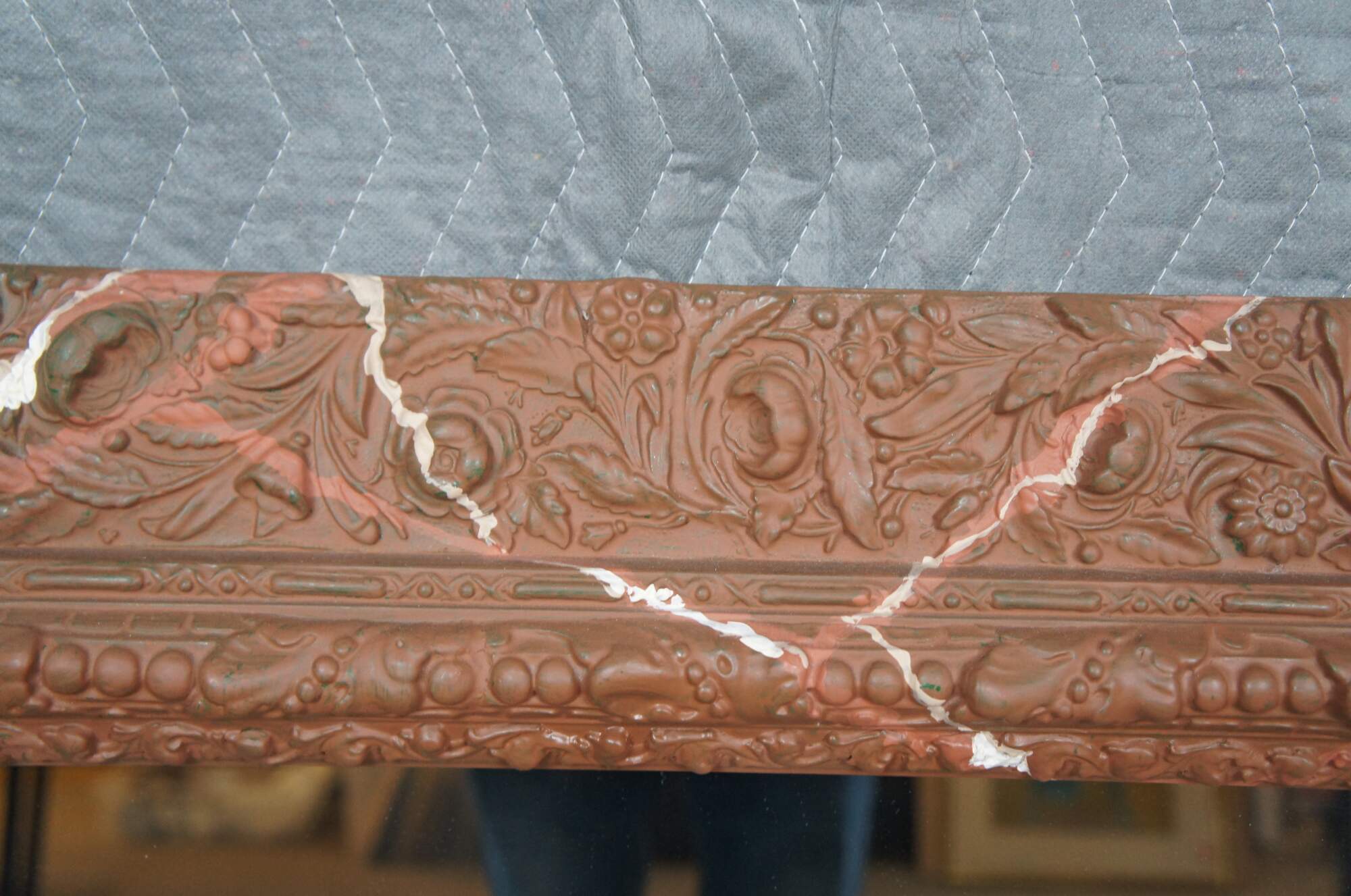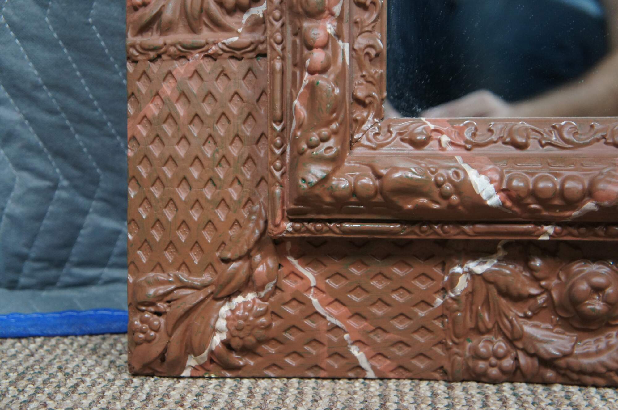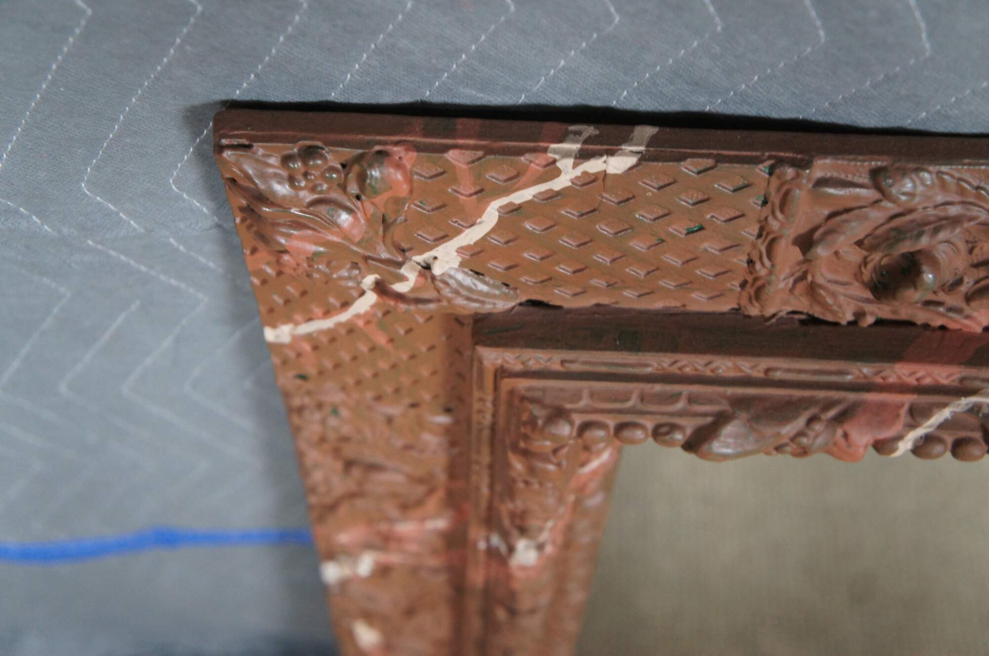 An elegant Victorian wall hanging mirror. Made from oak with a uniquely carved frame featuring layers of foliate, beading and lattice accents. The mirror was painted towards the end of the 20th century with a marbled patina.