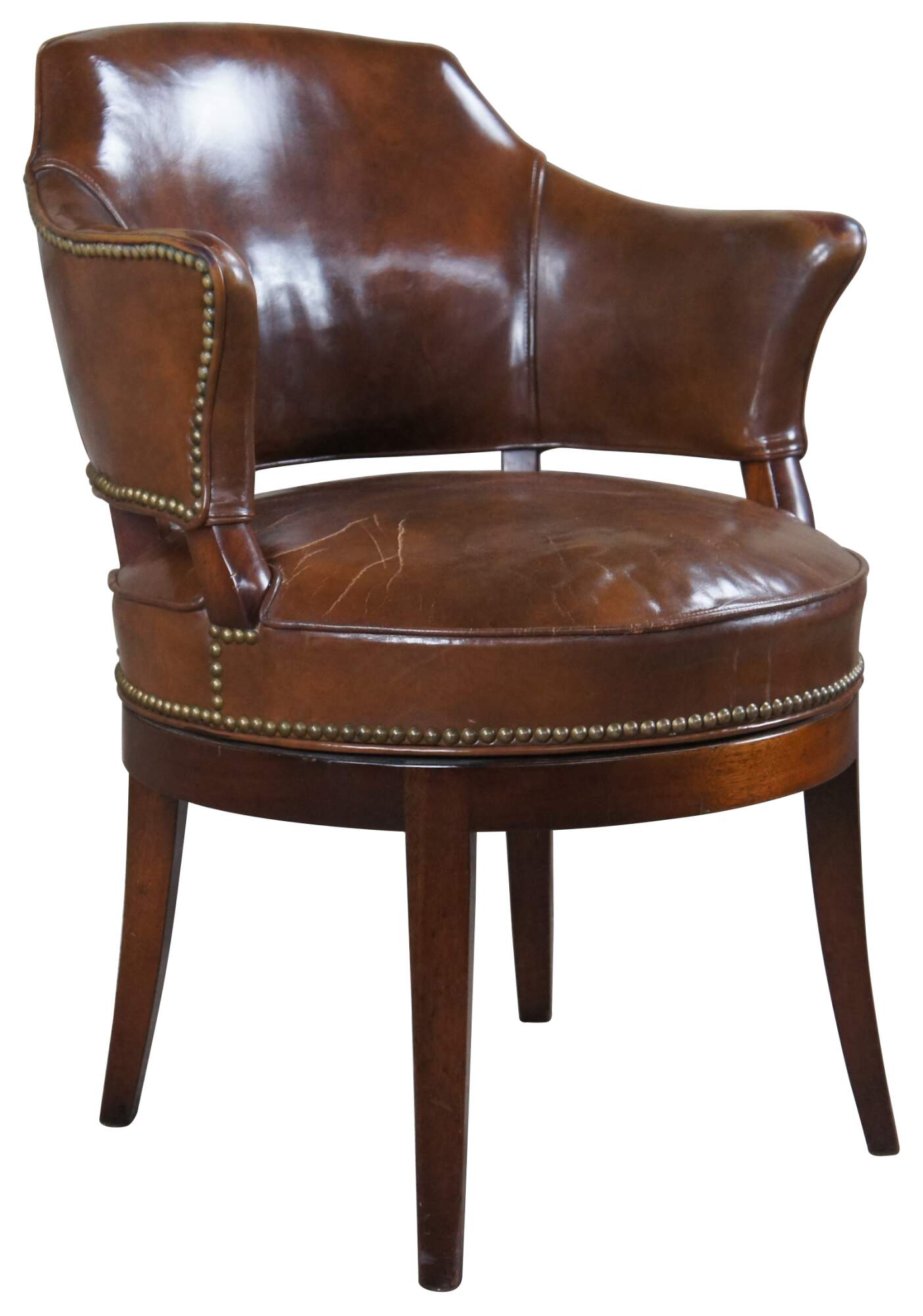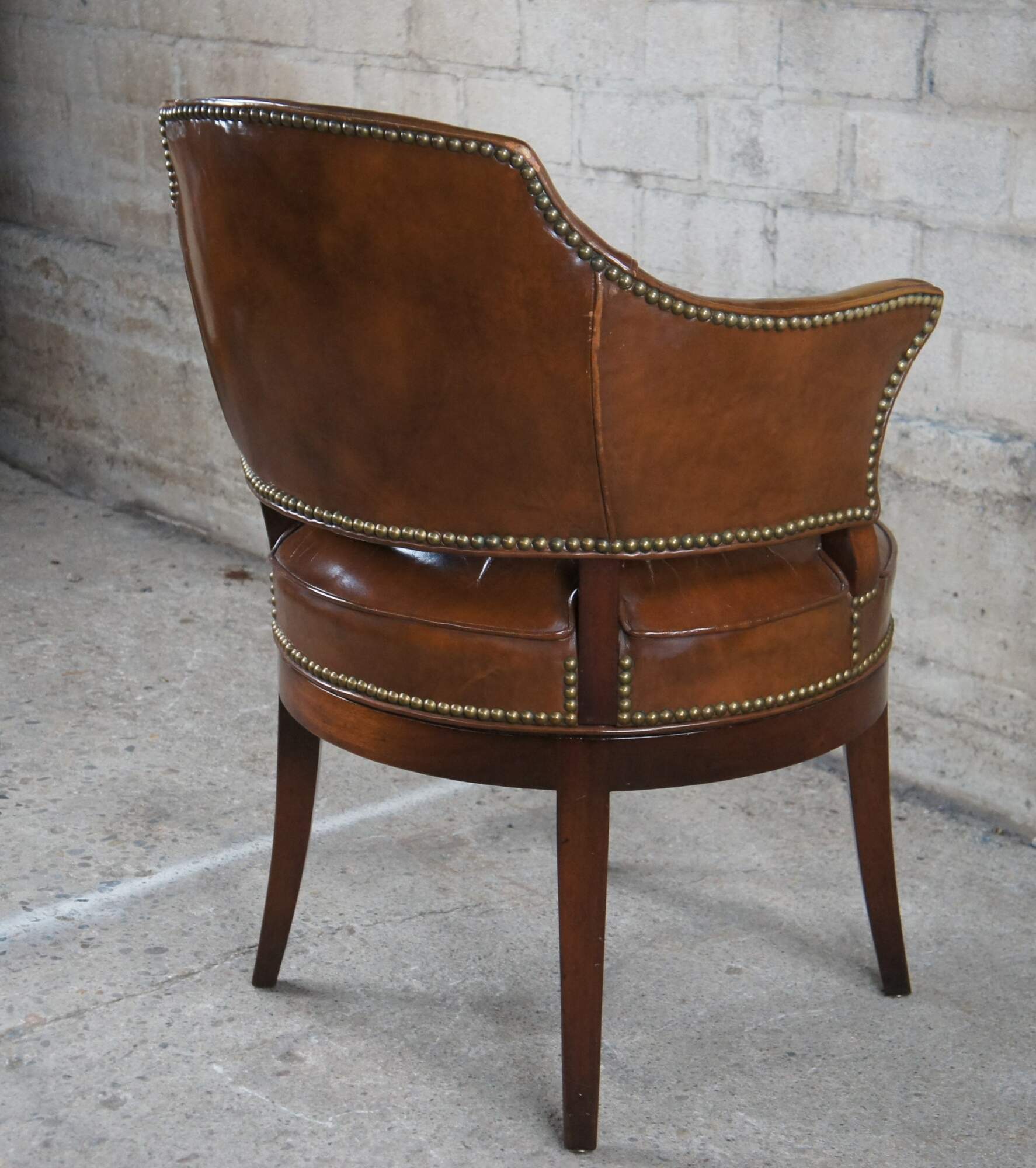 Barnards & Simonds Company swivel arm chair, circa 1960s. Made from mahogany with a barrel back frame. Upholstered in a brown leather with brass nail head trim. The frame is raised over square tapered saber legs. Metal tag along underside.
