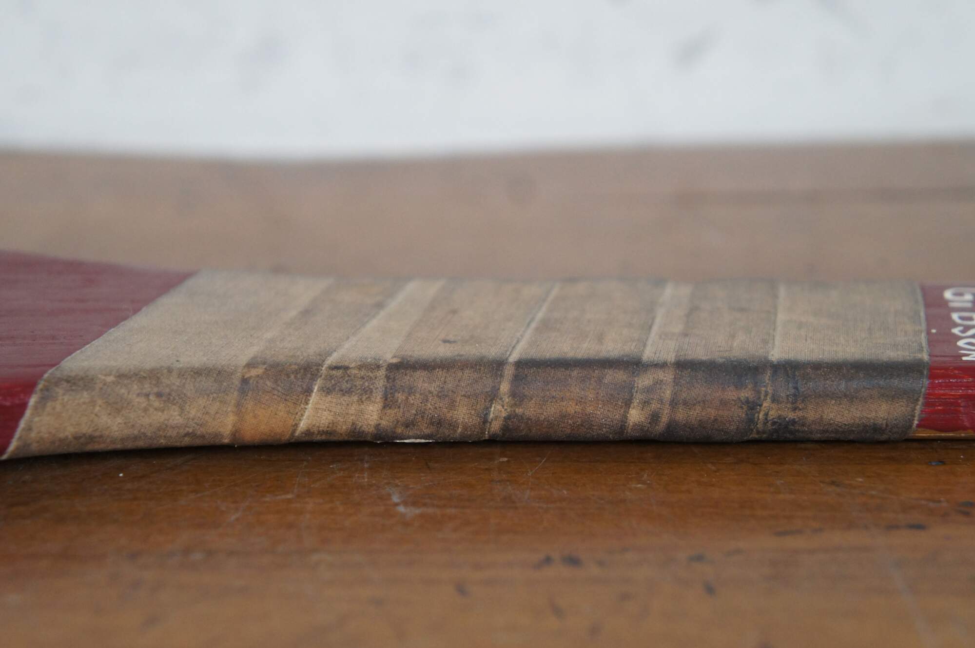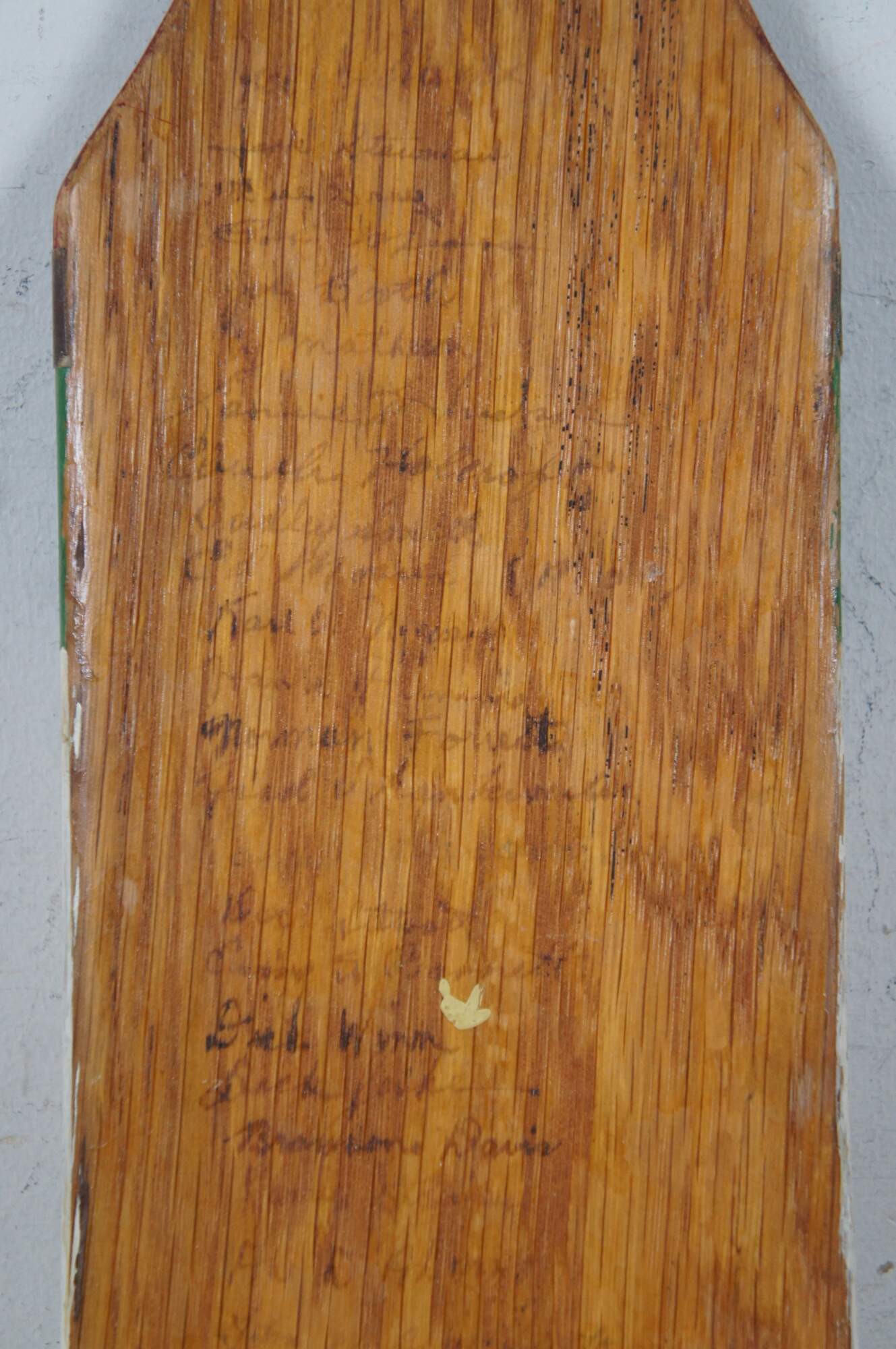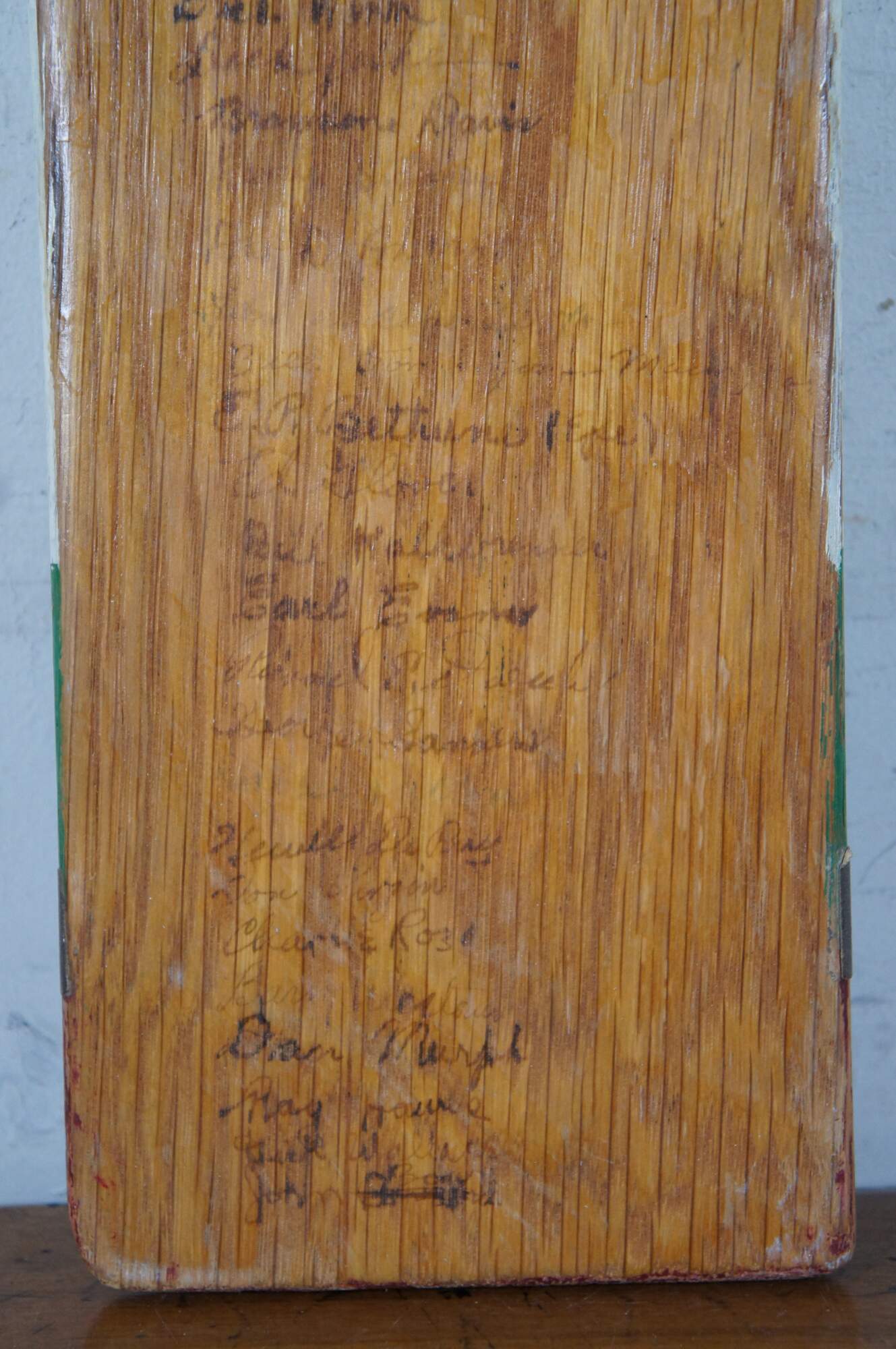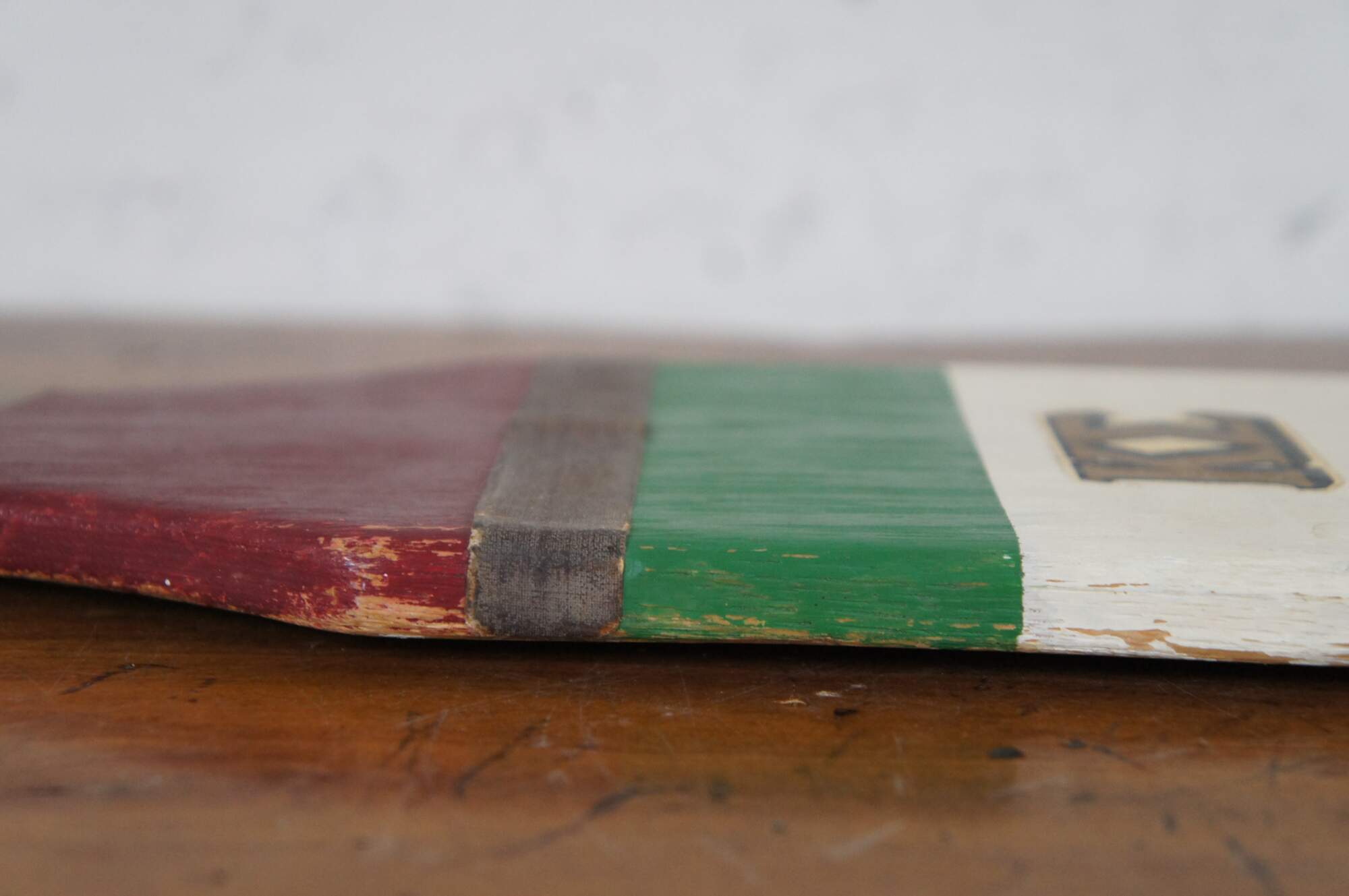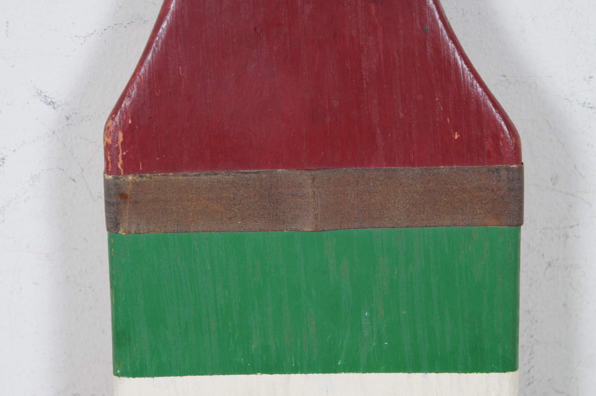 Mid 20th century Kappa Sigma fraternity wooden pledge hazing paddle, fully painted on the front in burgundy, green and white, with applied fraternity logo, taped handle and surname of original owner, (Jack) Gibson. Reverse is signed with the names of pledges.