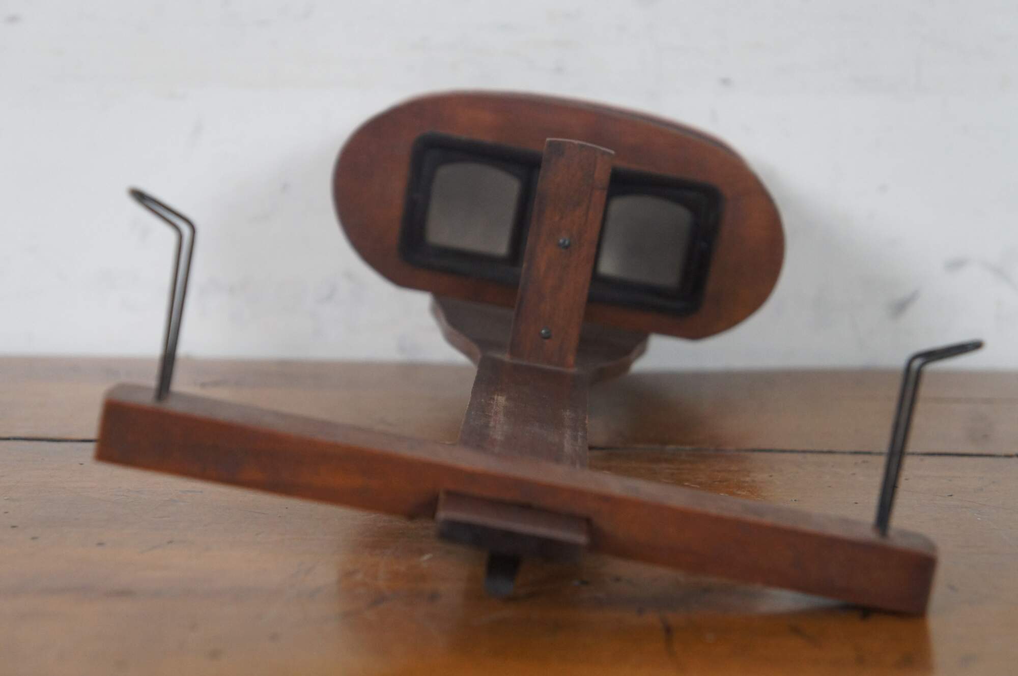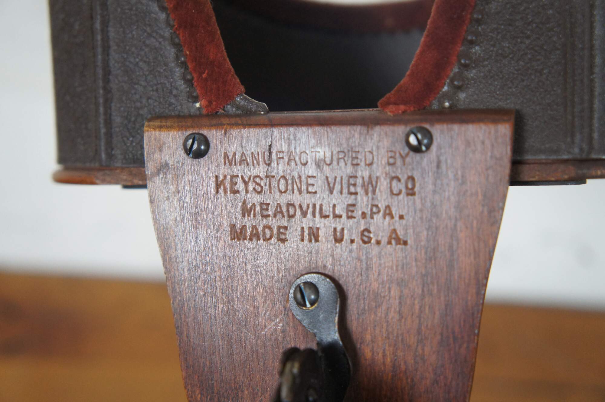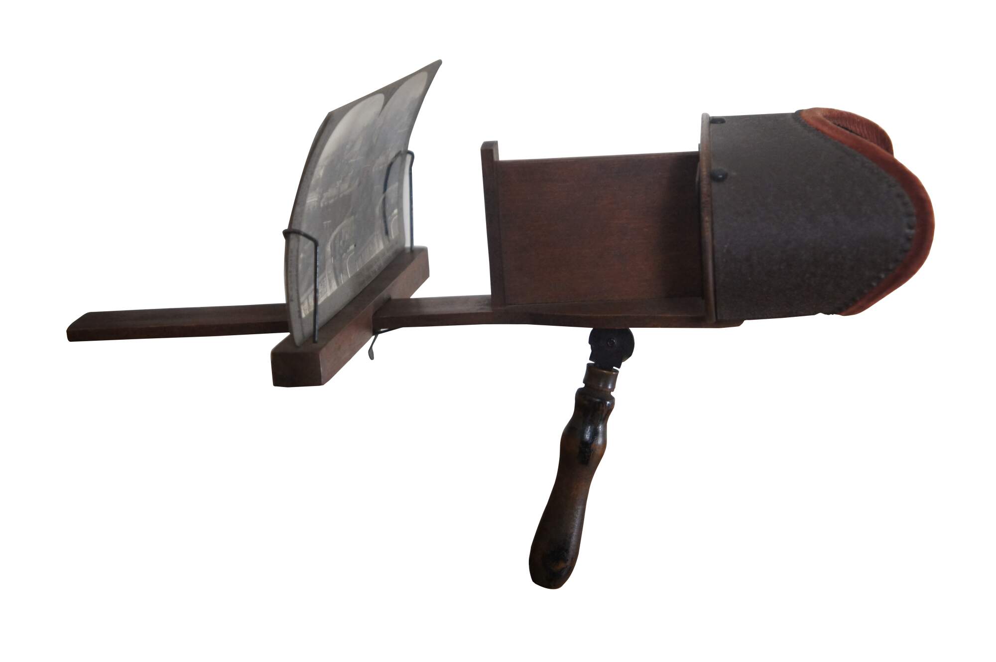 Antique early 20th century Keystone View company stereoscope viewer, made of wood with rotating handle and velvet edged lens case. Comes with 13 World Tour viewer cards and 17 stereographed family photos circa 1937.