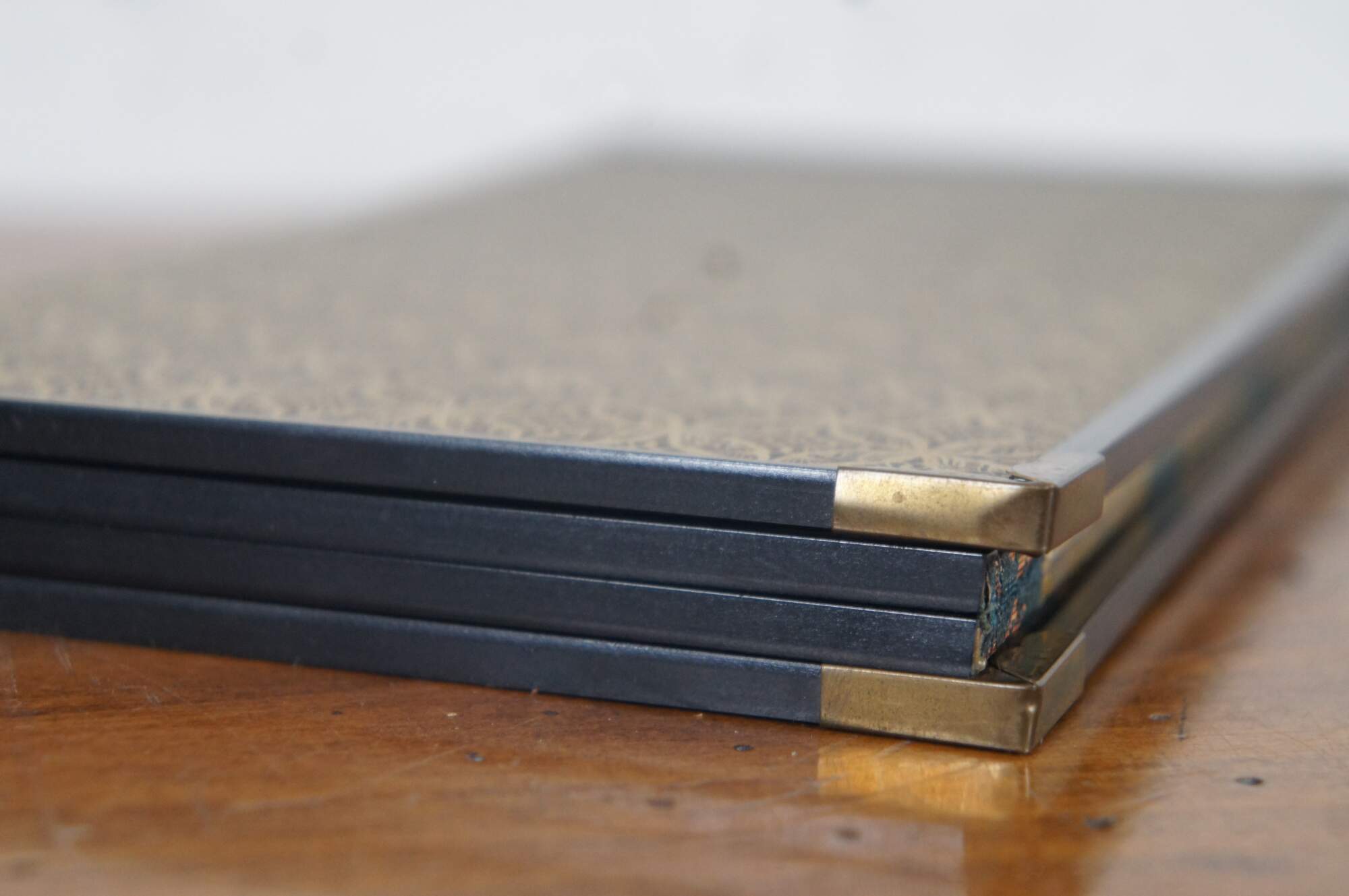 Vintage tabletop four panel Japanese privacy screen featuring cranes and a gnarled pine tree with a metallic gold background, surrounded by a fabric border and brass corners.