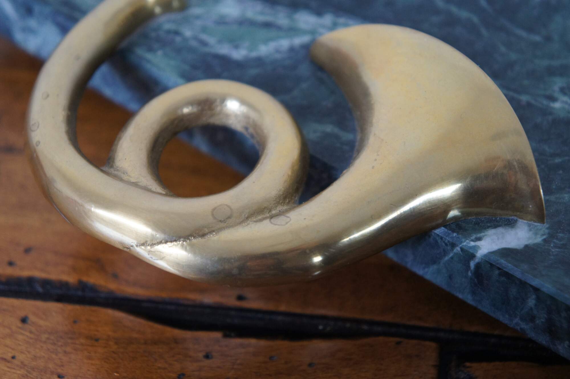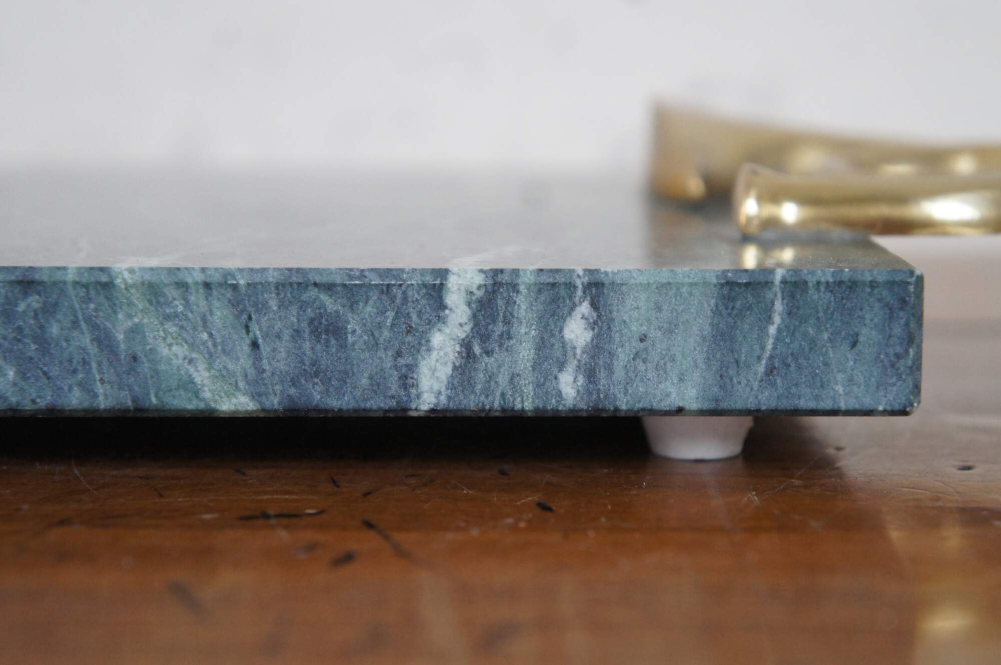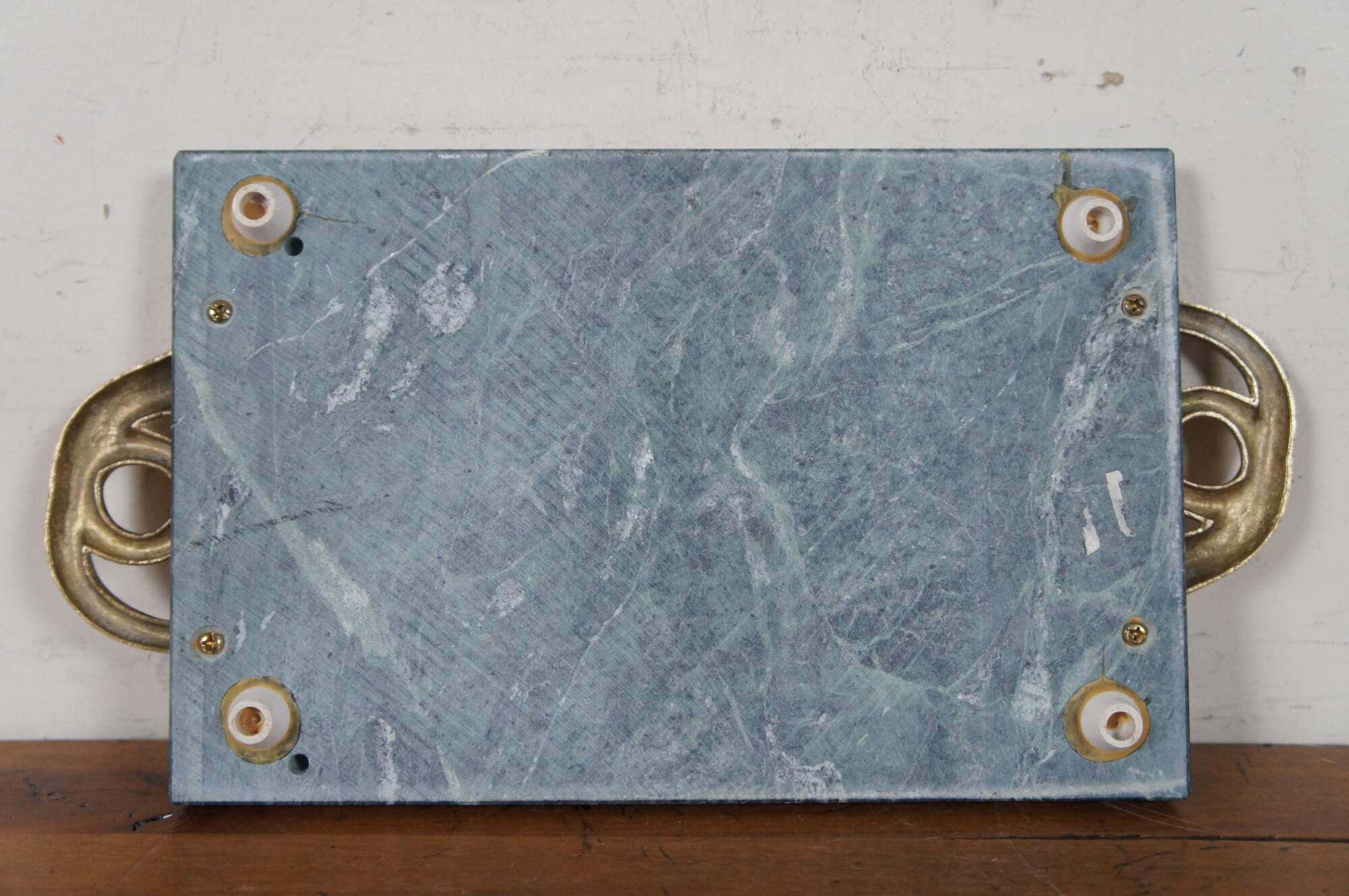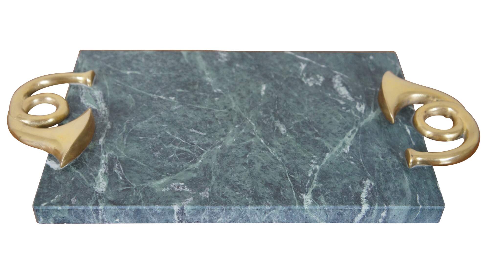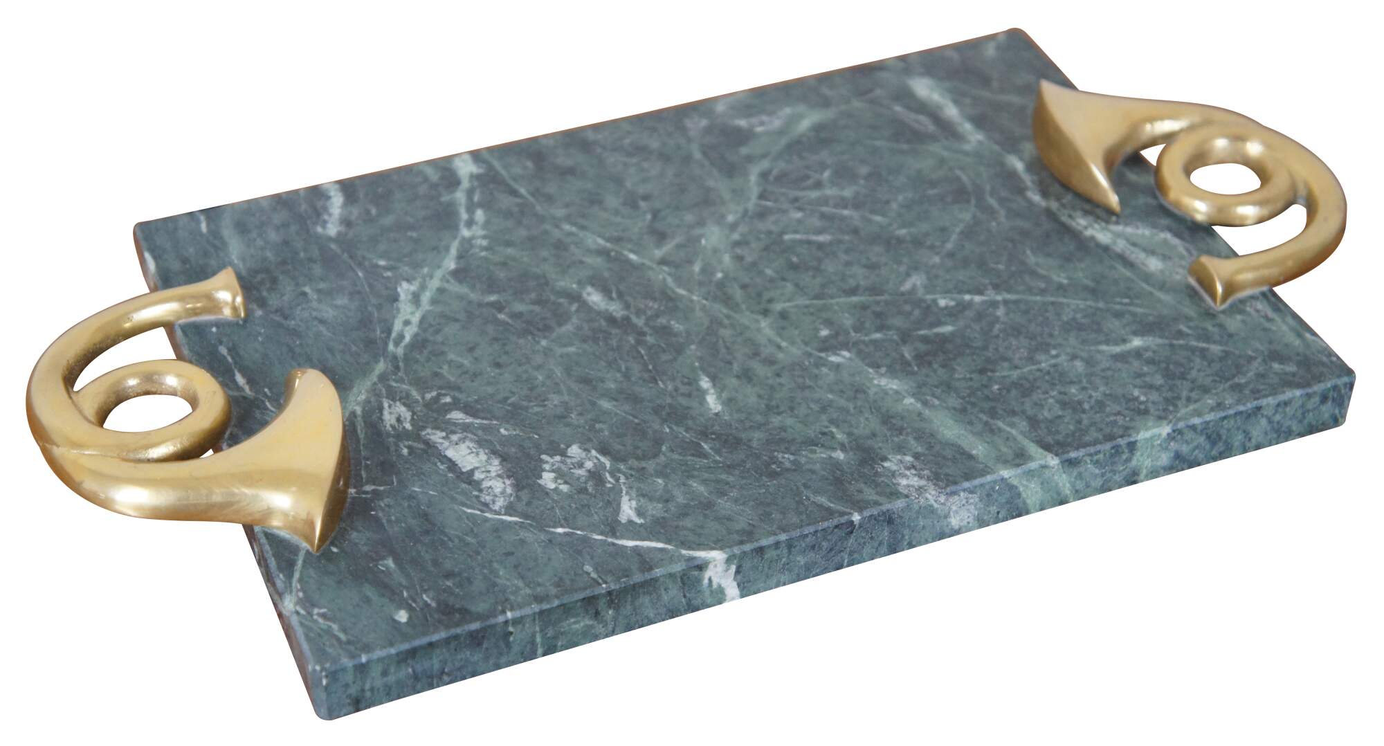 Vintage rectangular green marble cheese board / serving tray featuring a musical orchestra theme with brass French horn shaped handles, and white plastic feet.