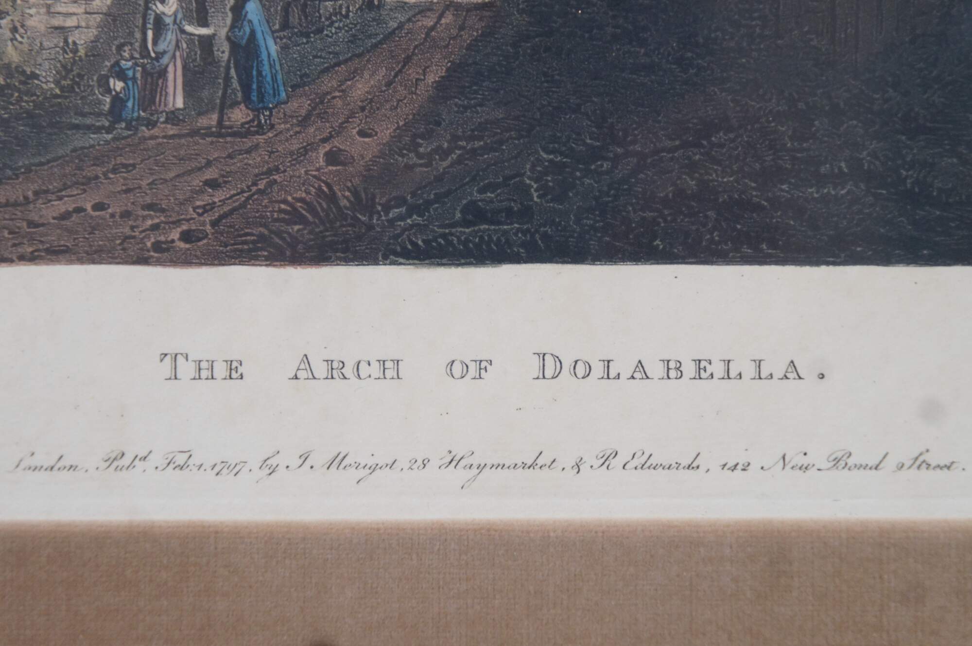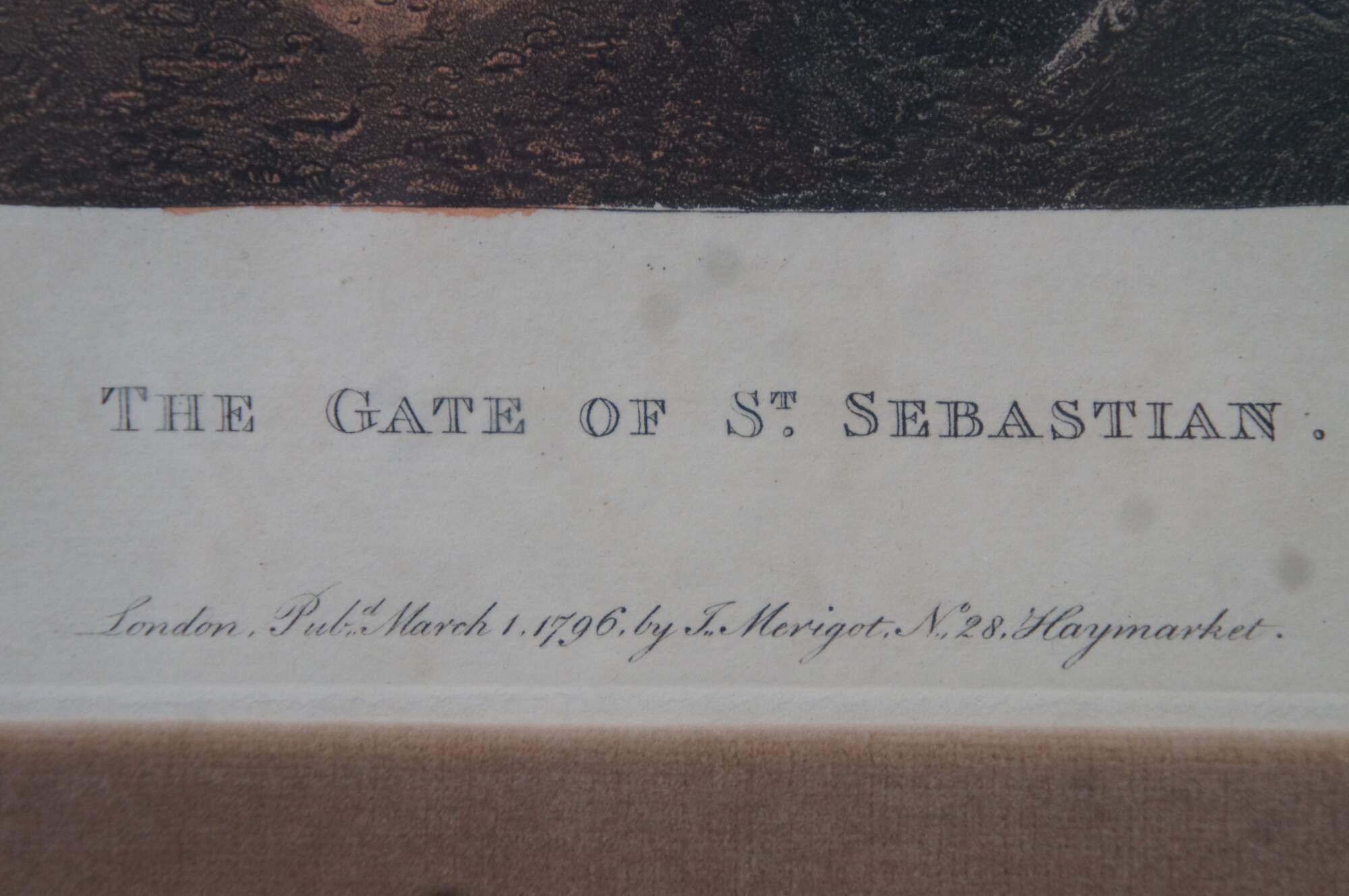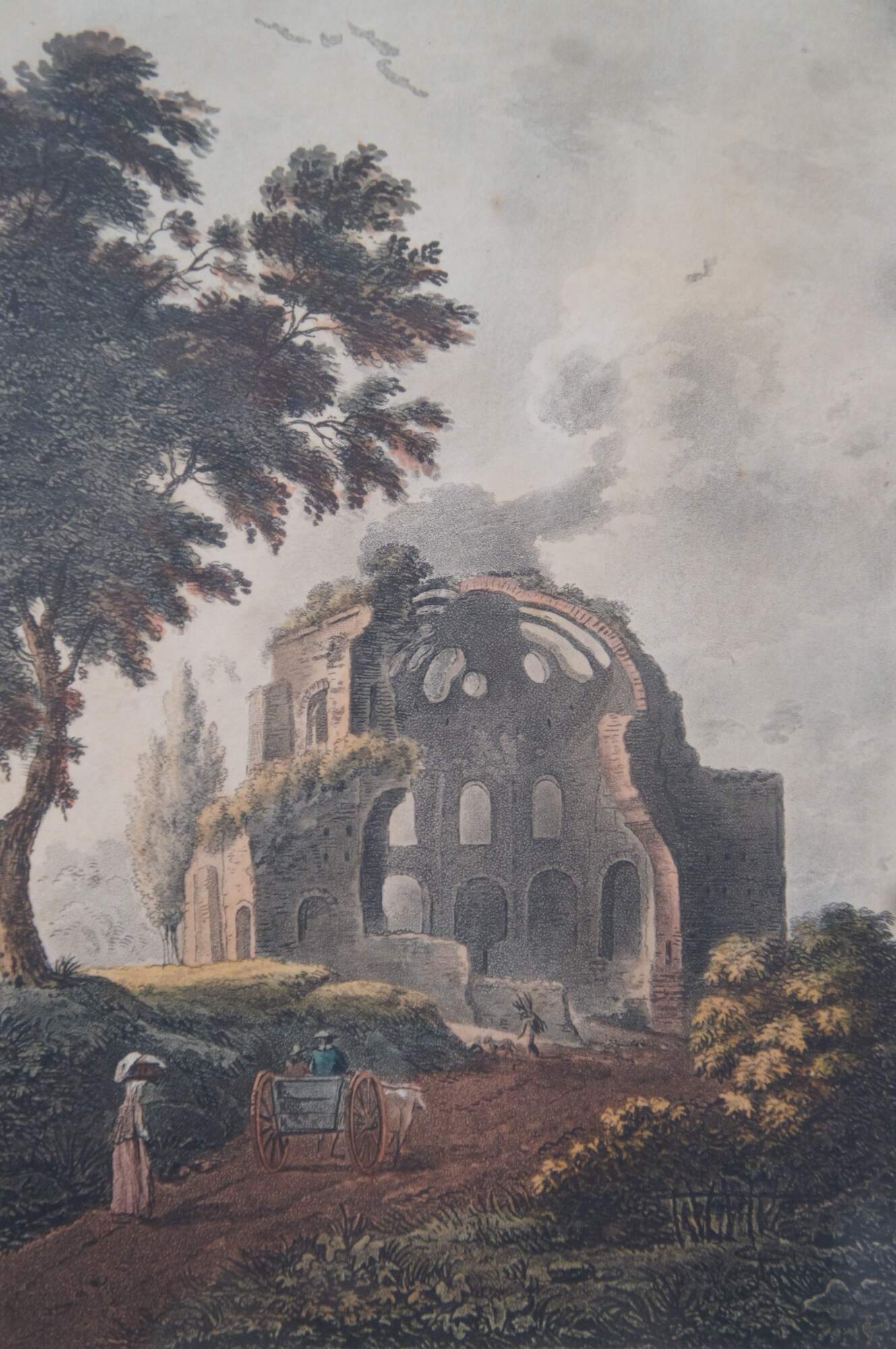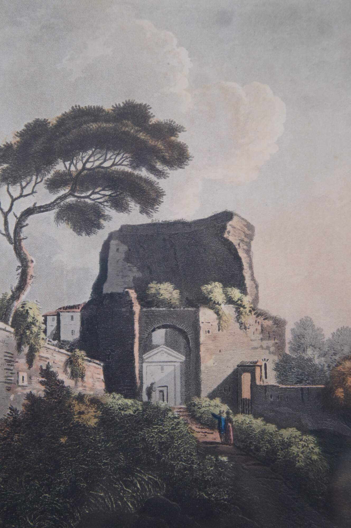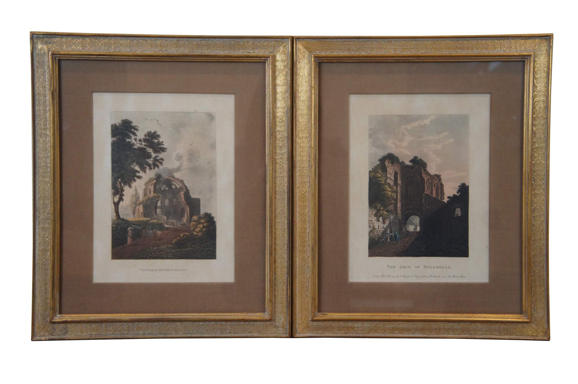 Set of four late 18th century hand colored engraving - “The Gate of St. Sebastian” published 1796 by James Merigot, “Tower of Pignattara” published 1798 by R. E(illegible), “Temple of Minerva Medica” publisher information faded away, and “The Arch of Dolabella” published 1797 by James Merigot. All labeled on reverse of frames as being “Marigot Views” by Rudolph Lesch Fine Arts Inc. From A Select Collection of Views and Ruins in Rome and its Vicinity, by James Merigot circa 1797.