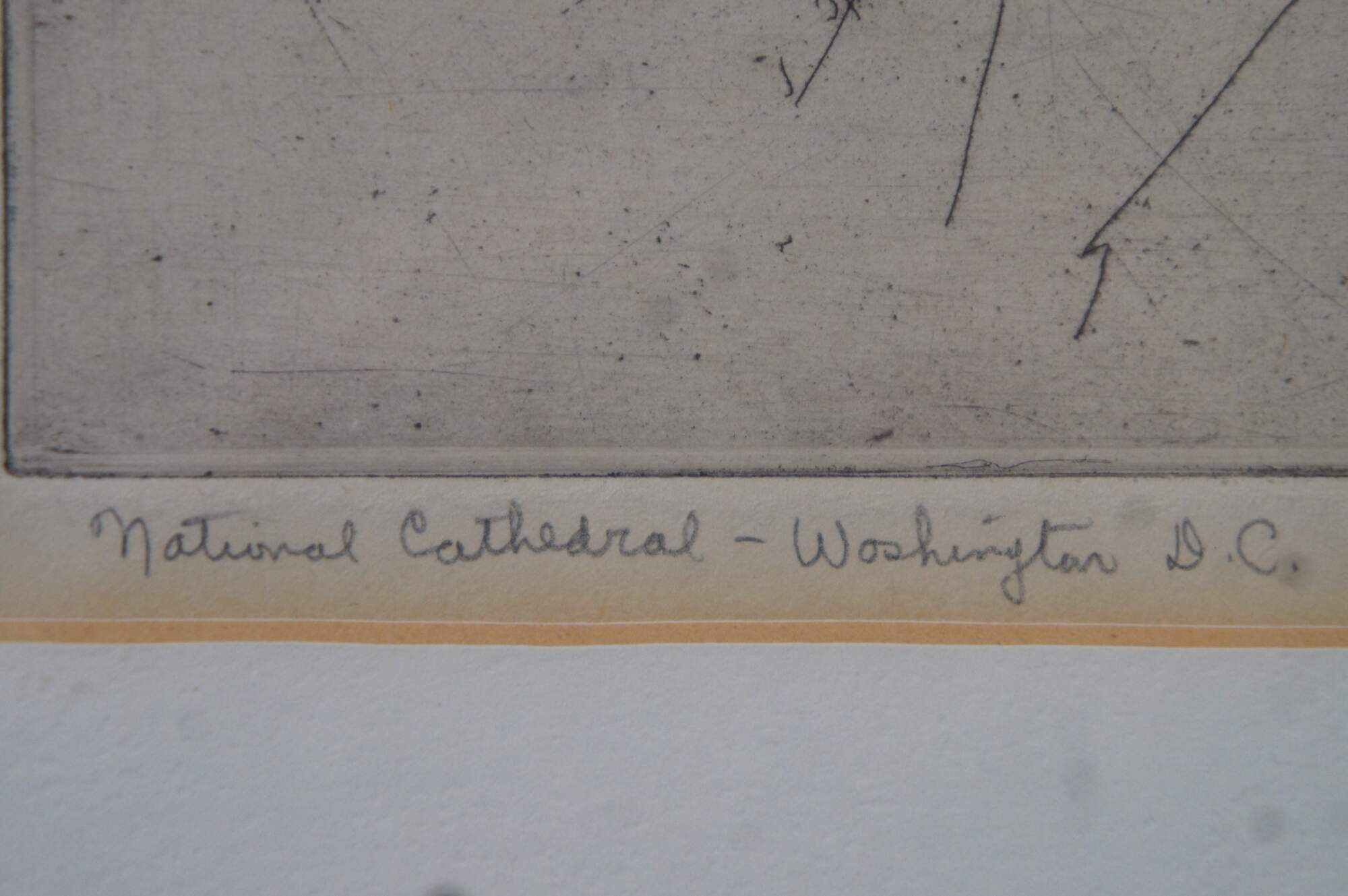 Mid century 1940s etching of the National Cathedral, Washington, D.C. (1943) pencil signed by Reynold Weidenaar.