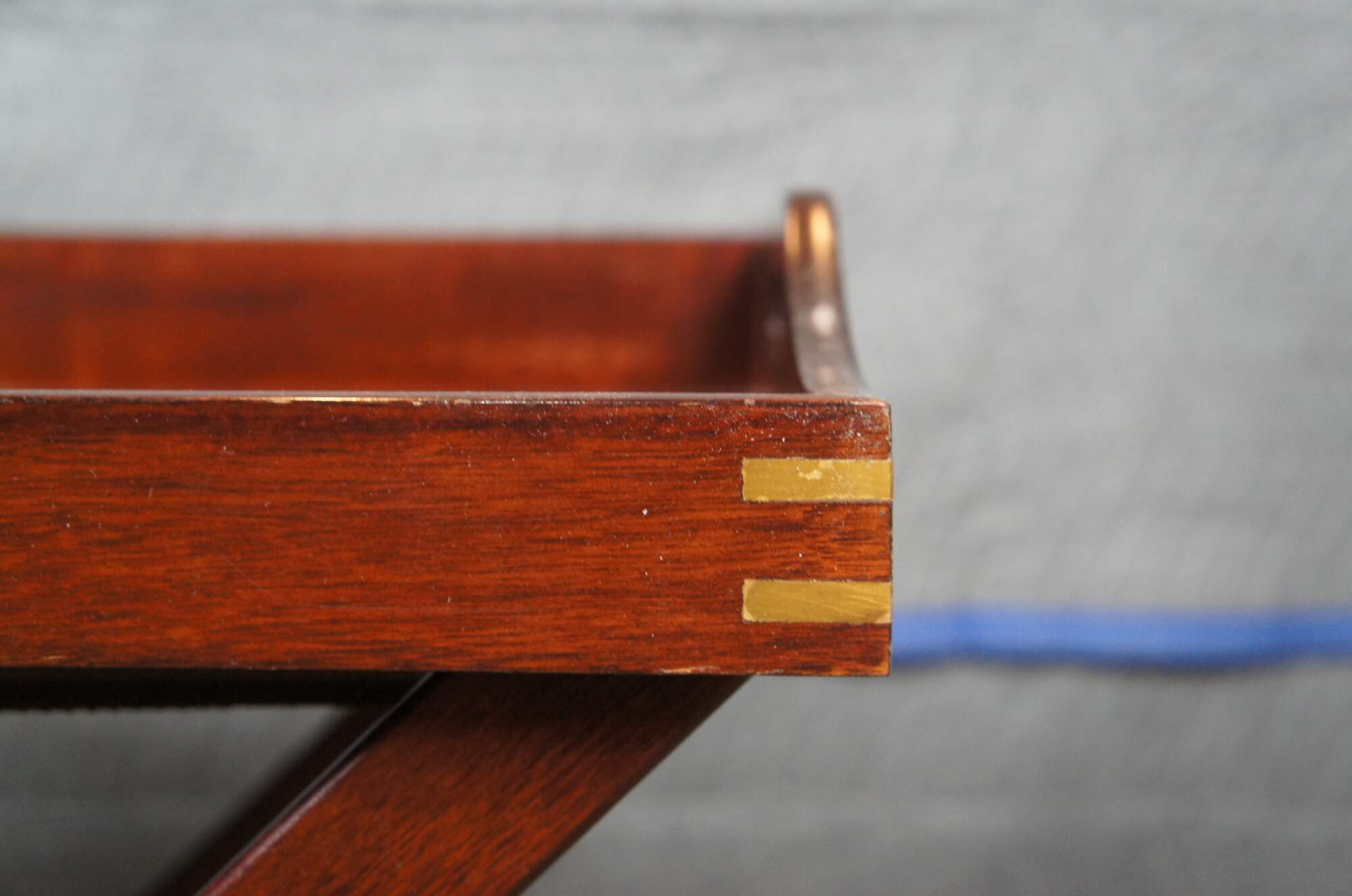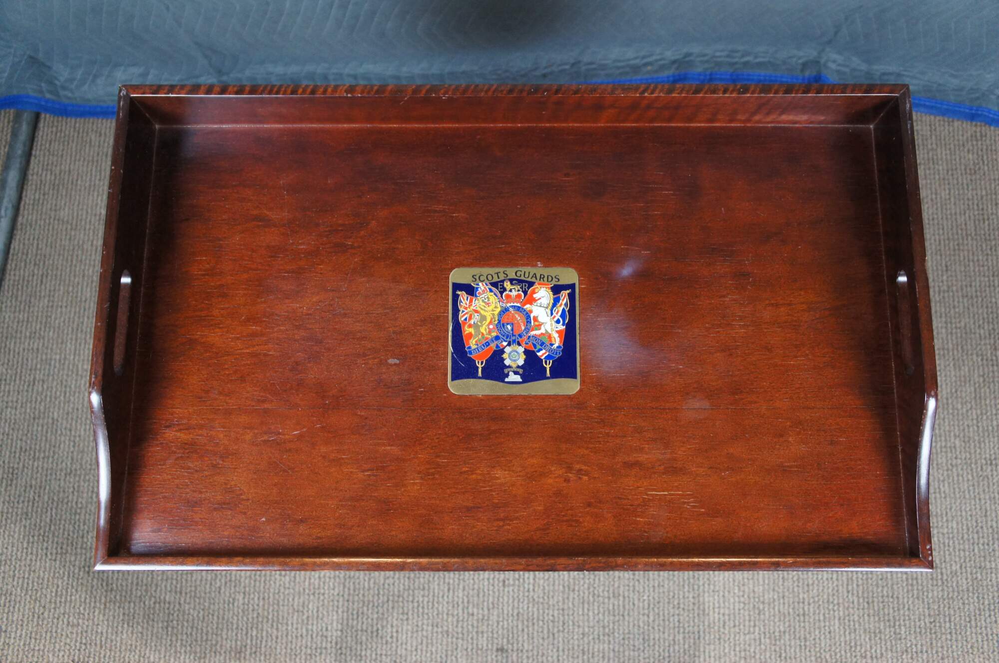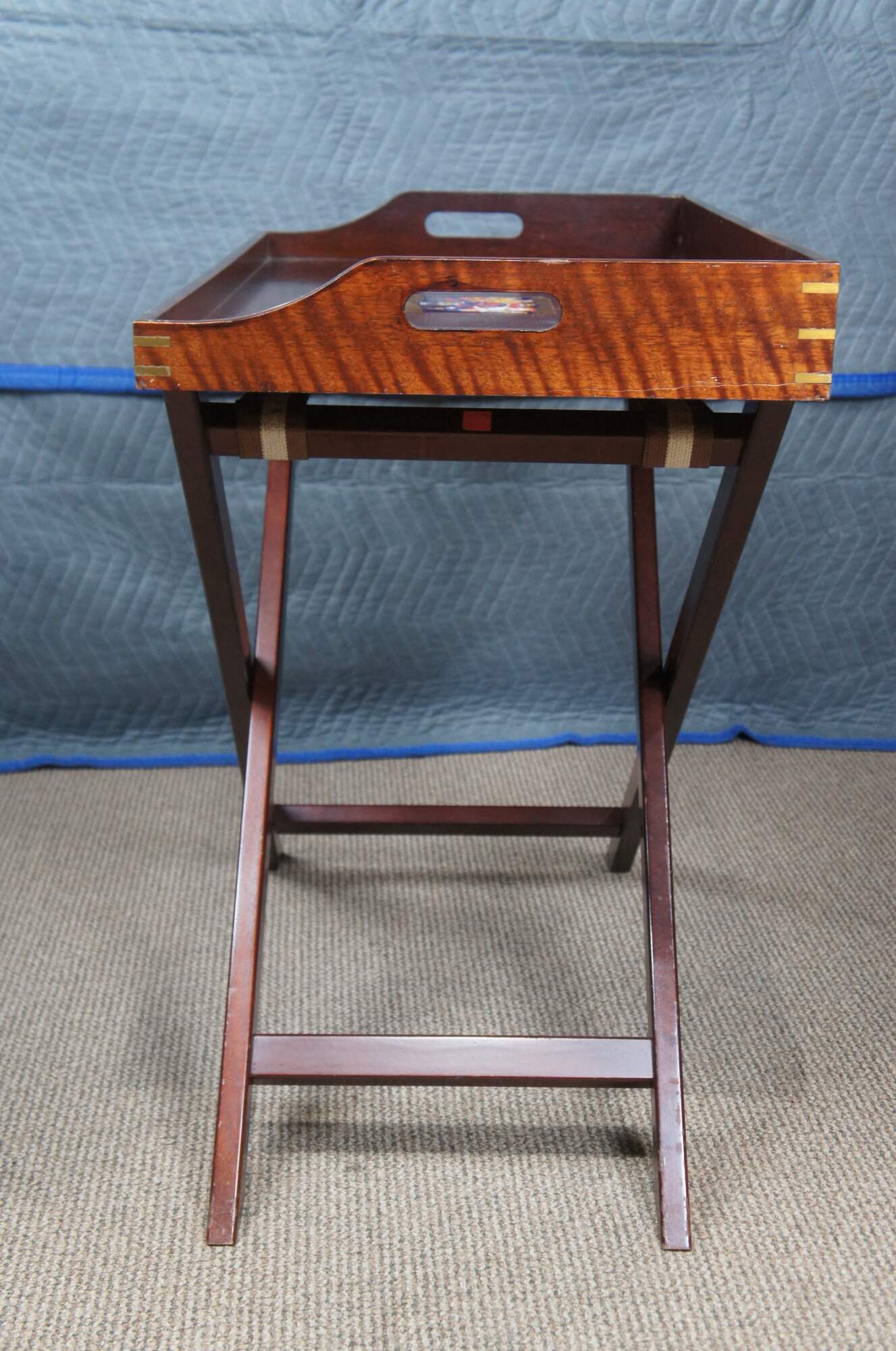 Vintage Scots Guard folding tray table. Made of mahogany featuring inlaid brass dovetail joinery with a central heraldic plaque or crest for the United Kingdom.