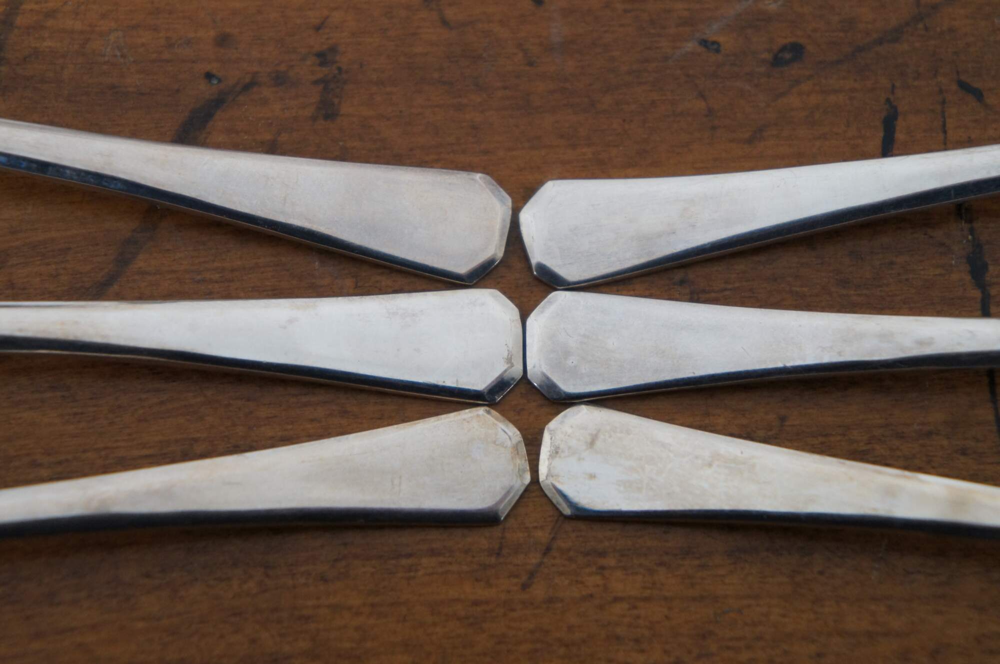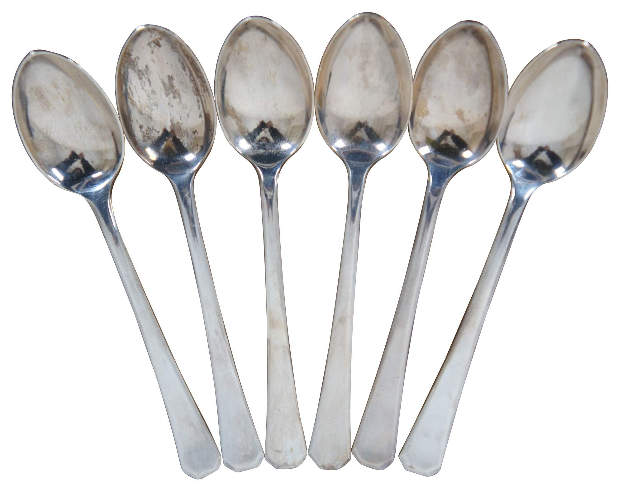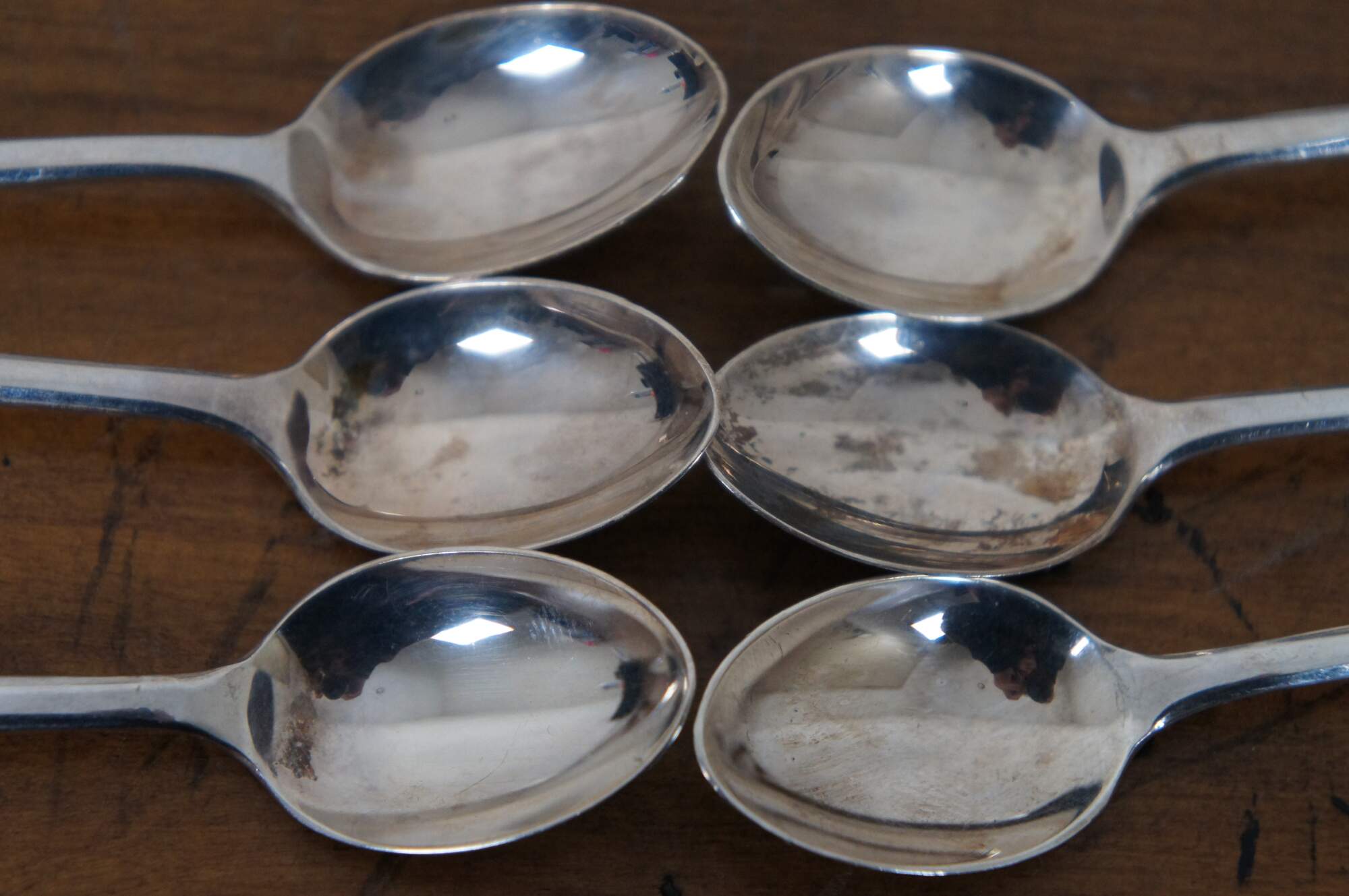 Vintage 1957 - 1958 boxed set of six sterling silver coffee / demitasse spoons. Made in England and marked with Gothic letters HH in rectangular cartouche.