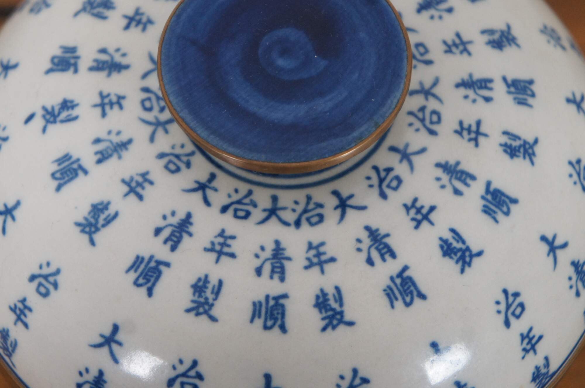 Pair of 20th century blue and white porcelain Chinese export ginger jars. Features a body covered in calligraphy with metal mounts. Each bears a Qing Dynasty mark.