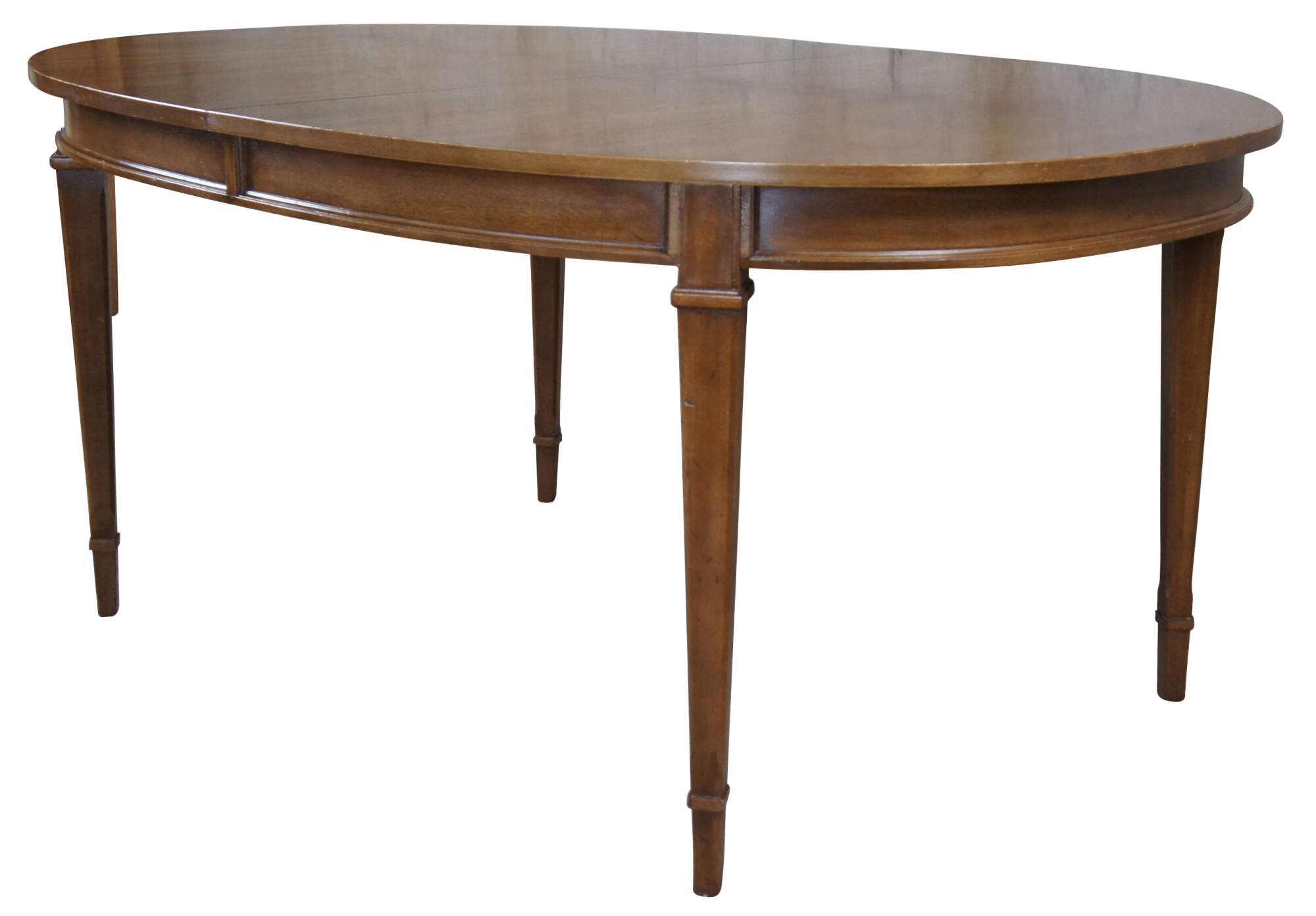 Vintage Drexel Triune dining table. Made of mahogany featuring an oval form, inset panel apron and square tapered legs. Includes 3 table leafs. Circa 1968. 555-333-5.