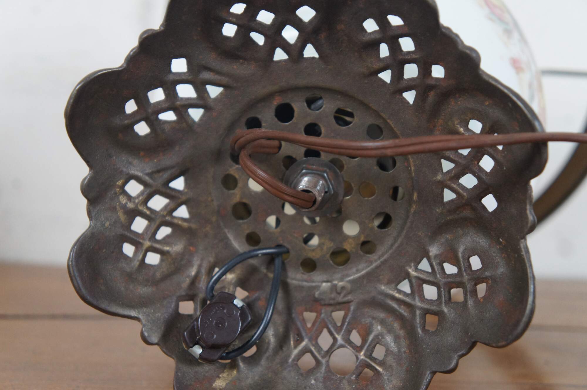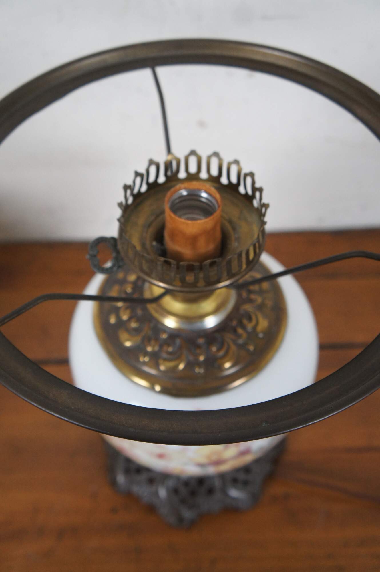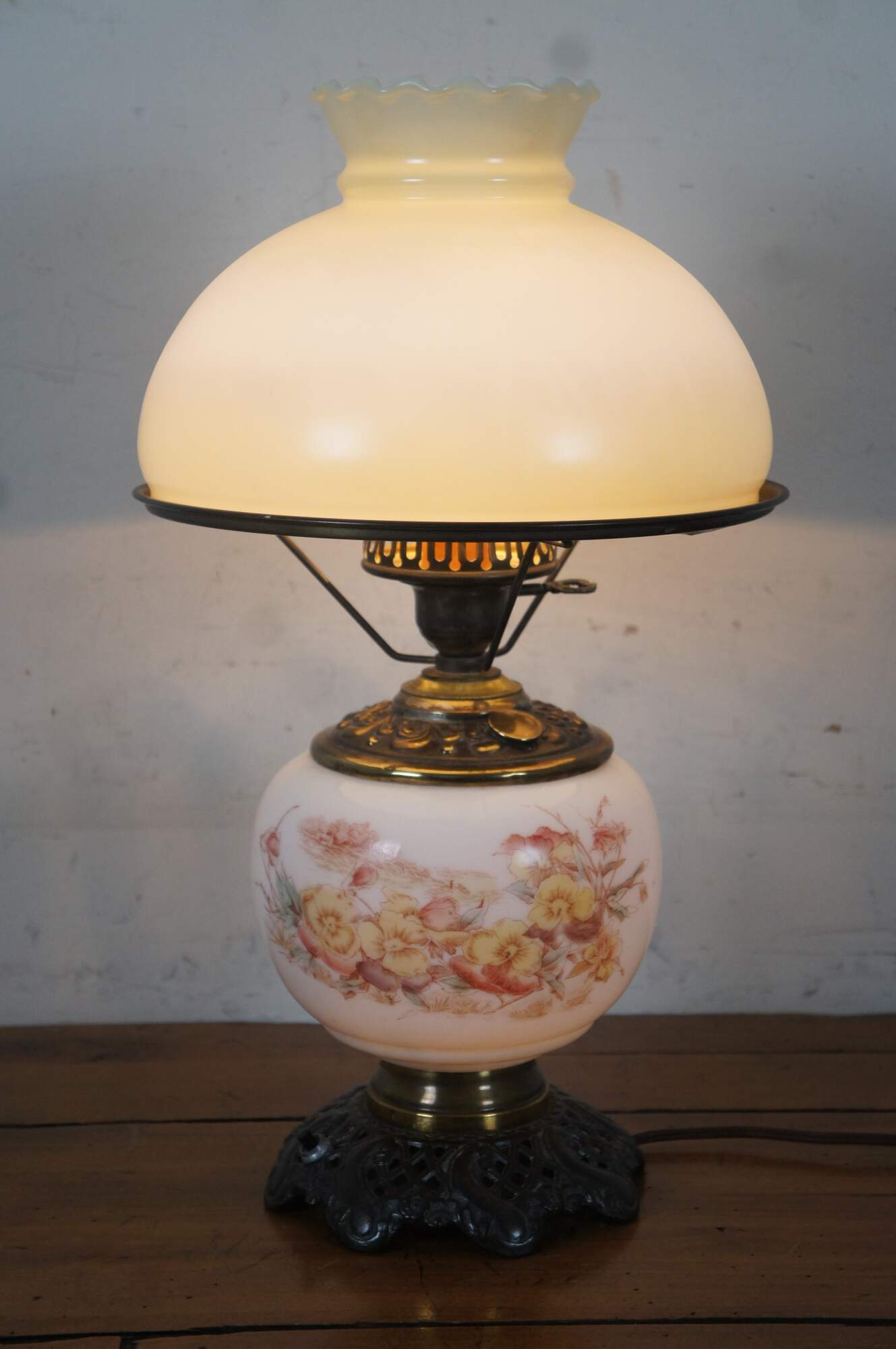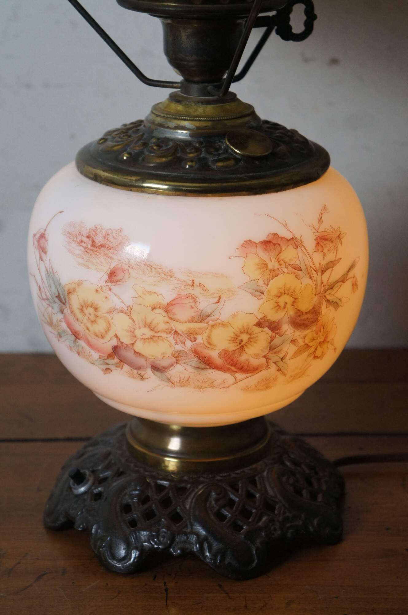Antique Gone with the Wind oil lamp (converted to electric) featuring a lightly tinted, ruffled top, milk glass shade, and a milk glass reservoir printed with pink and yellow pansies. Base marked 42. Three way switch allows upper portion and lower globe to illuminate together or independently. GWTW.