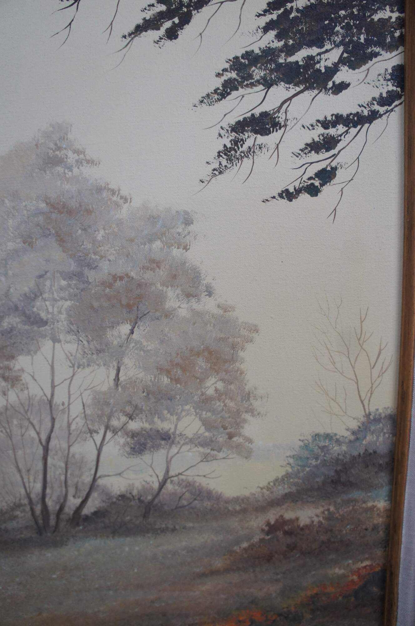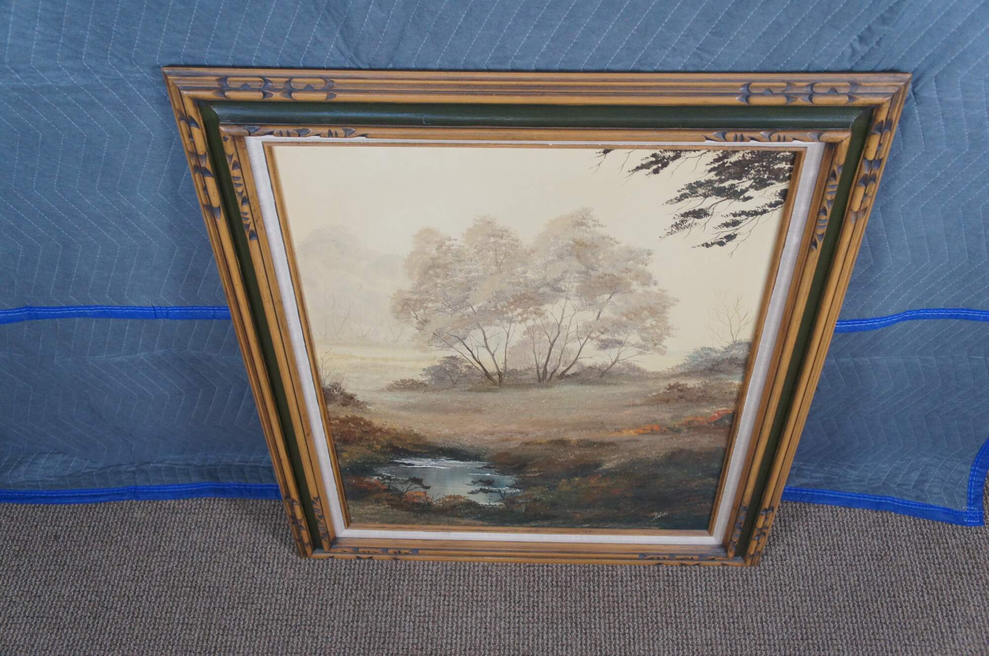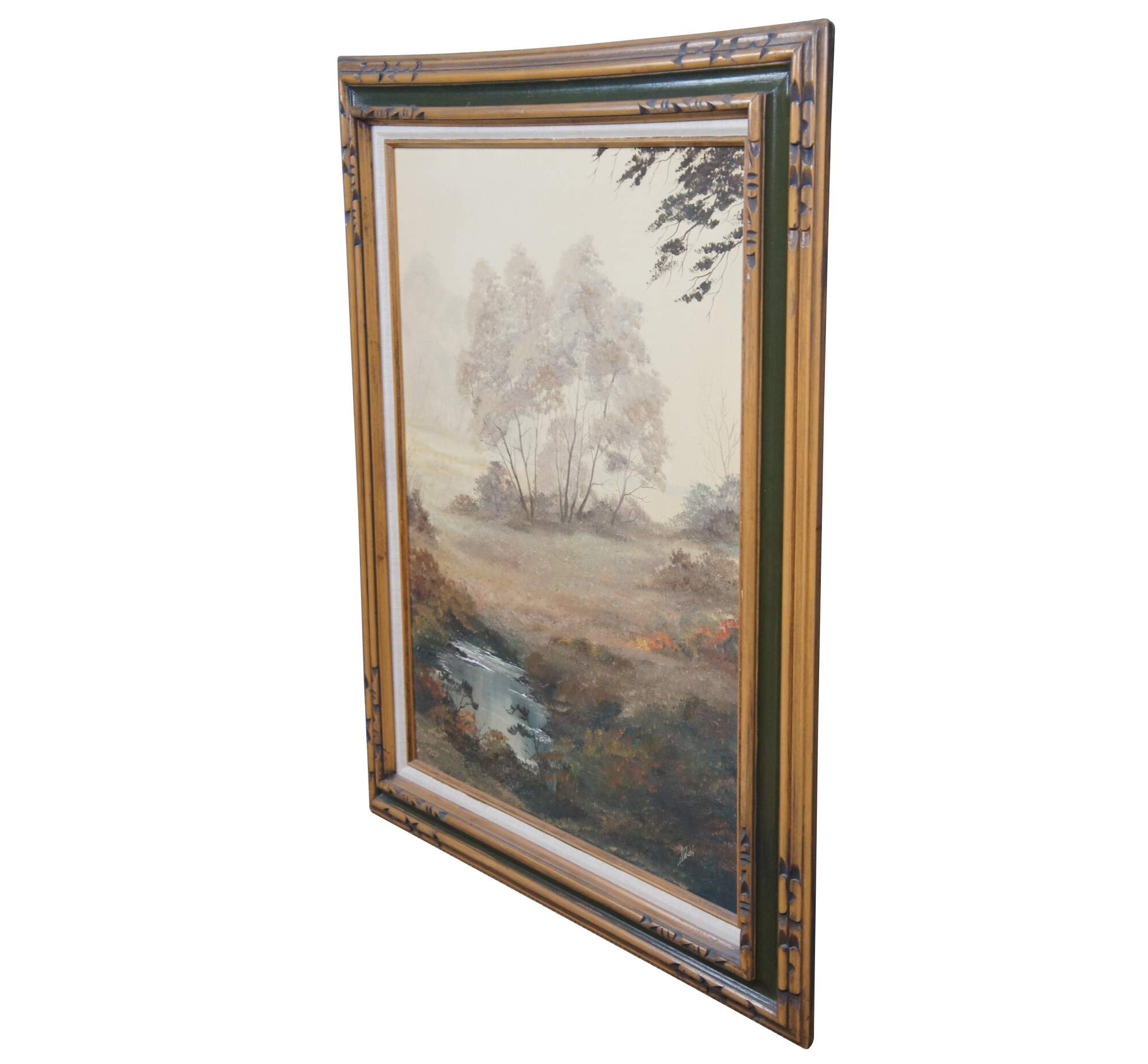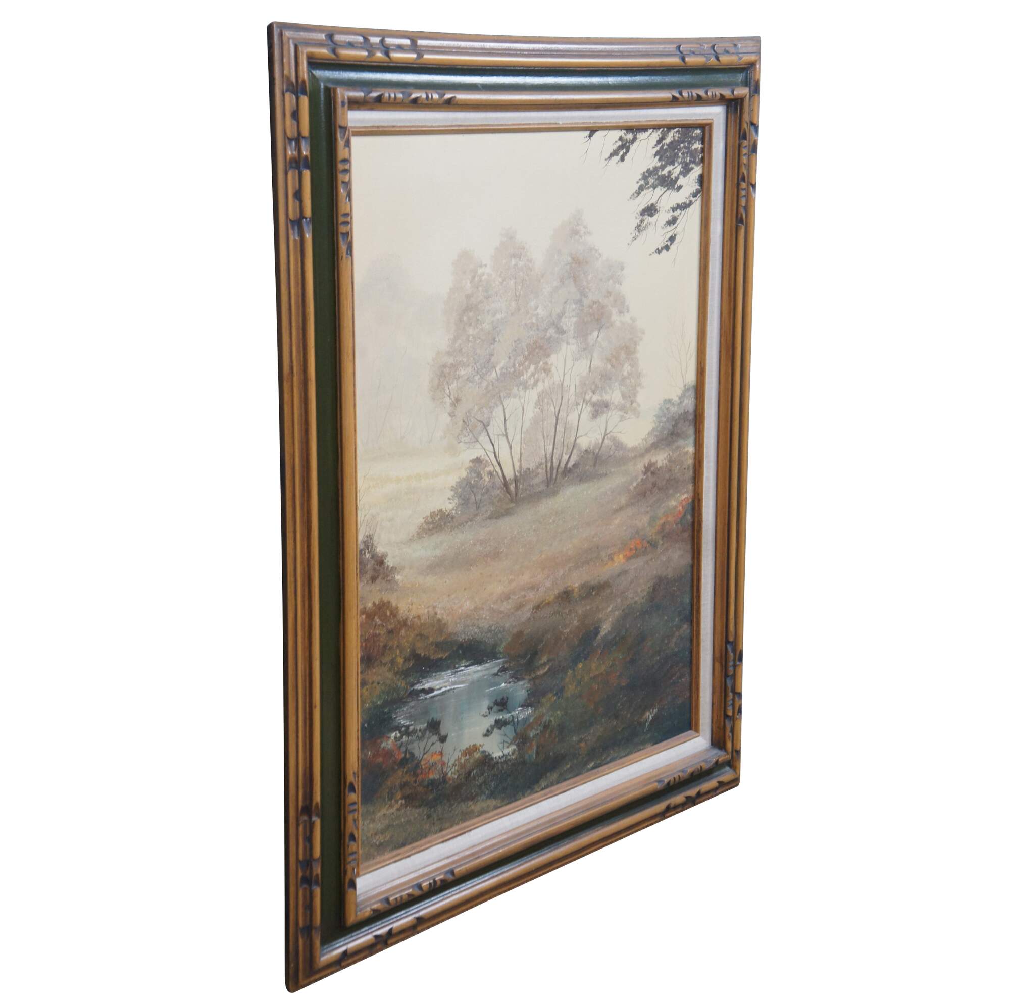 Vintage 1970s oil landscape painting. Features a view through the woods on a foggy day showing trees, grassland and a pond. The canvas is signed lower right and framed in wood with caved accents and green trim.
