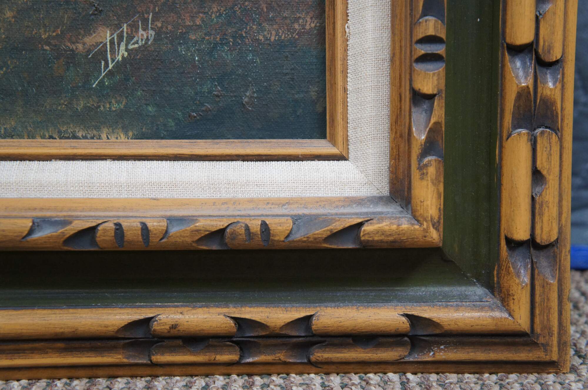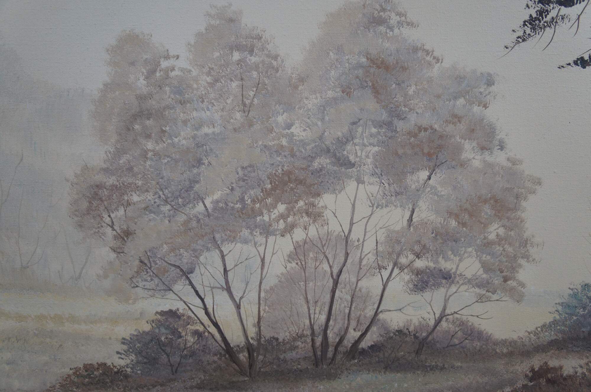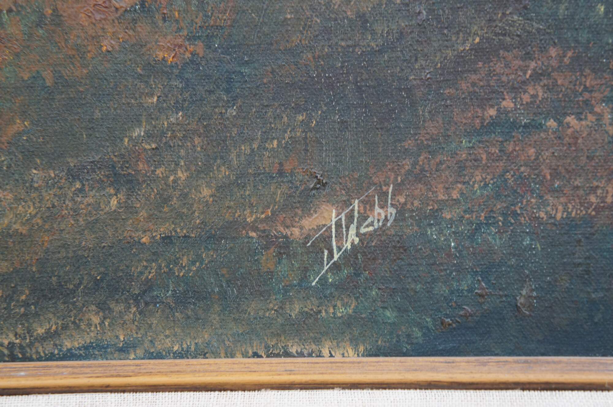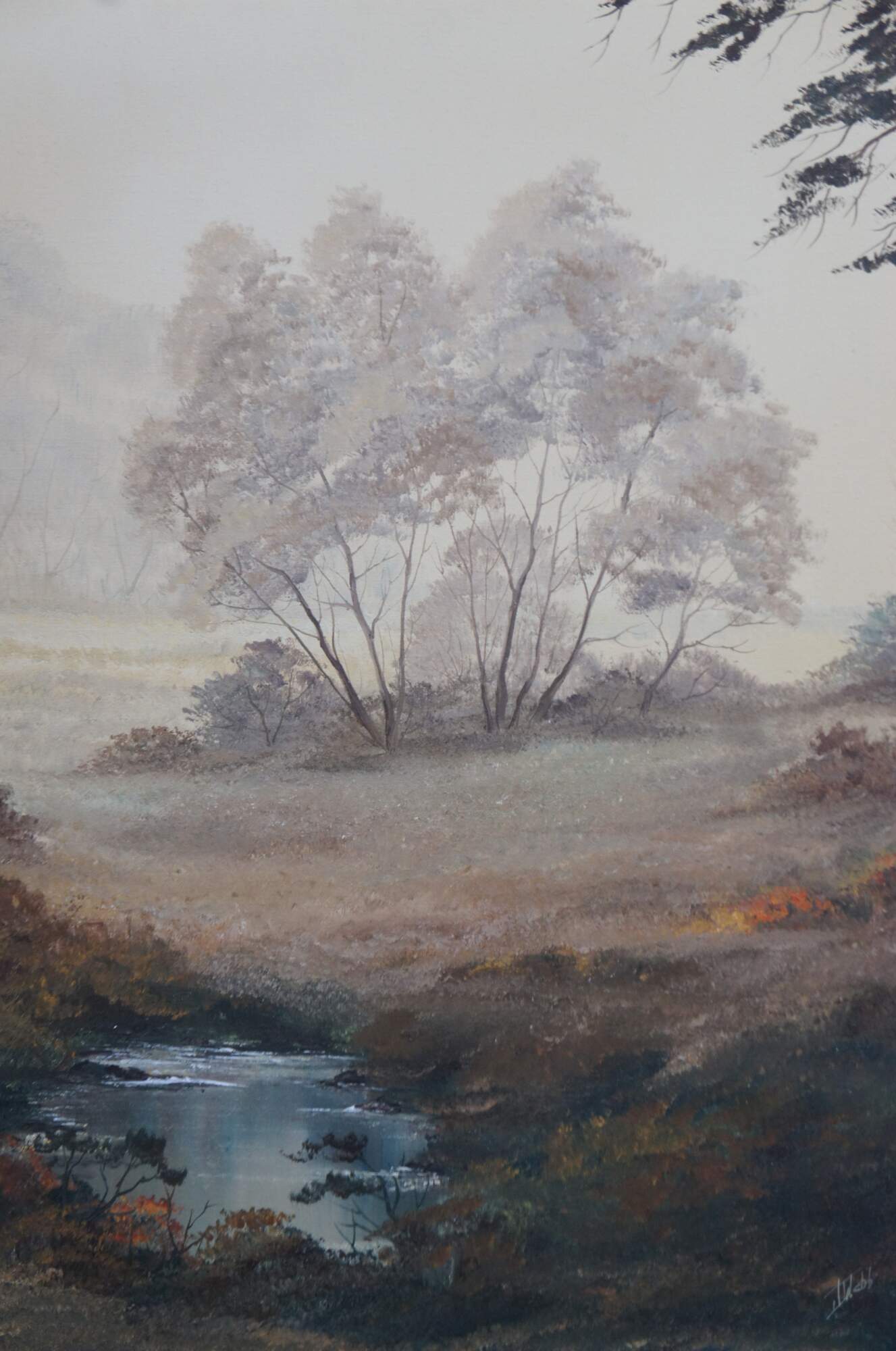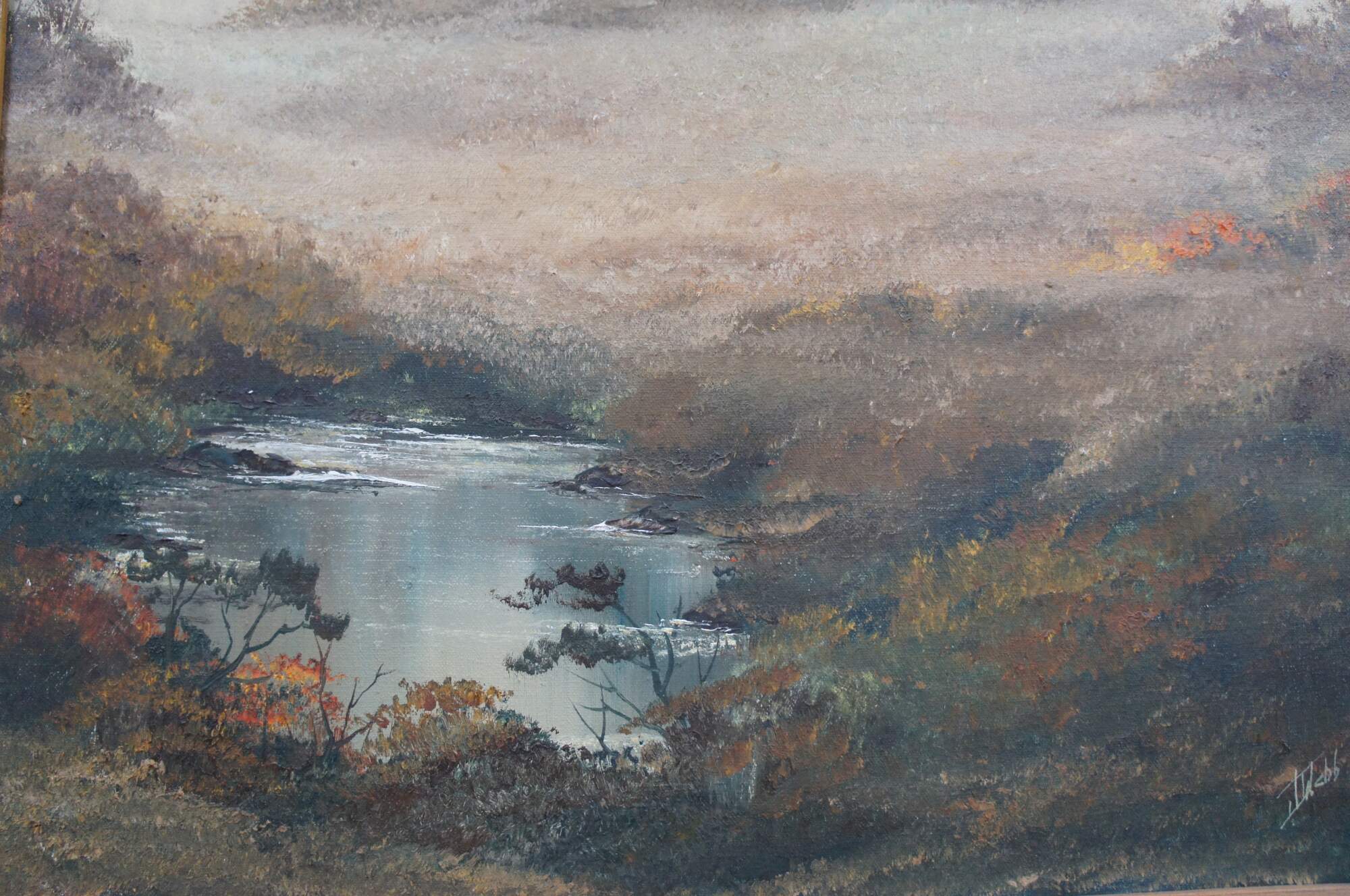 Vintage 1970s oil landscape painting. Features a view through the woods on a foggy day showing trees, grassland and a pond. The canvas is signed lower right and framed in wood with caved accents and green trim.