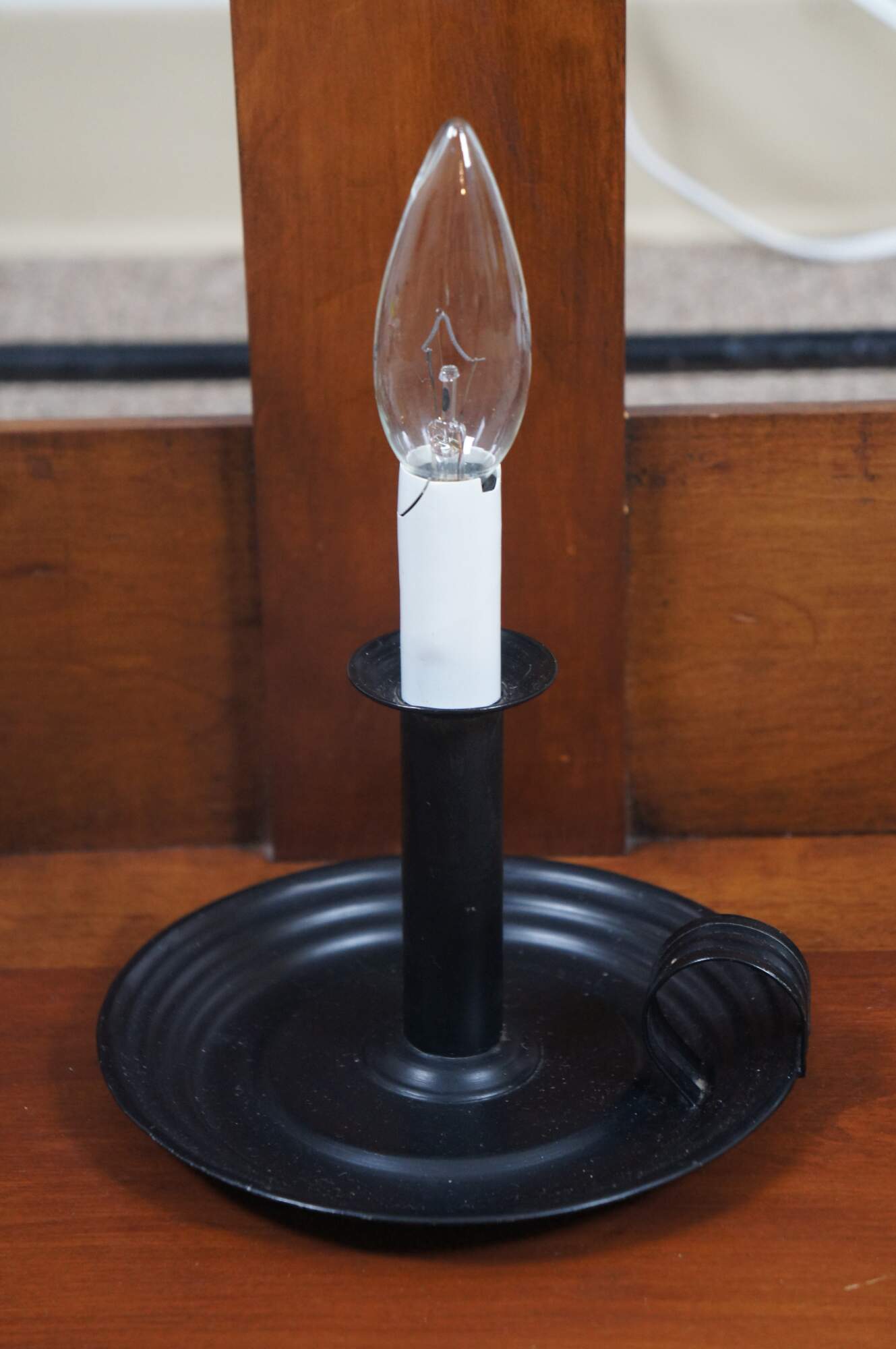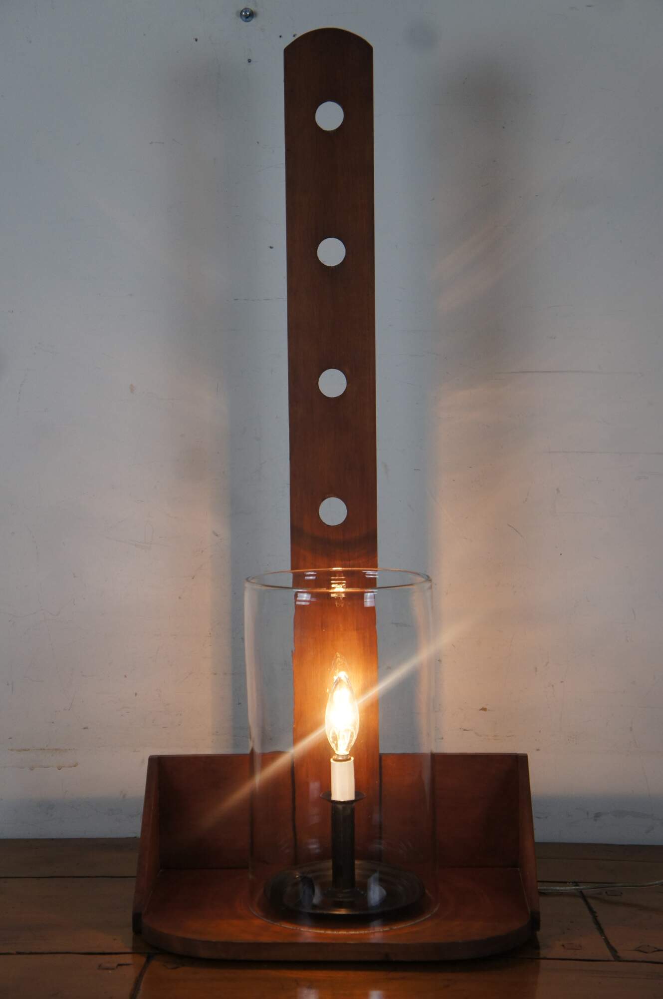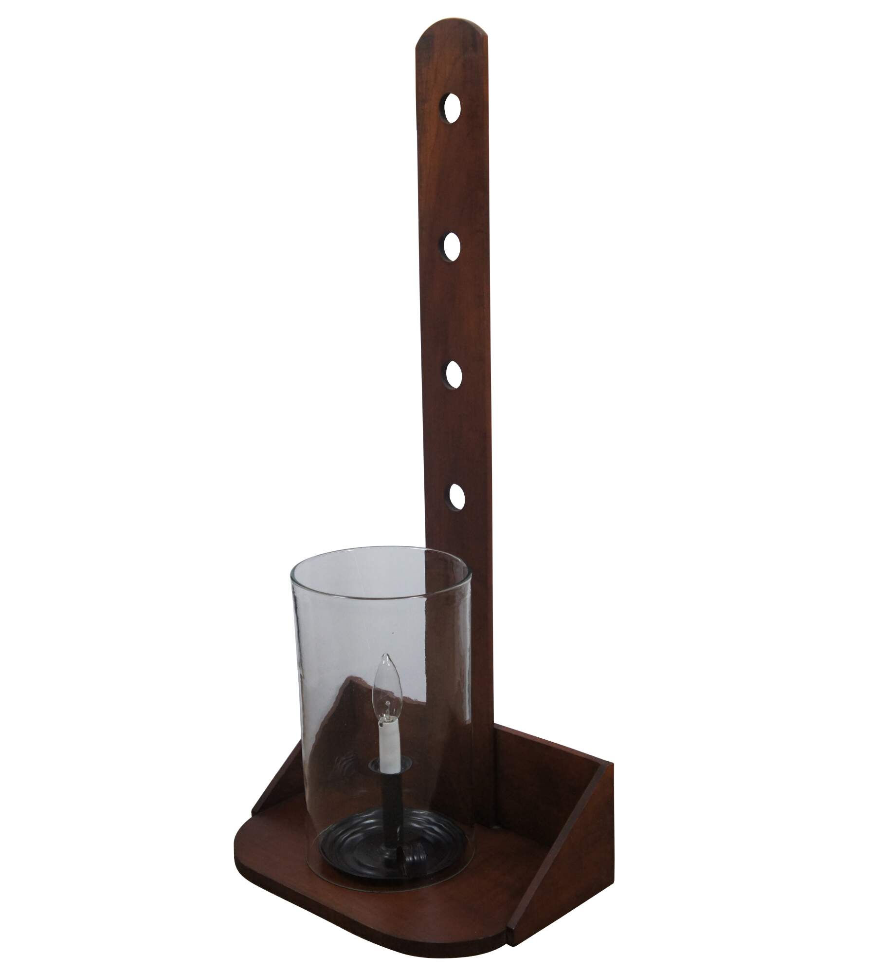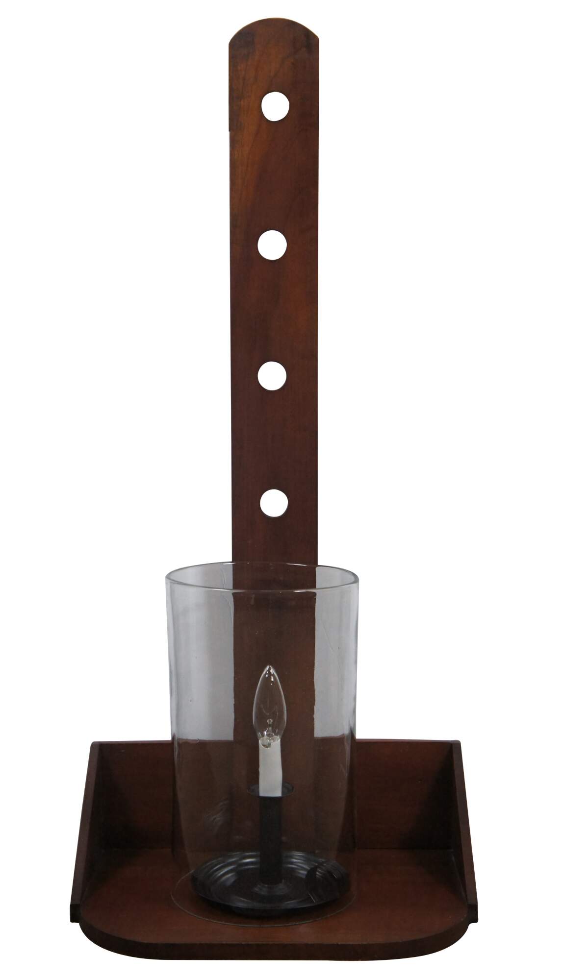 Large Early American Shaker style adjustable cherry wood peg rail wall sconces with candle shaped light fixtures and glass hurricane shades. Circa 1970s.
