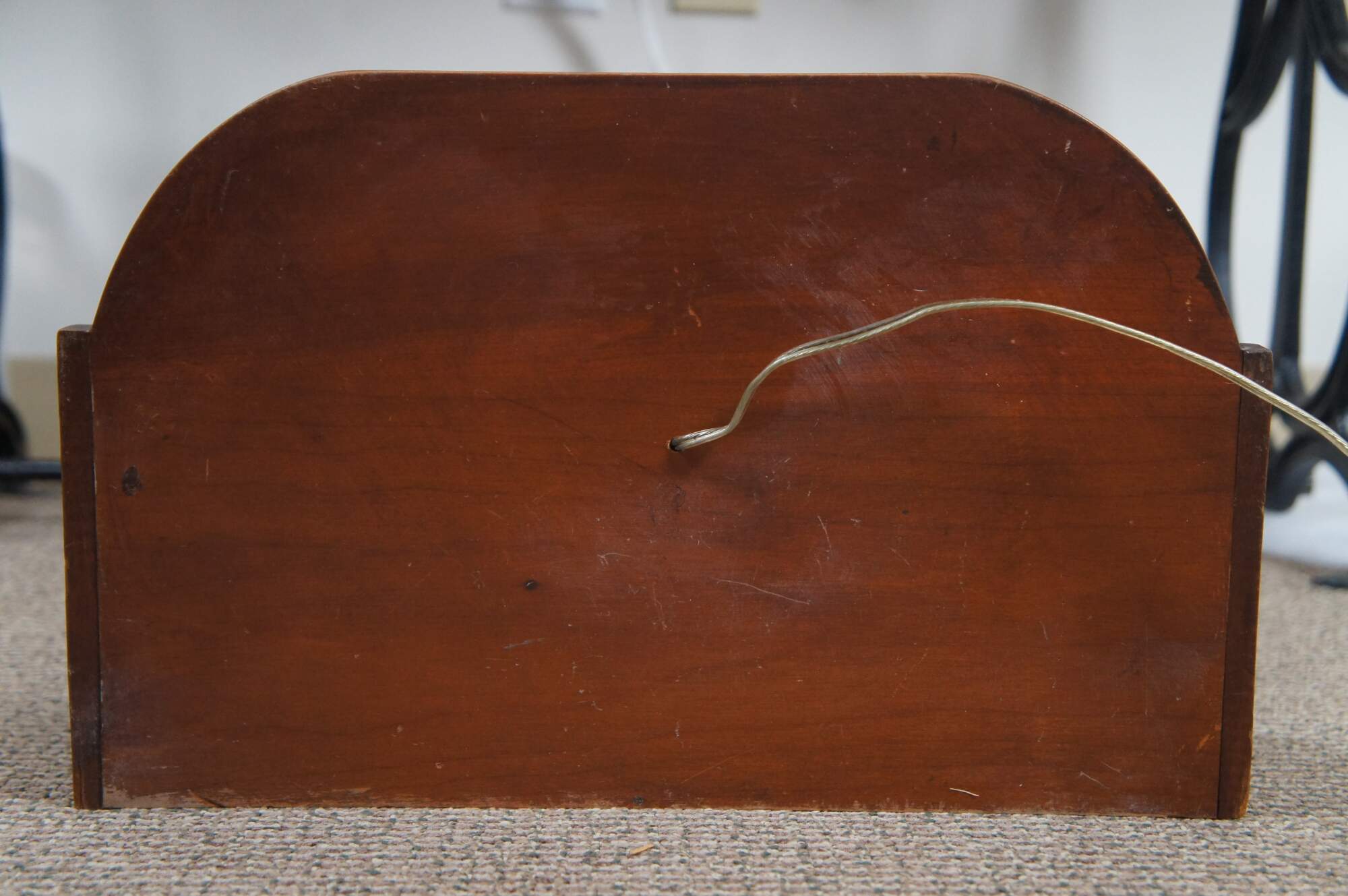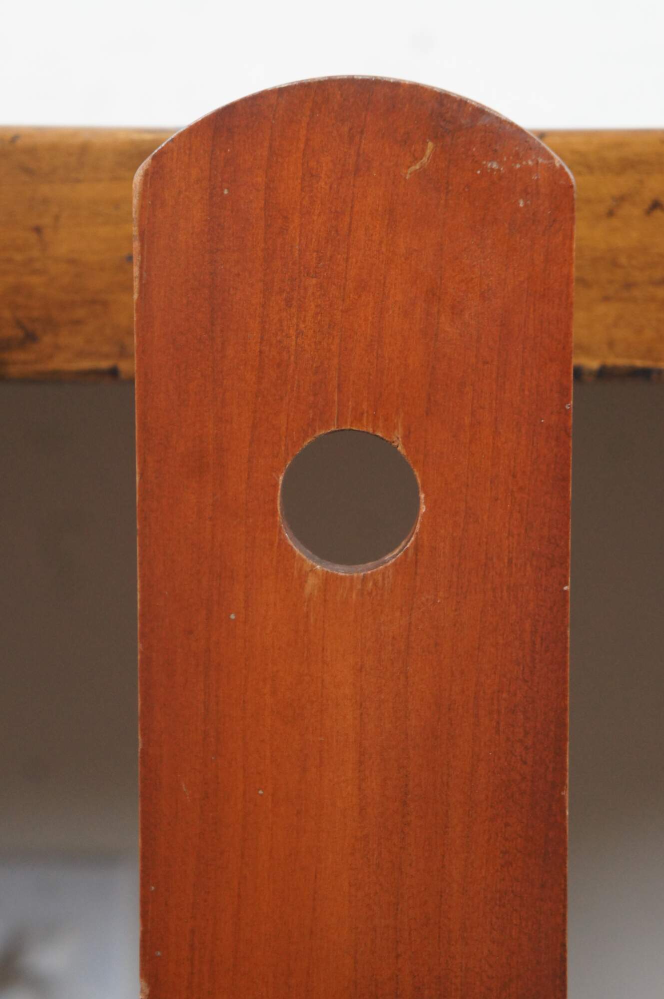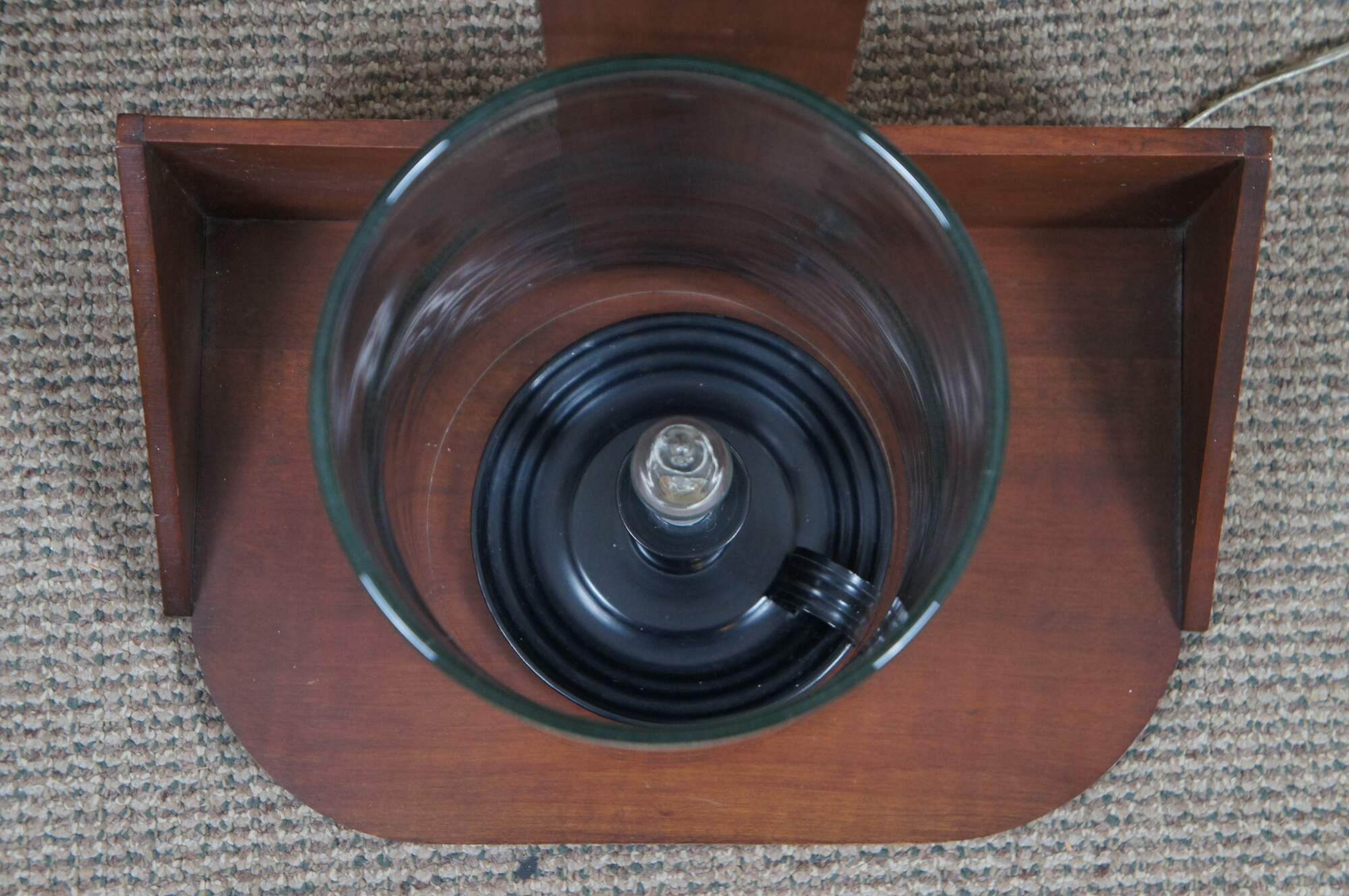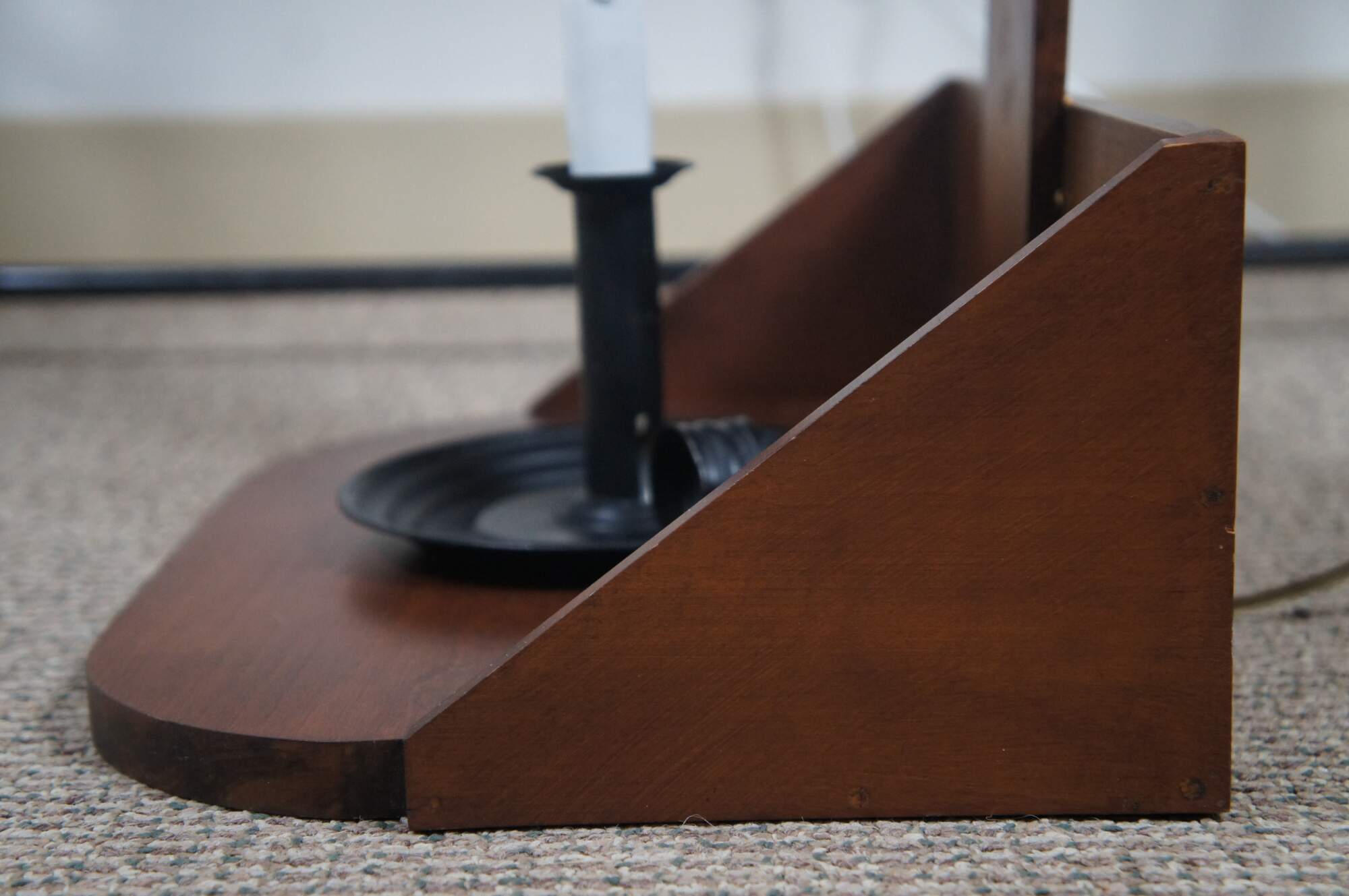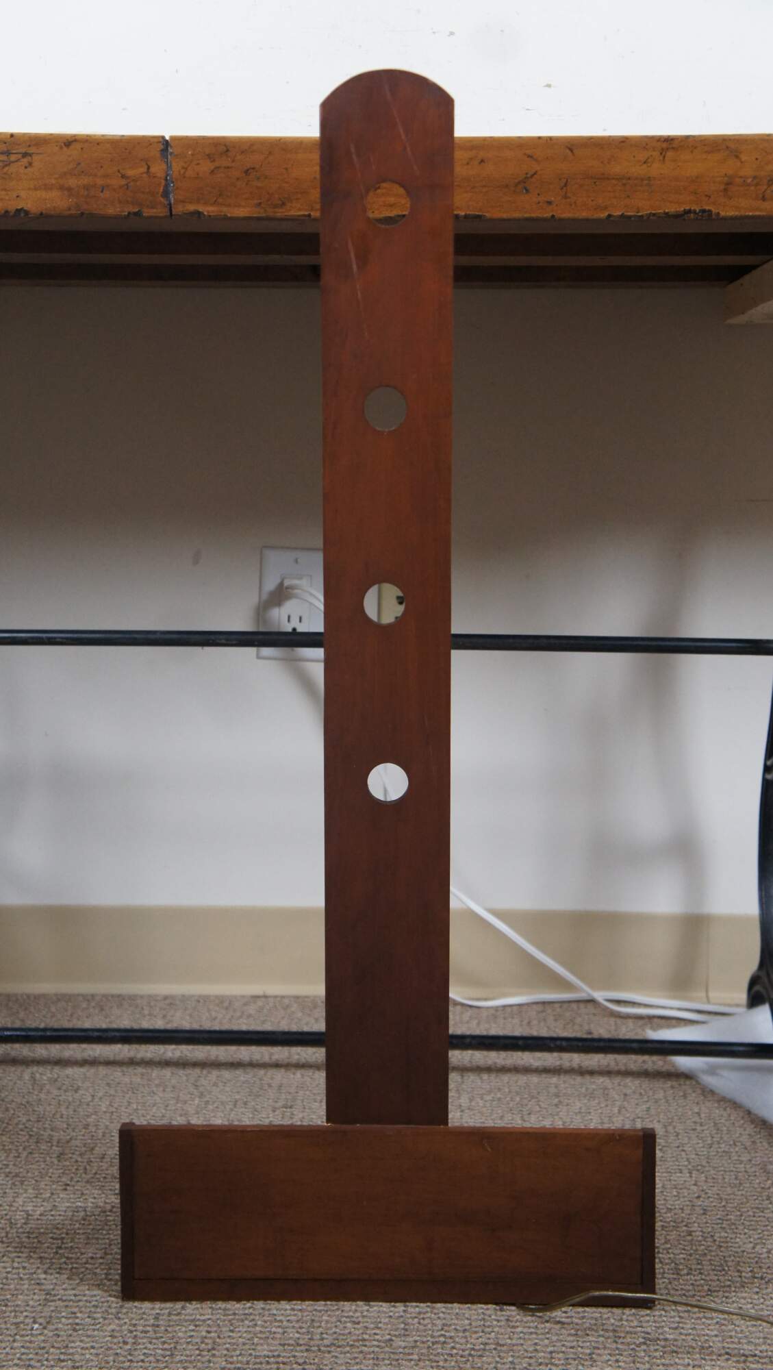 Large Early American Shaker style adjustable cherry wood peg rail wall sconces with candle shaped light fixtures and glass hurricane shades. Circa 1970s.