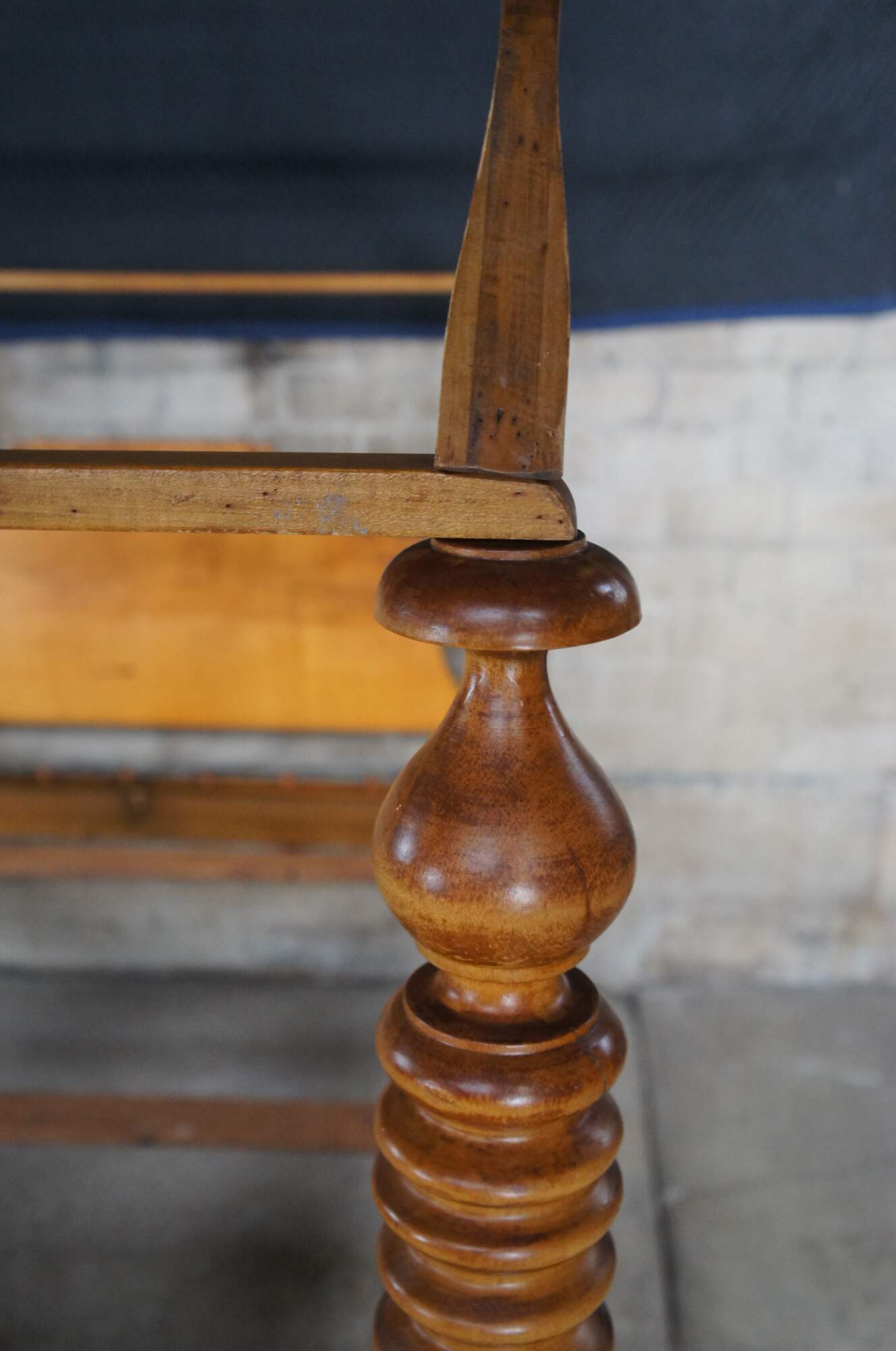 An impressive antique Jenny Lind rope / spool bed with canopy. Made from maple with turned and ribbed posts. The arched canopy can be removed for use without. The bed is supported by peg legs. A charming addition to any space.