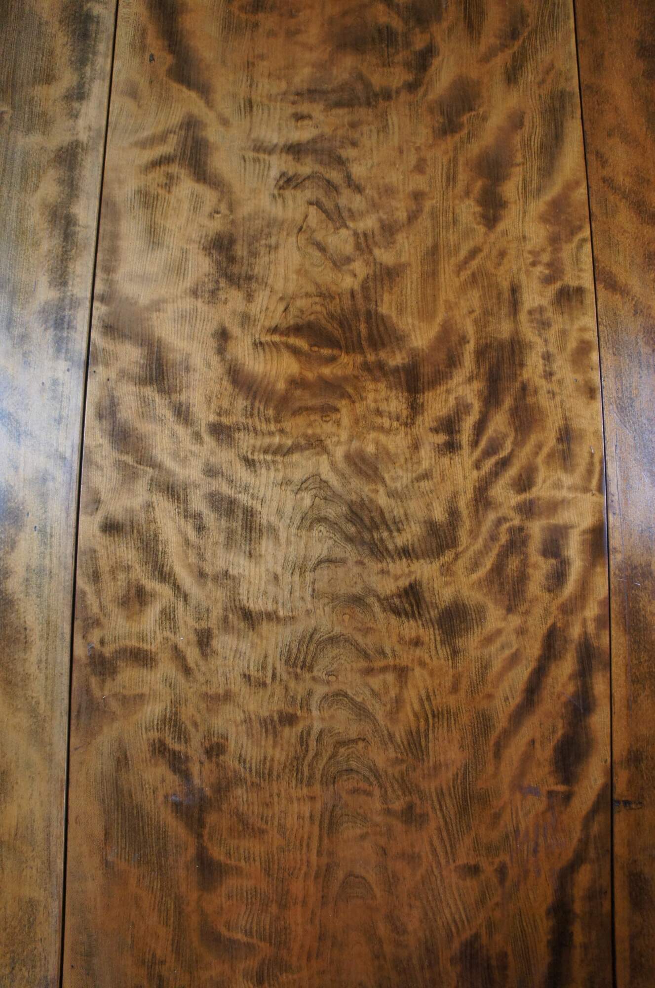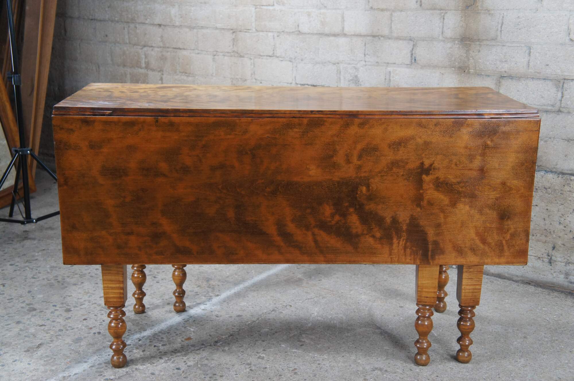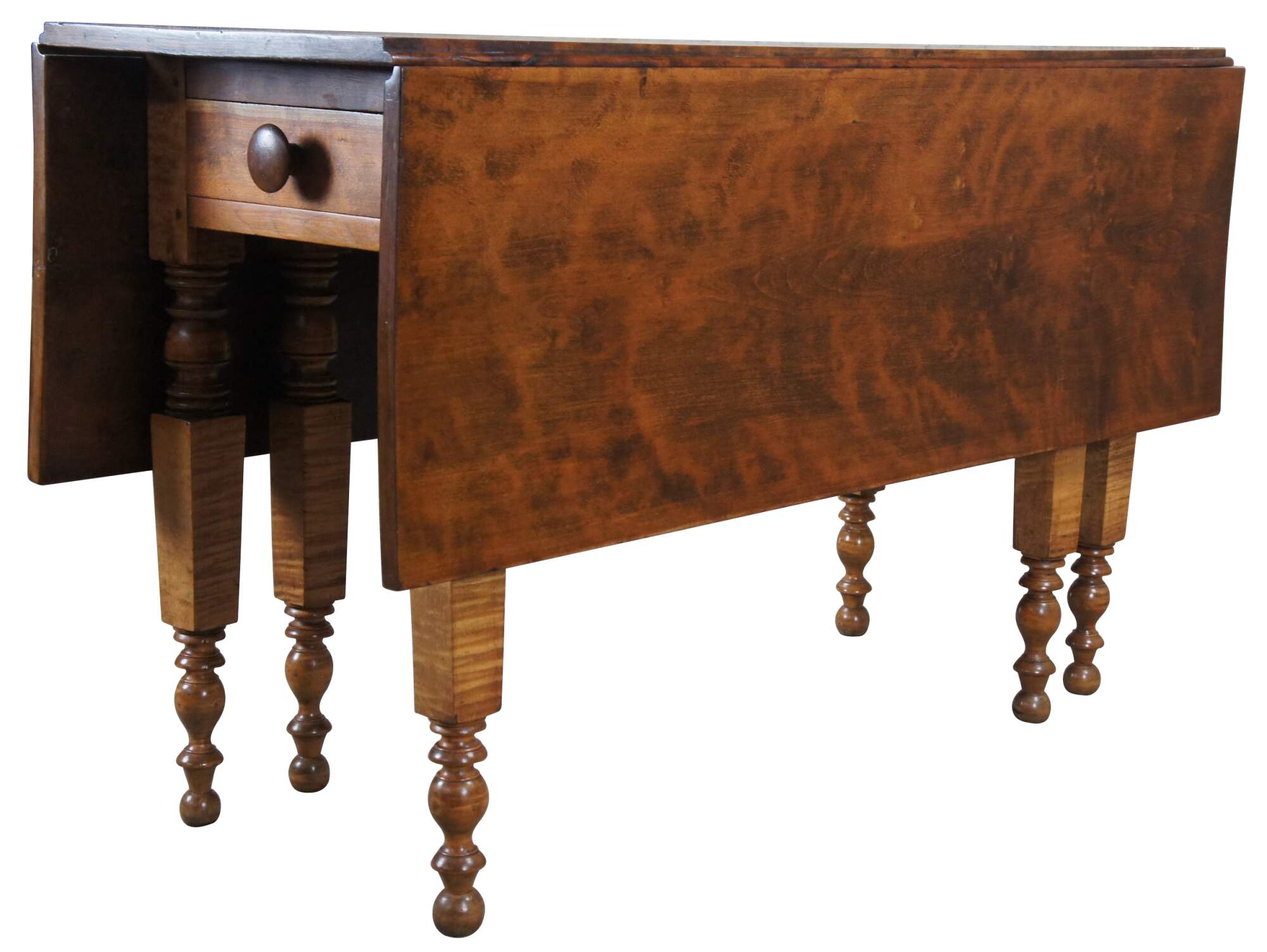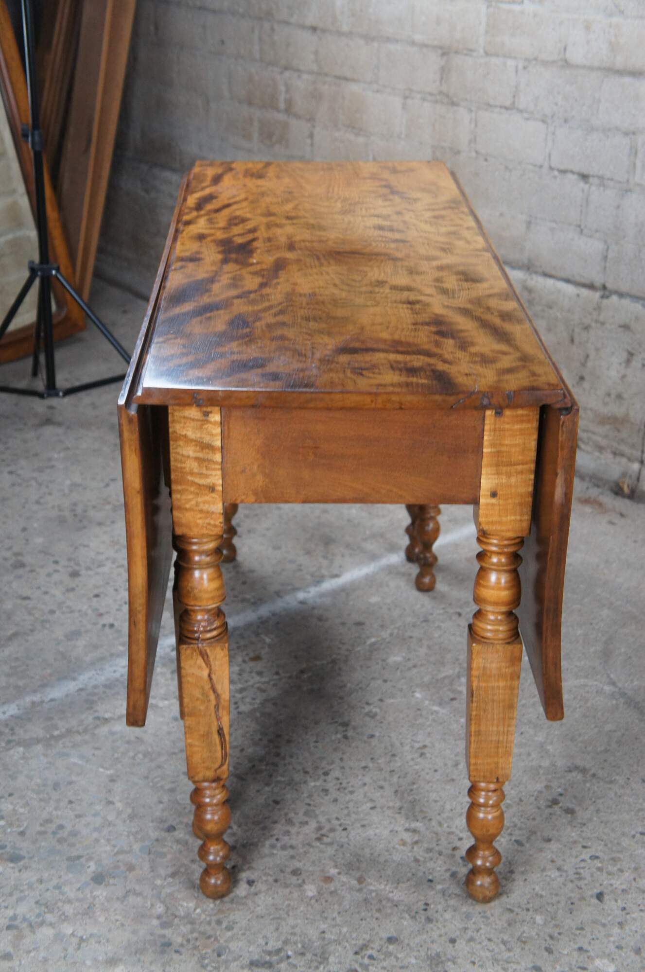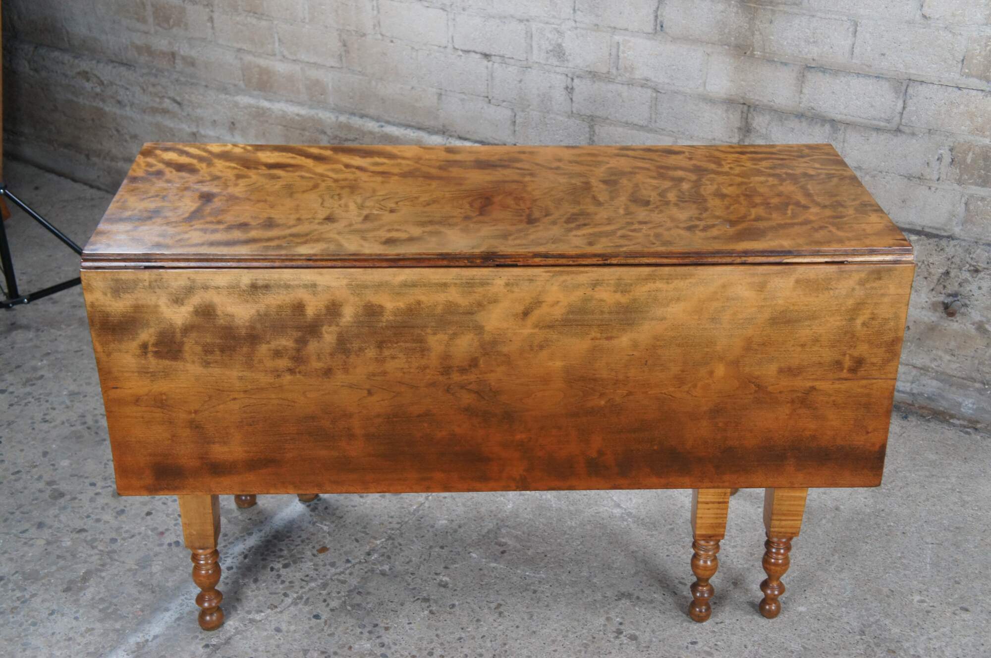 An impressive 19th century American gate leg table. Made from a beautiful curly (tiger) maple with hand turned legs and a drawer along the front. Great for use as a dining table or hallway console.