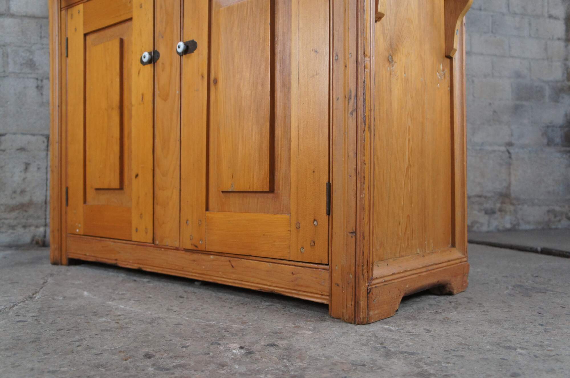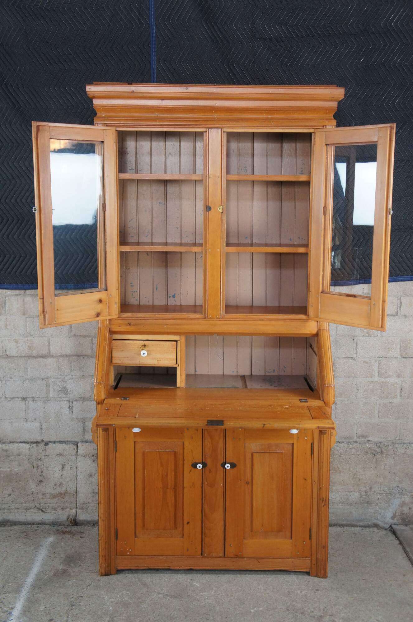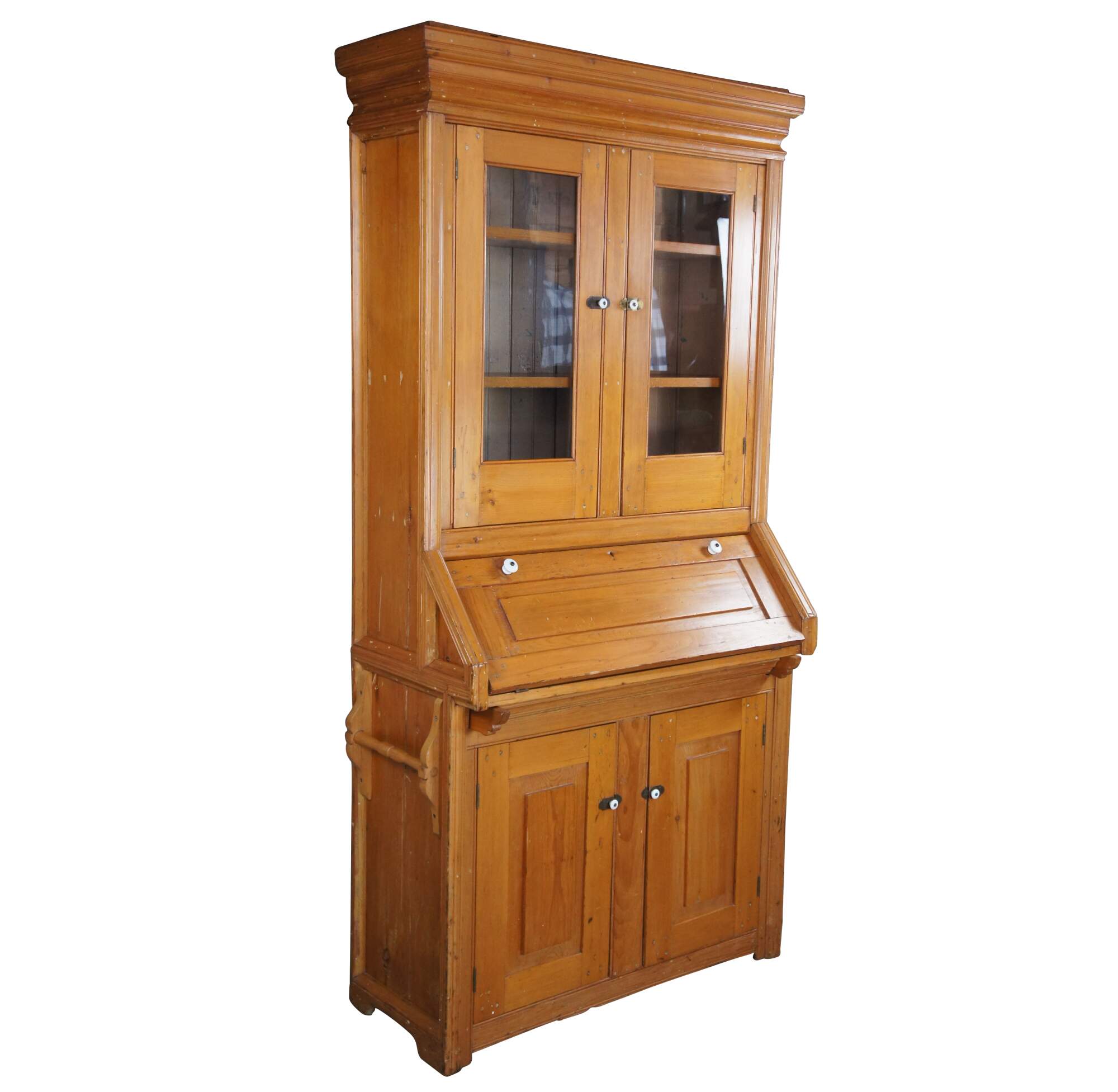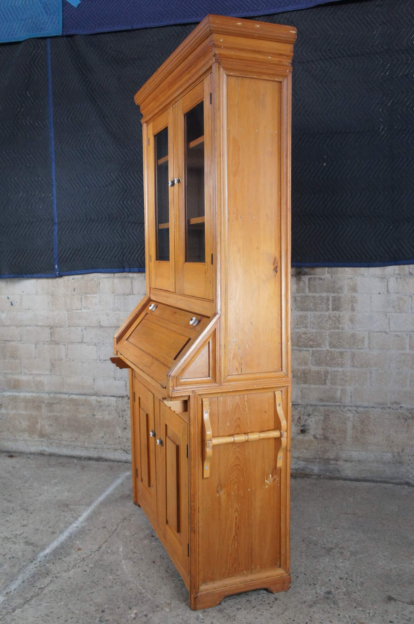 An early 20th century pine secretary desk or cupboard. Features an glass covered upper bookcase with two shelves, drop front writing surface with shelf and lower cabinet with shelf for accessory stoage Cabinet and door pulls are made from brass and porcelain. Towel bars fitted along each side.