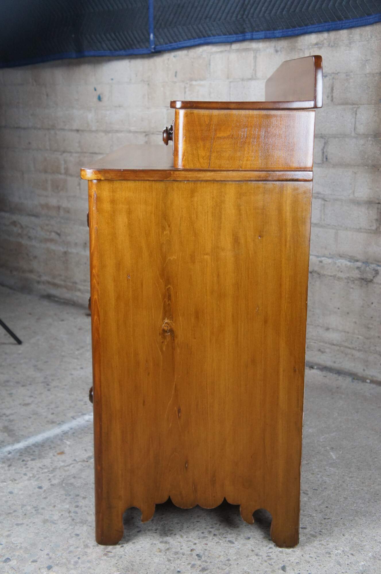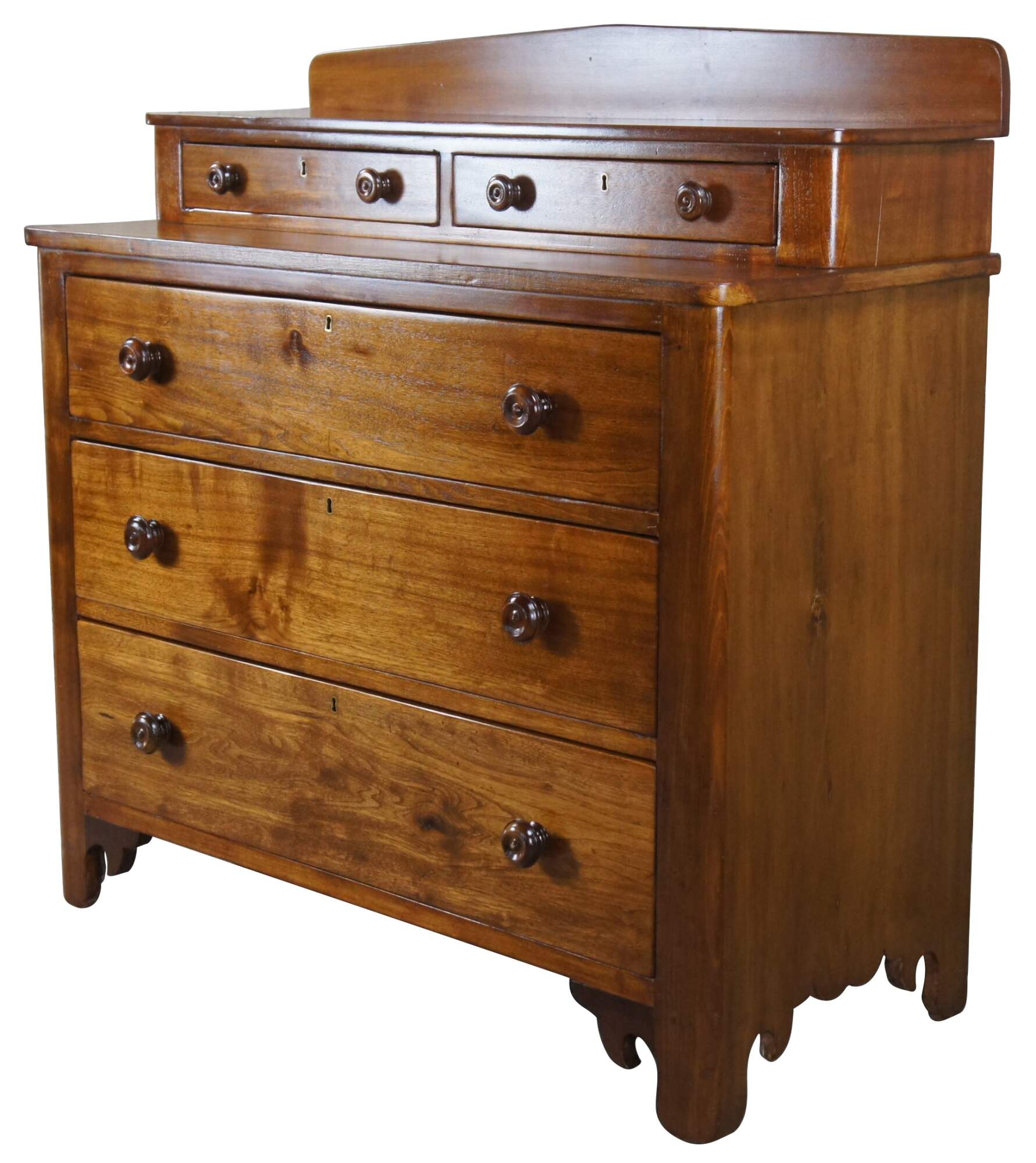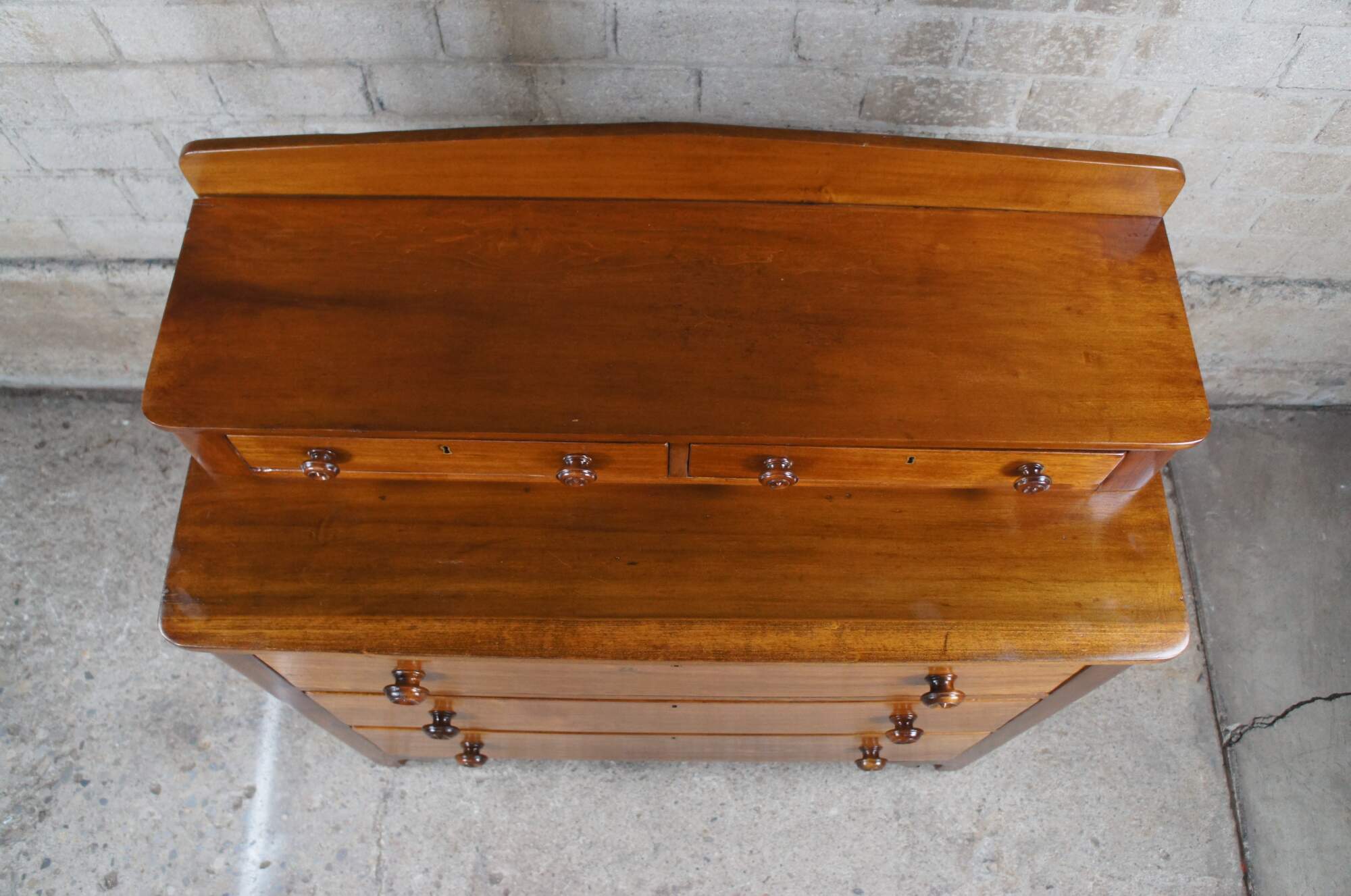 An eye catching American Victorian dresser, circa 1870s. A rectangular form made from walnut with an elegant step back design featuring two glove box or handkerchief drawers and a backsplash. Drawers are hand dovetailed with turned drawer pulls and brass key escutcheons. Lower aprons feature unique "C" scroll spandrels.