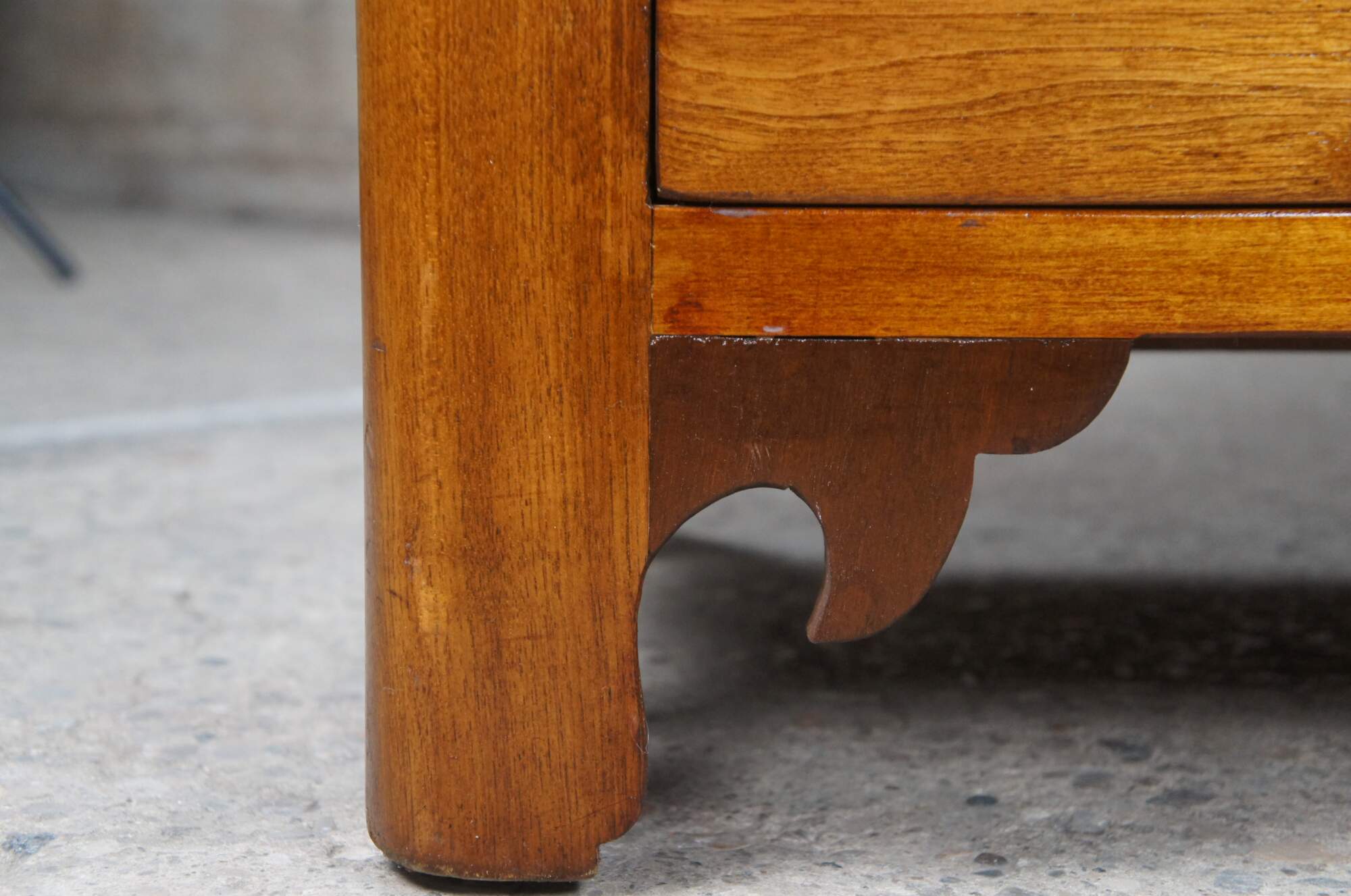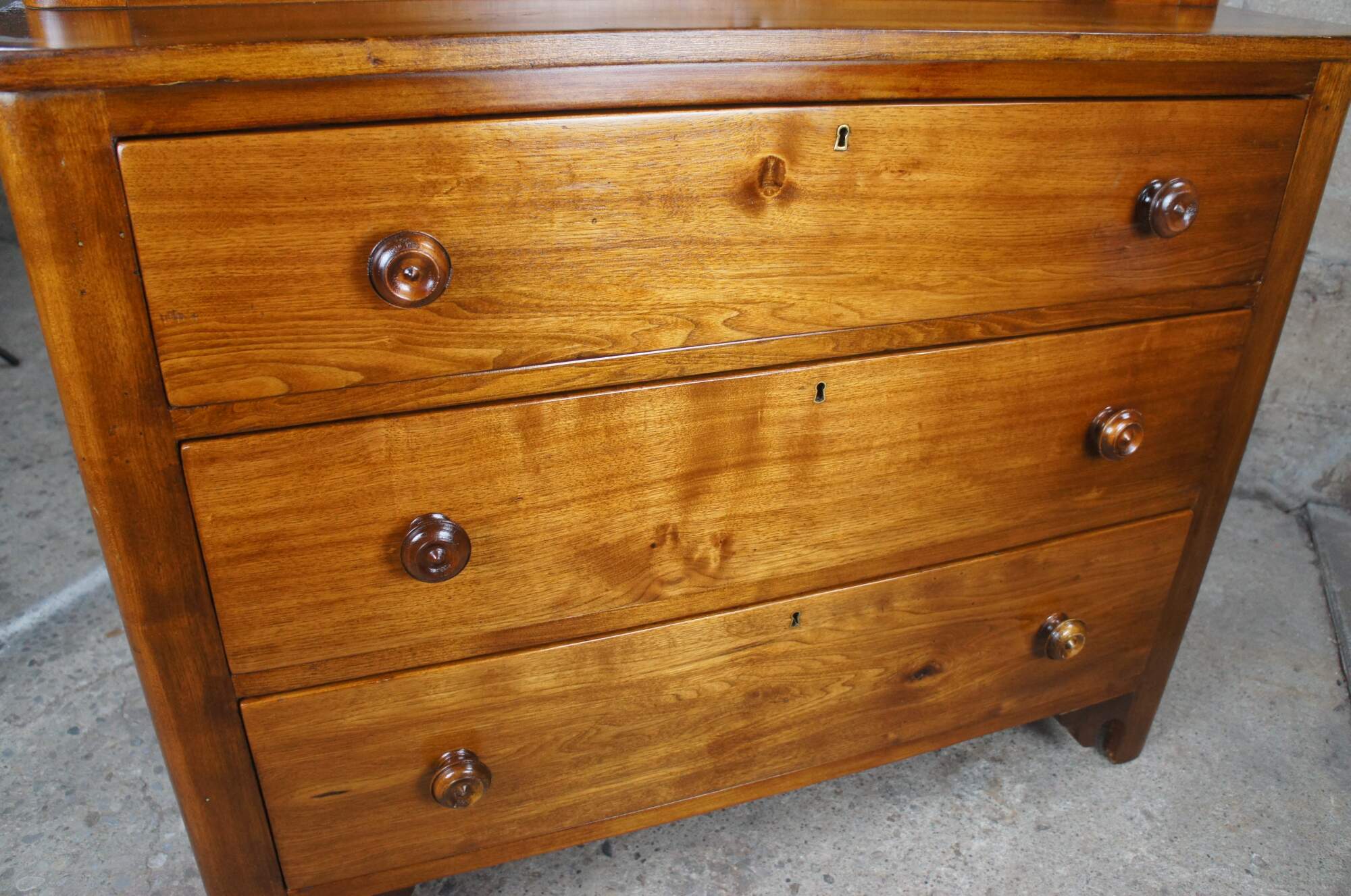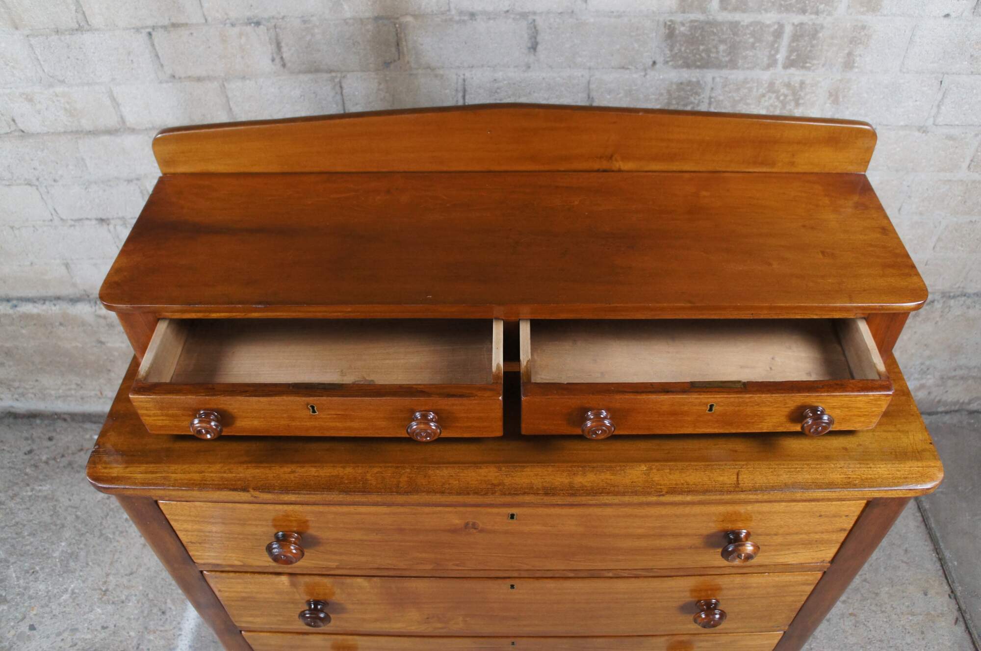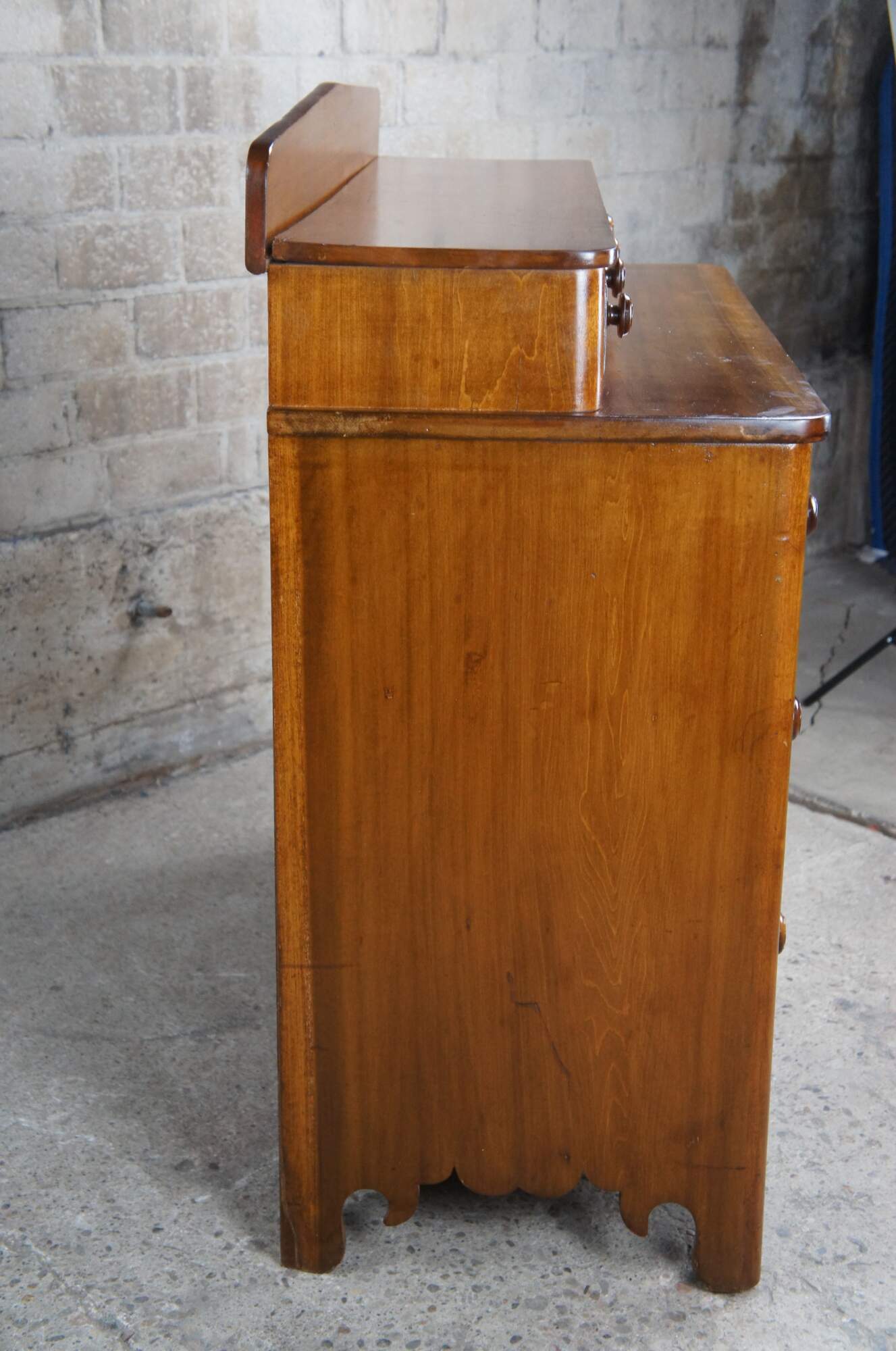 An eye catching American Victorian dresser, circa 1870s. A rectangular form made from walnut with an elegant step back design featuring two glove box or handkerchief drawers and a backsplash. Drawers are hand dovetailed with turned drawer pulls and brass key escutcheons. Lower aprons feature unique "C" scroll spandrels.