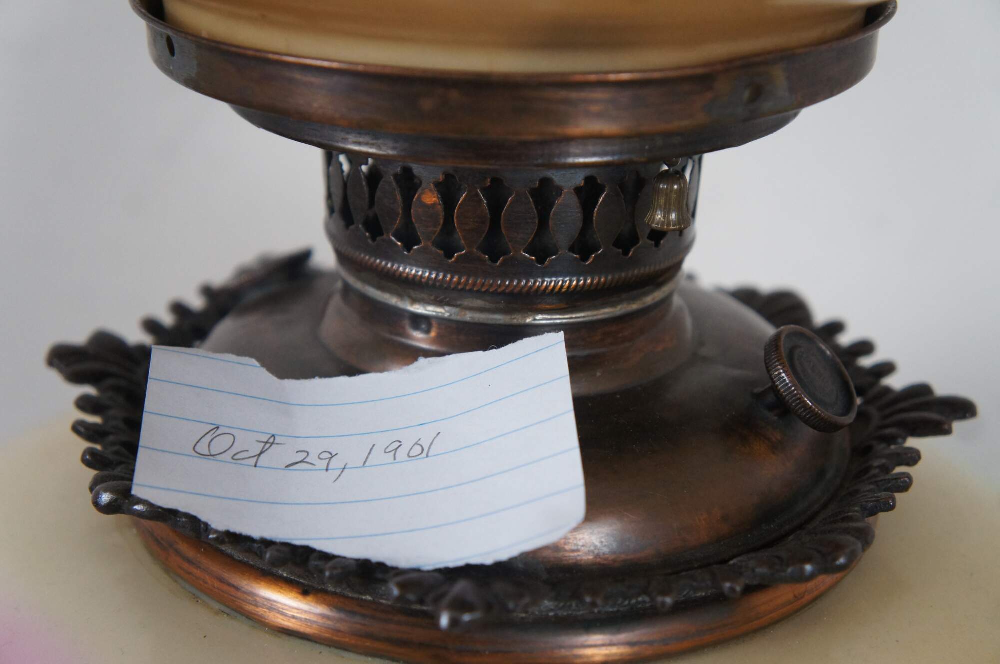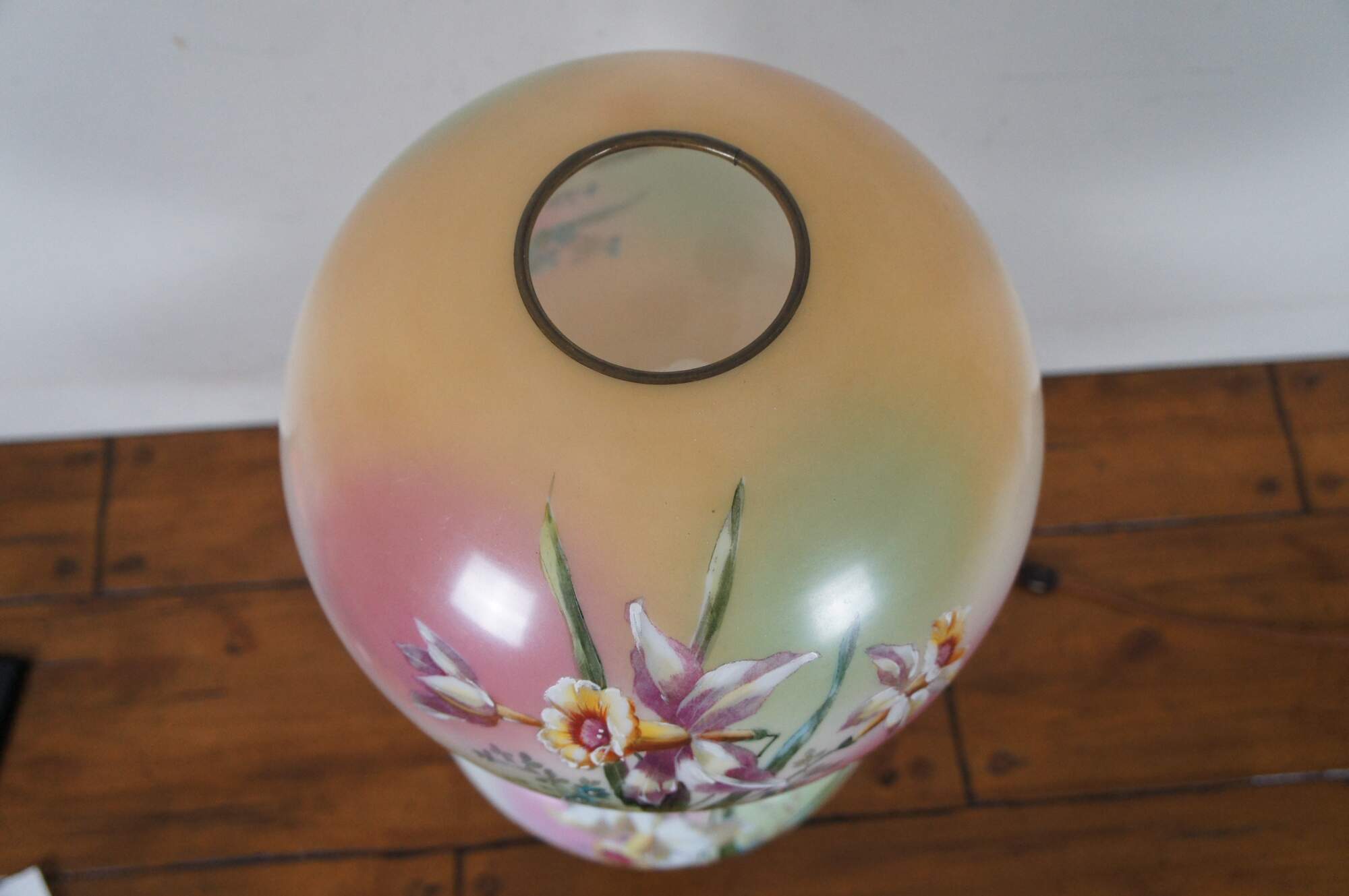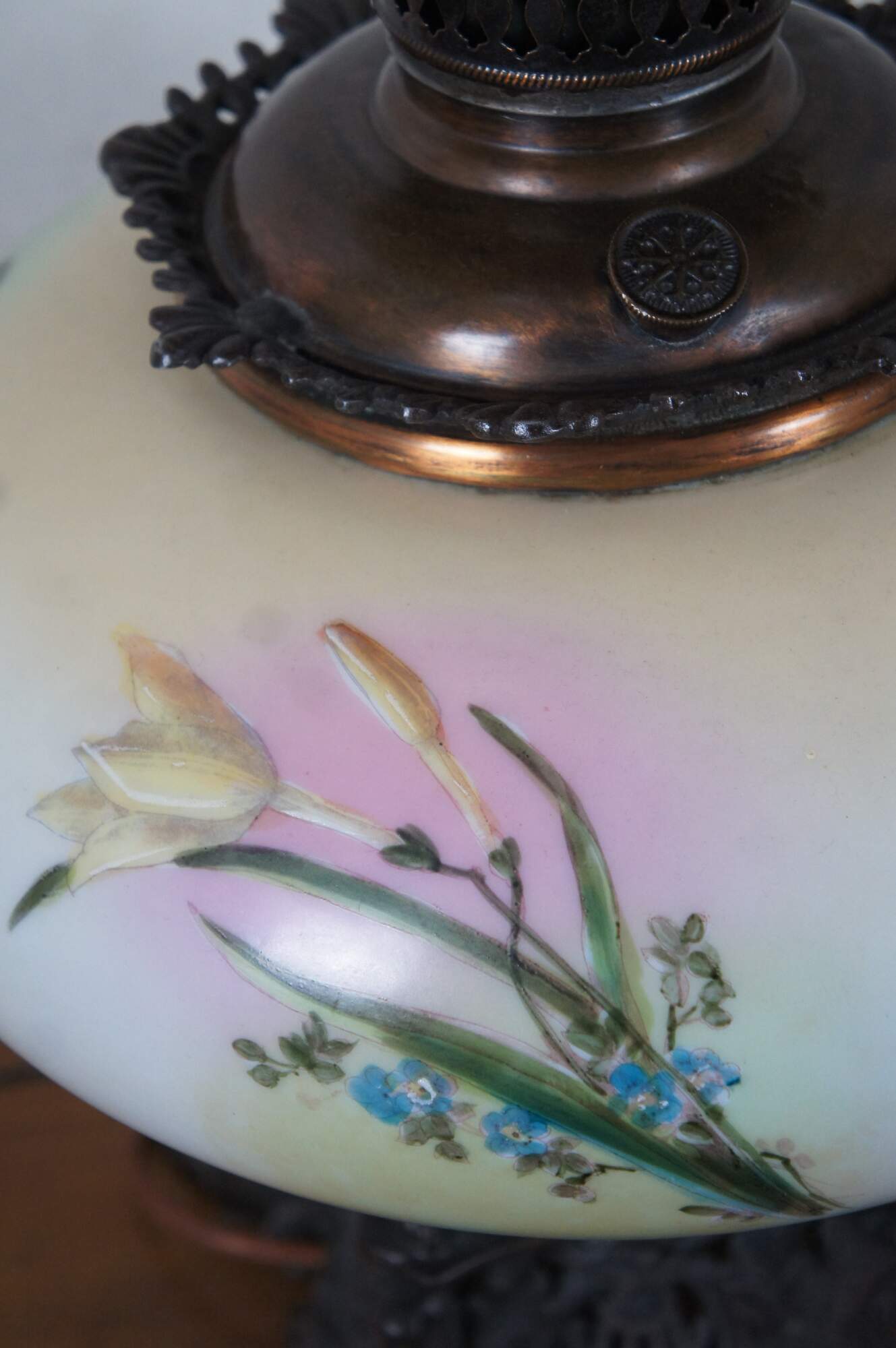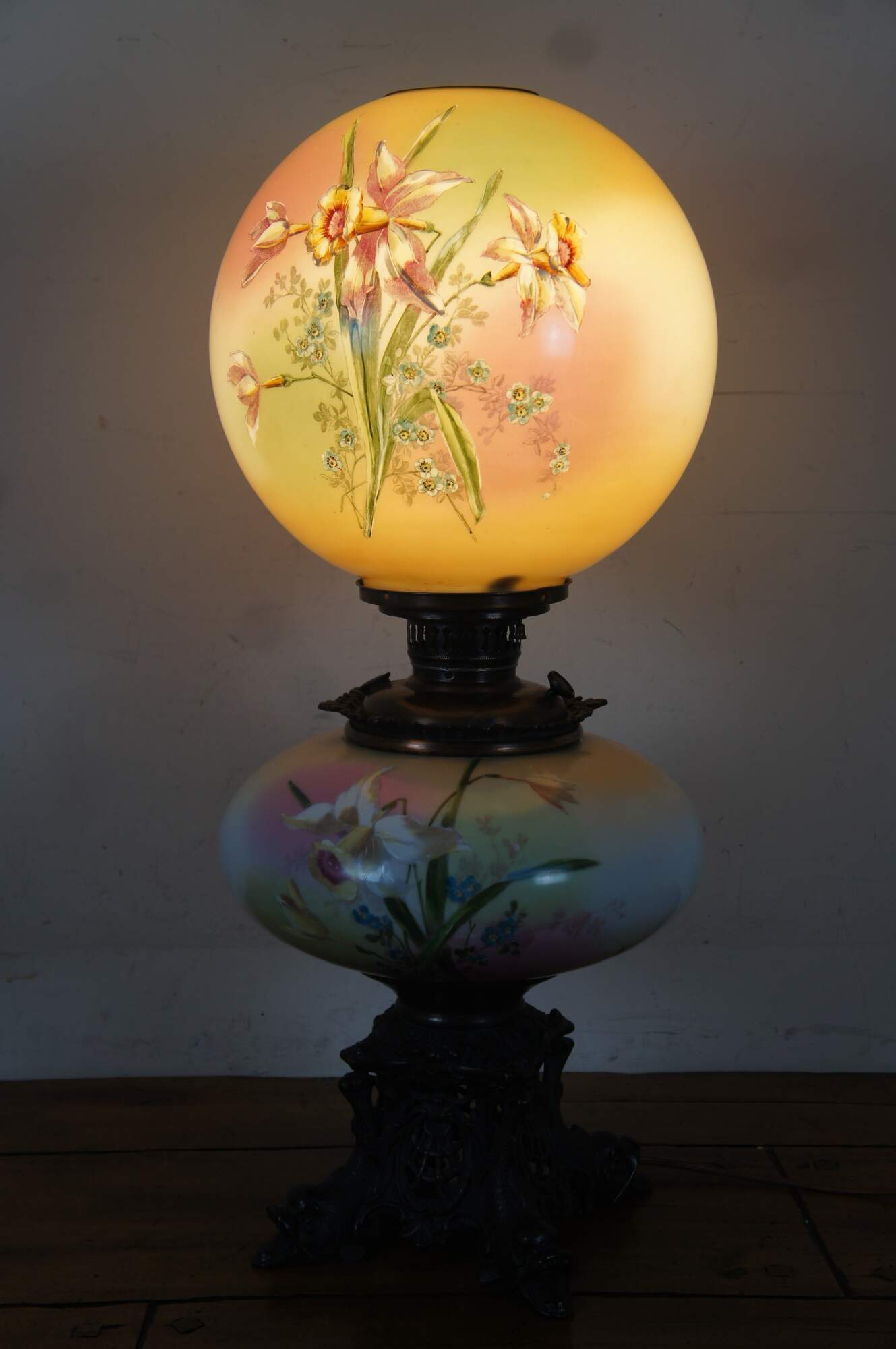 Antique Victorian double globe Gone with the Wind (converted electric) oil lamp featuring an intricate pedestal base with neoclassical dolphins / delphins forming the corners and large fully painted globes in pink, green, and yellow with lilies and forget-me-nots. Knob on reservoir reads Made in American Pat. Aug. 8, 18--. Slip of paper included with lamp suggests a date of Oct. 29, 1901.