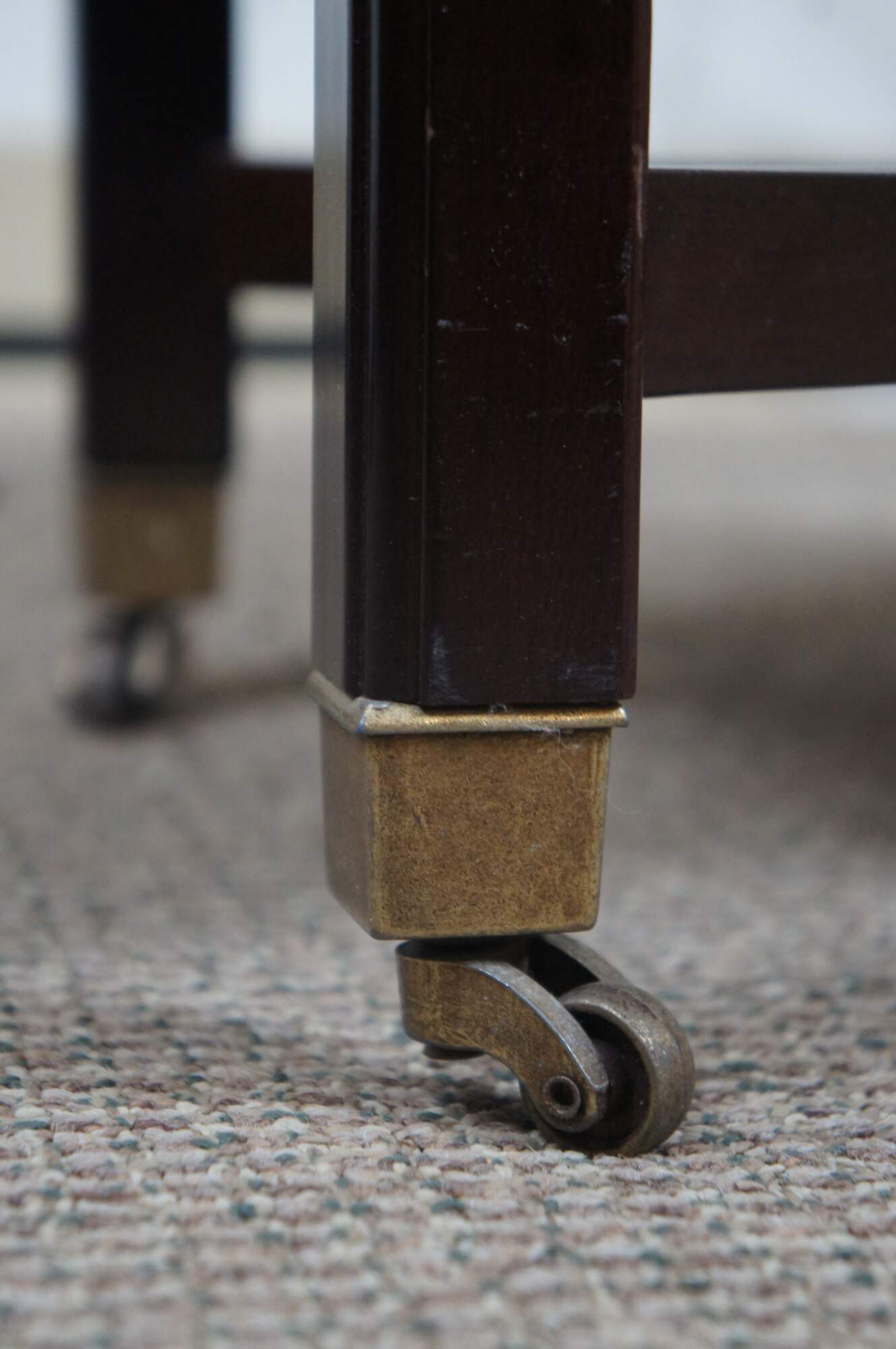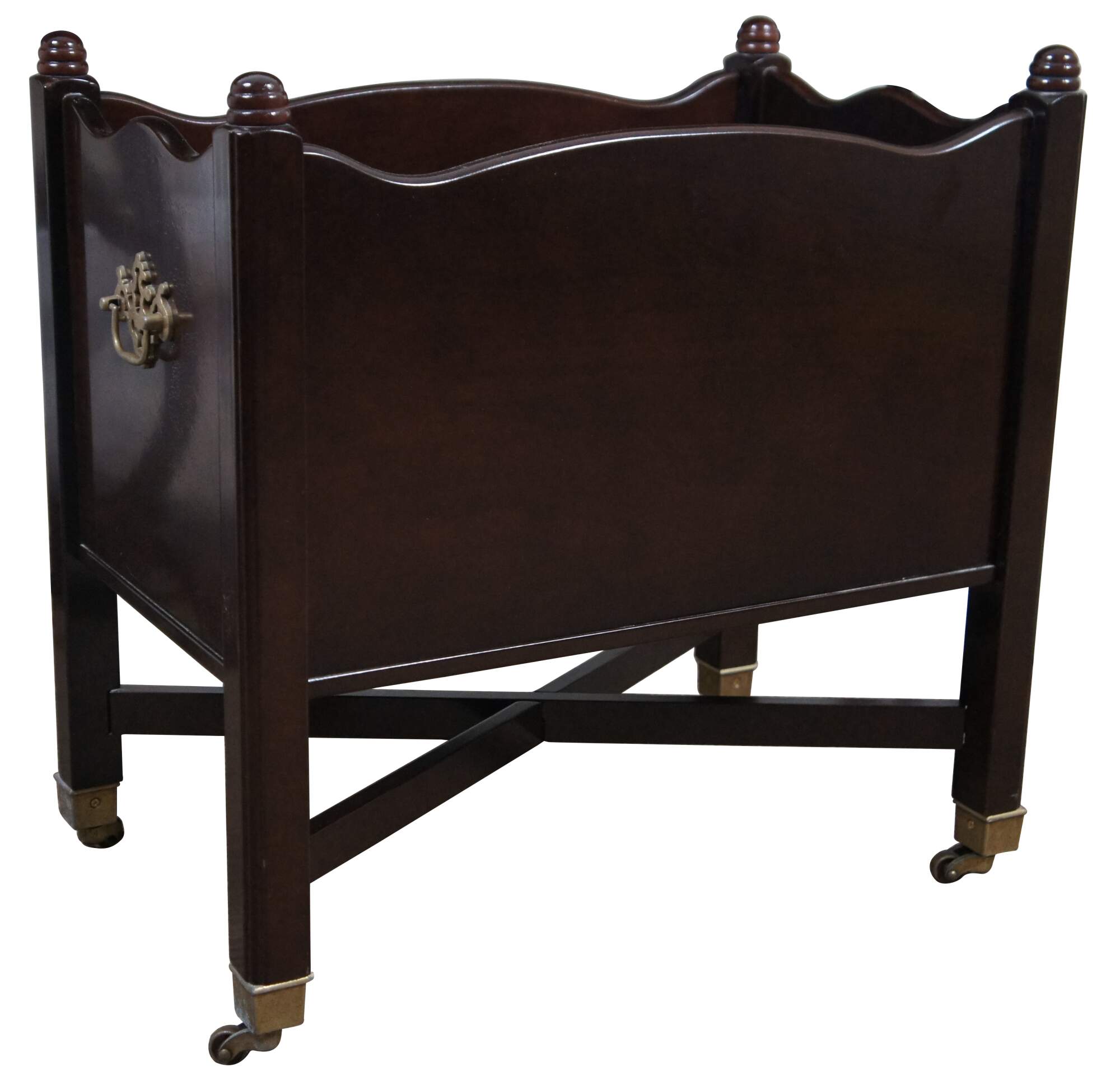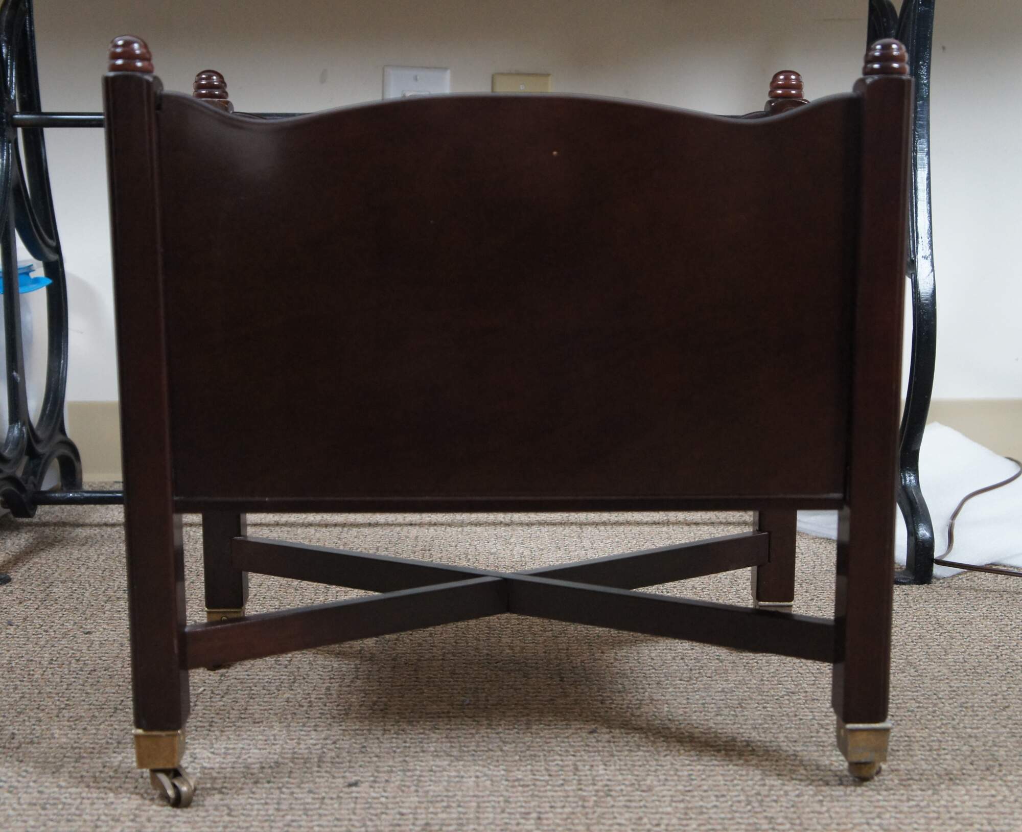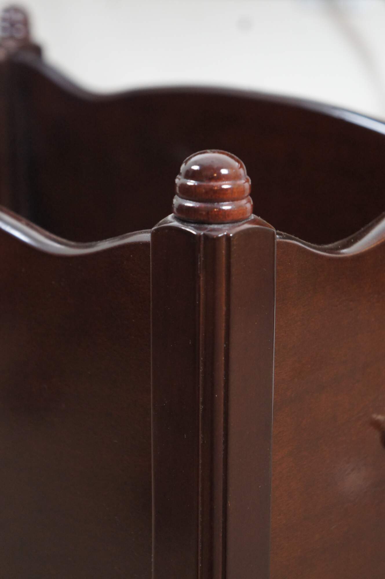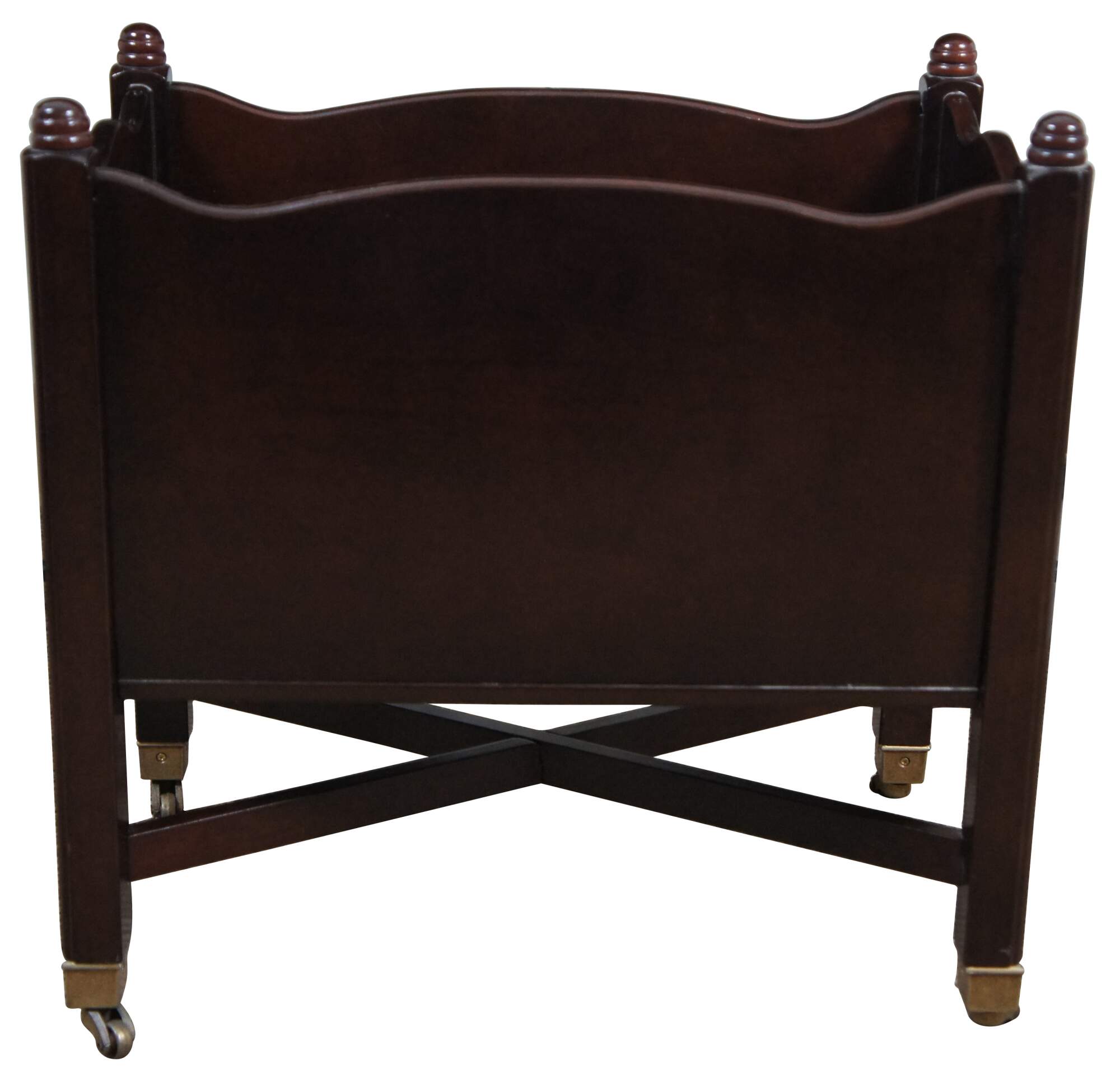 Chippendale style Bombay Company Canterbury mahogany magazine / newspaper storage rack with brass handles, castors, and single interior divider.