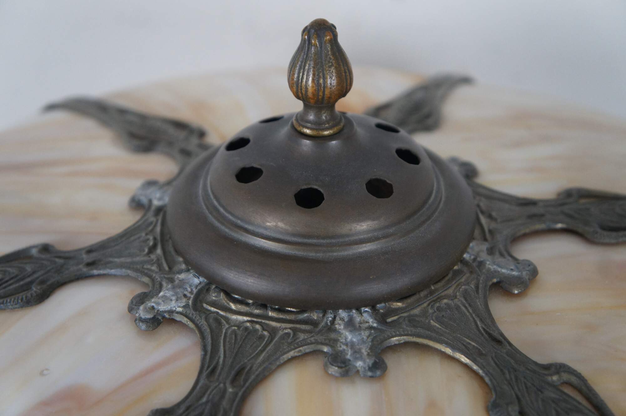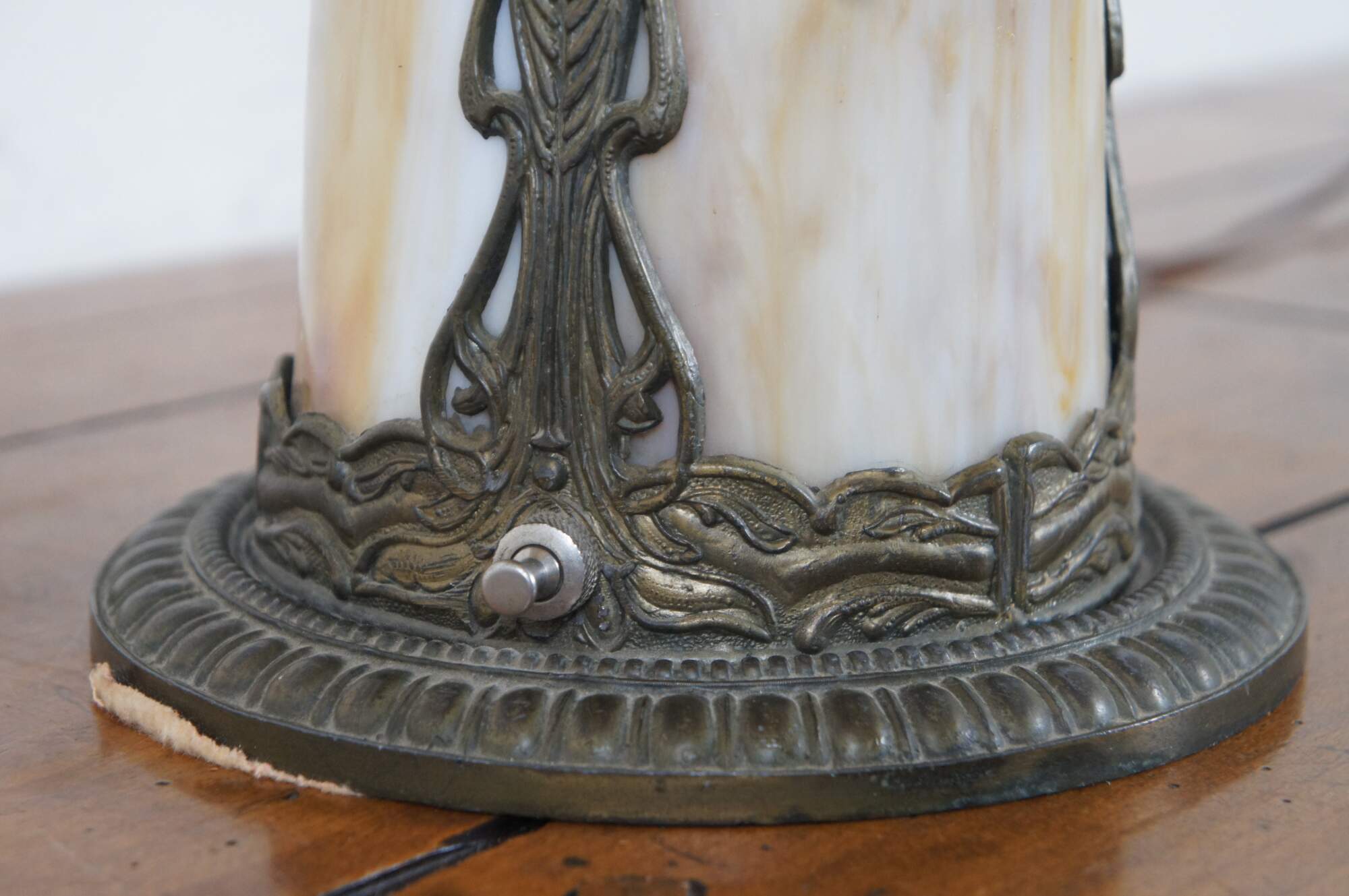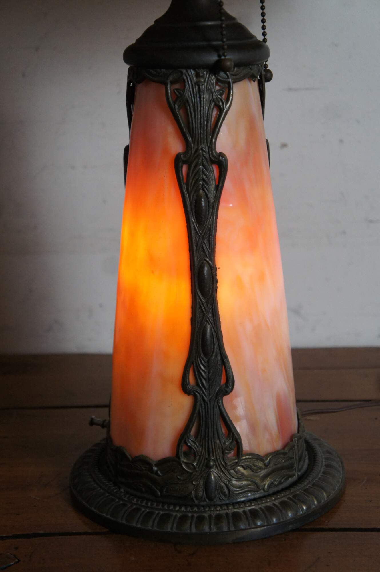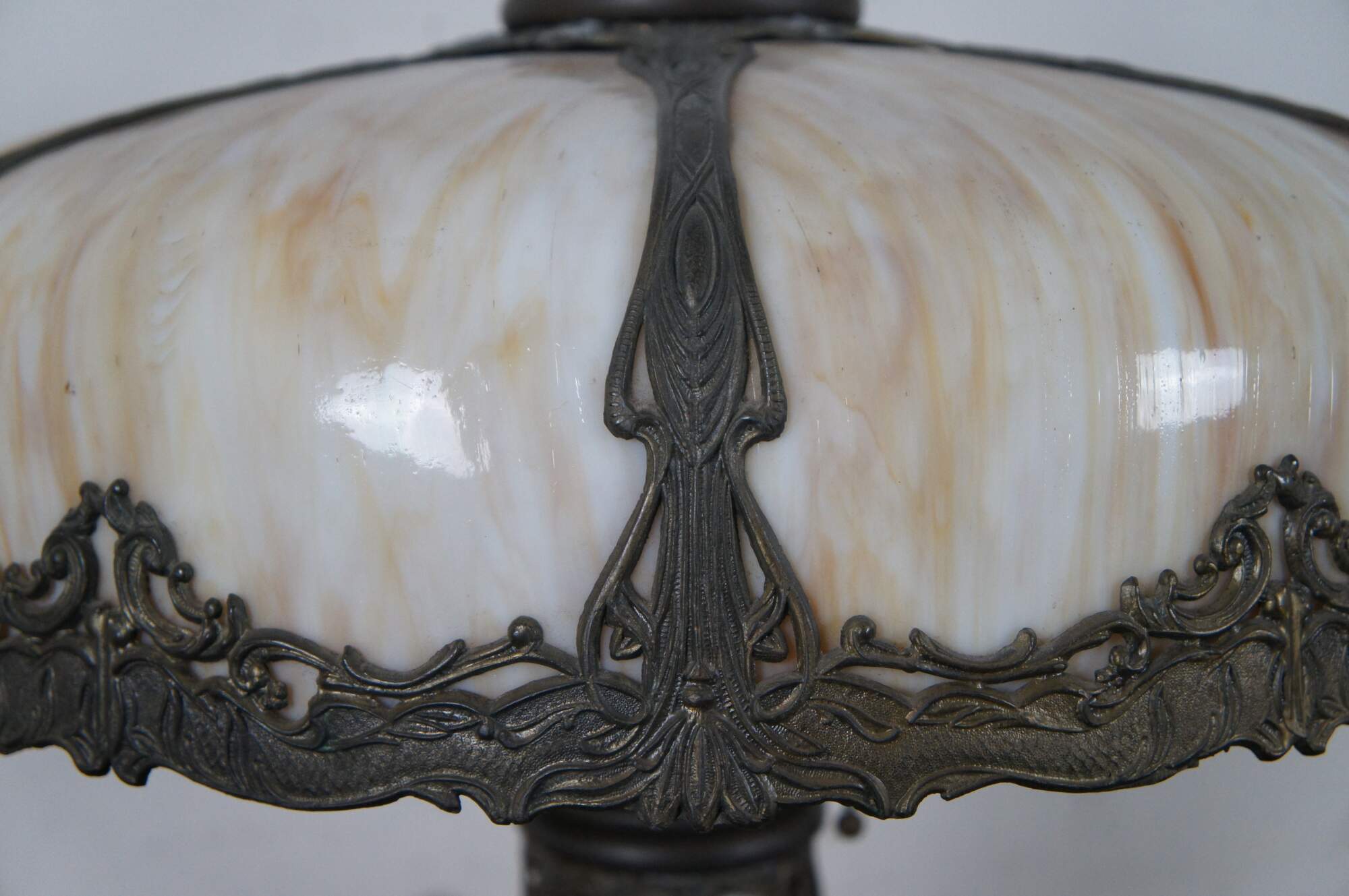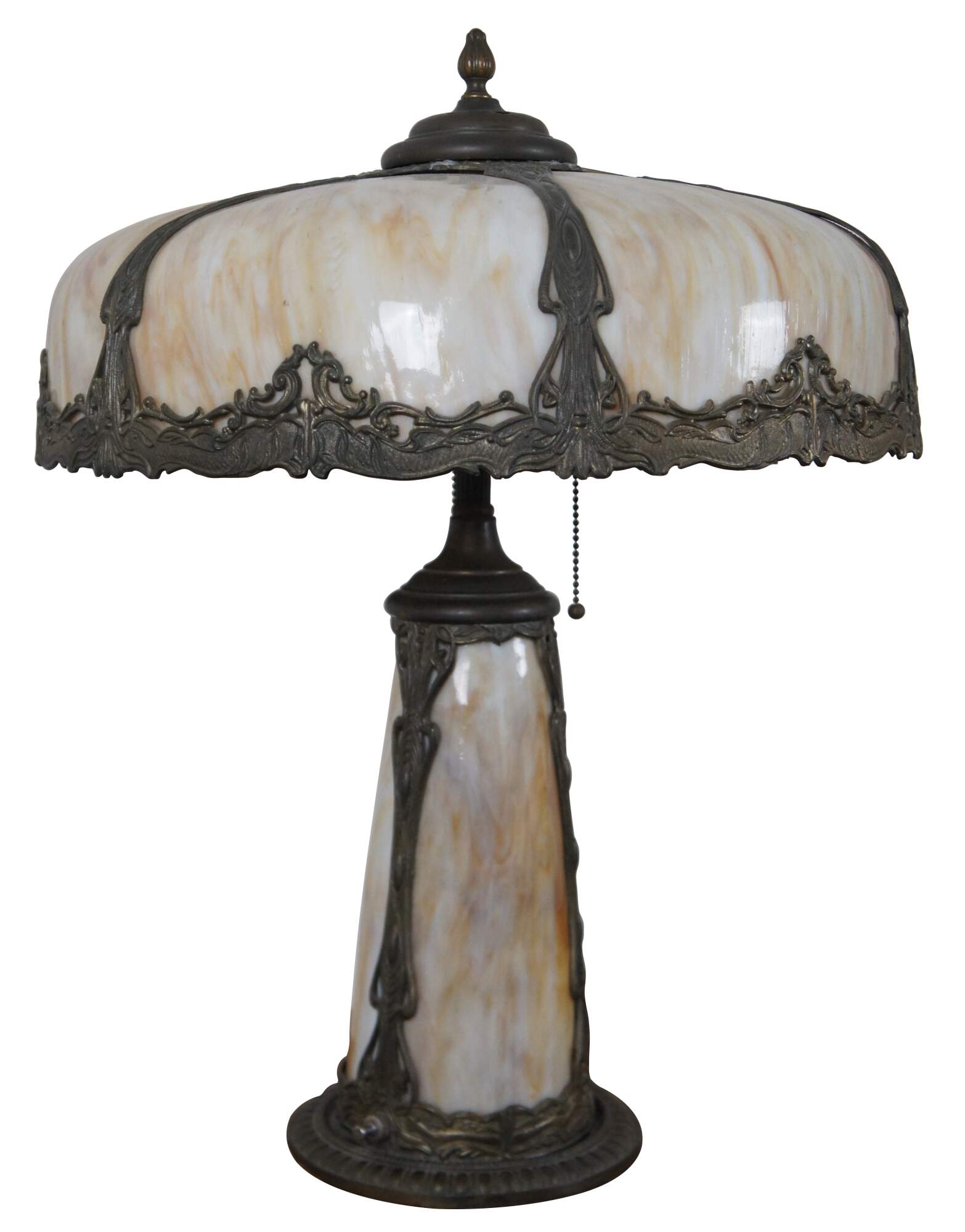 Early 20th century art nouveau style white and salmon slag glass parlor / library / table lamp with illuminating base and two light top under an umbrella / mushroom shaped shade. Separate switches allow upper portion and base to be illuminated independently.